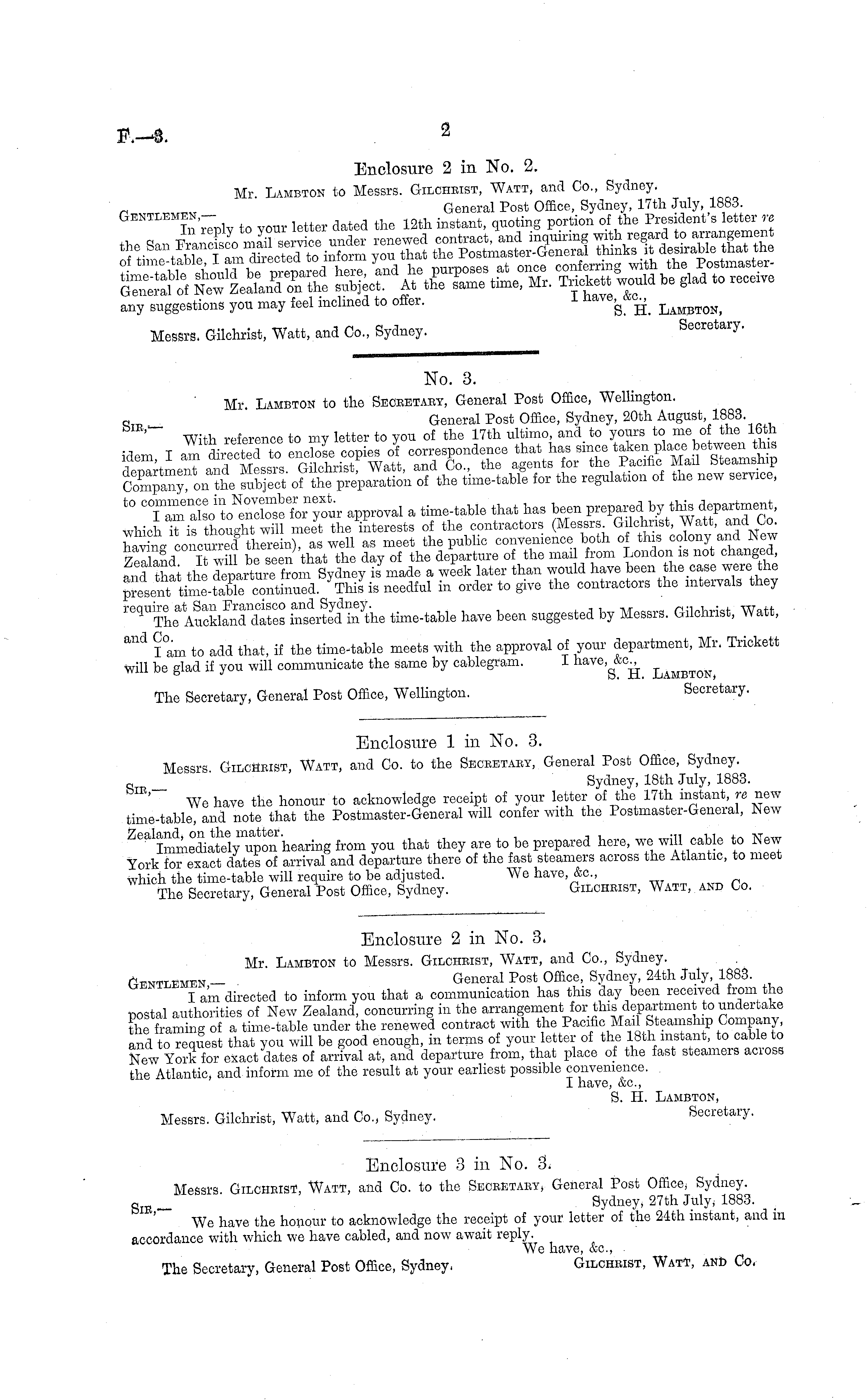 Enclosure 2 in No. 3. Mr. Lambton to Messrs. Gilchrist, Watt, and Co., Sydney. Cfntlemen — General Post Office, Sydney, 24th July 1883. I aim directed to inform you that a communication has this day been received from the postal authorities of New Zealand, concurring in the arrangement for this department to undertake the framing of a time-table under the renewed contract with the Pacific Mail Steamship Company, and to request that you will be good enough, in terms of your letter of the 18th instant, to cable to New York for exact dates of arrival at, and departure from, that place of the fast steamers across the Atlantic, and inform me of the result at your earliest possible convenience. I have, &c, S. H. Lambton, Messrs. Gilchrist, Watt, and Co., Sydney. Secretary.