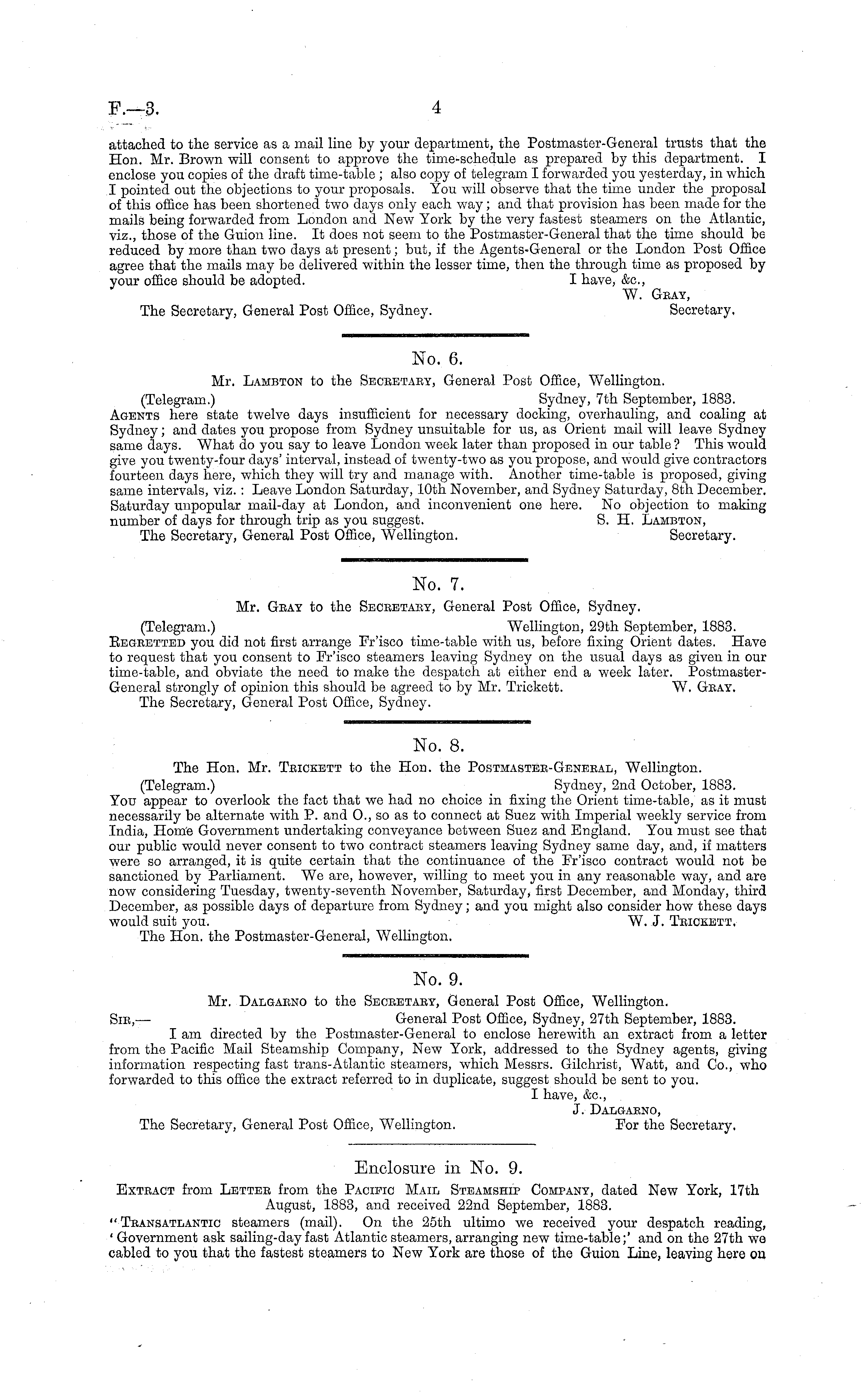 No. 9. Mr. Dalgarno to the Secretary, General Post Office, Wellington. Sir, — General Post Office, Sydney, 27th September, 1883. I am directed by the Postmaster-General to enclose herewith an extract from a letter from the Pacific Mail Steamship Company, New York, addressed to the Sydney agents, giving information respecting fast trans-Atlantic steamers, which Messrs. Gilchrist, Watt, and Co., who forwarded to this office the extract referred to in duplicate, suggest should be sent to you. I have, &c, J. Dalgarno, The Secretary, General Post Office, Wellington. For the Secretary.
