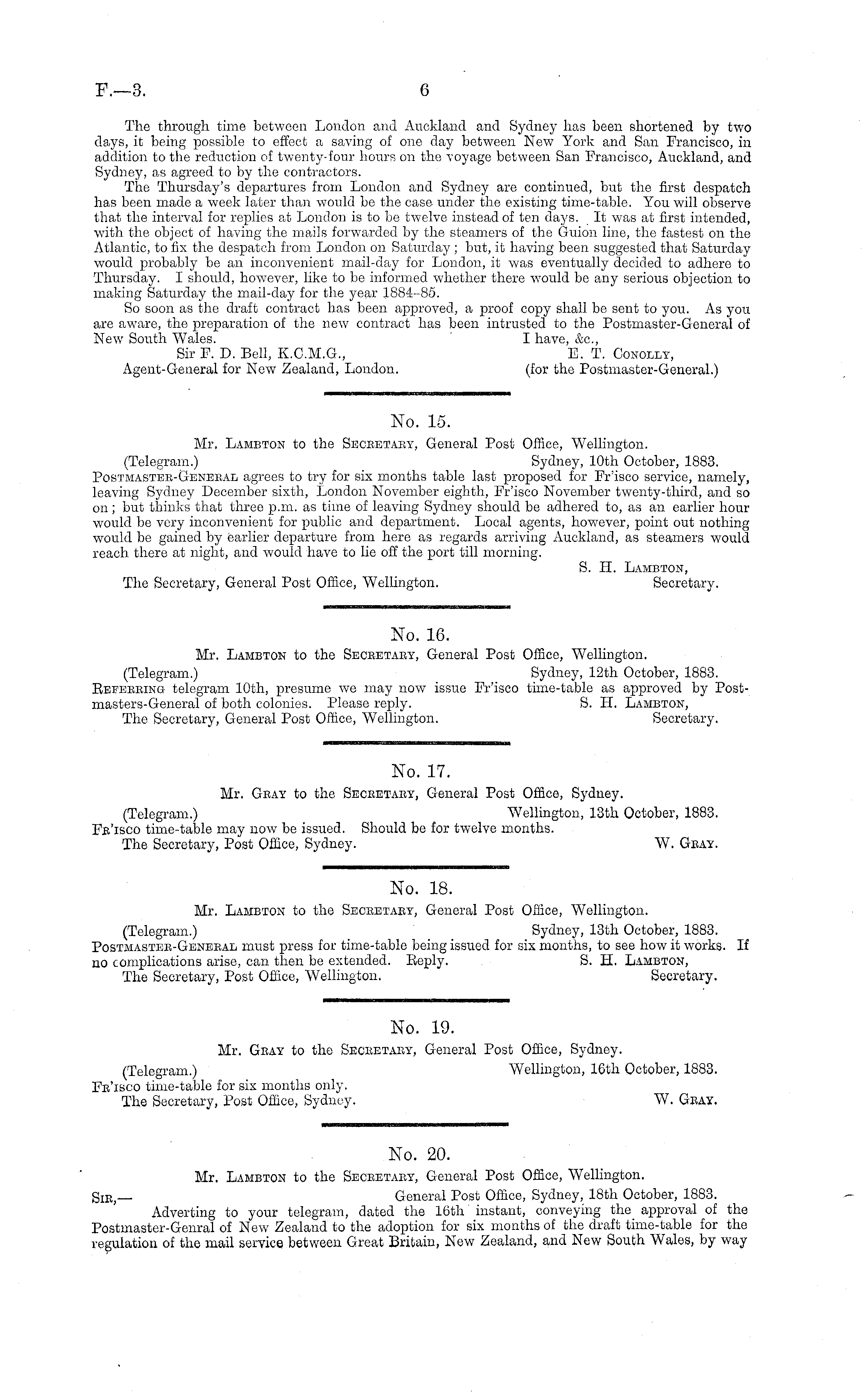 The through time between London and Auckland and Sydney has been shortened by two days, it being possible to effect a saving of one day between New York and San Francisco, in addition to the reduction of twenty-four hours on the voyage between San Francisco, Auckland, and Sydney, as agreed to by the contractors. The Thursday's departures from London and Sydney are continued, but the first despatch has been made a week later than would be the case under the existing time-table. You will observe that the interval for replies at London is to be twelve instead of ten days. It was at first intended, with the object of having the mails forwarded by the steamers of the Guion line, the fastest on the Atlantic, to fix the despatch from London on Saturday ; but, it having been suggested that Saturday would probably be an inconvenient mail-day for London, it was eventually decided to adhere to Thursday. I should, however, like to be informed whether there would be any serious objection to making Saturday the mail-day for the year 1884-85. So soon as the draft contract has been approved, a proof copy shall be sent to you. As you are aware, the preparation of the new contract has been intrusted to the Postmaster-General of New South Wales. I have, &c, Sir F. D. Bell, K.C.M.G., E. T. Conolly, Agent-General for New Zealand, London. (for the Postmaster-General.) ;j»m_«_______nj___________n»_______*_i__■___■