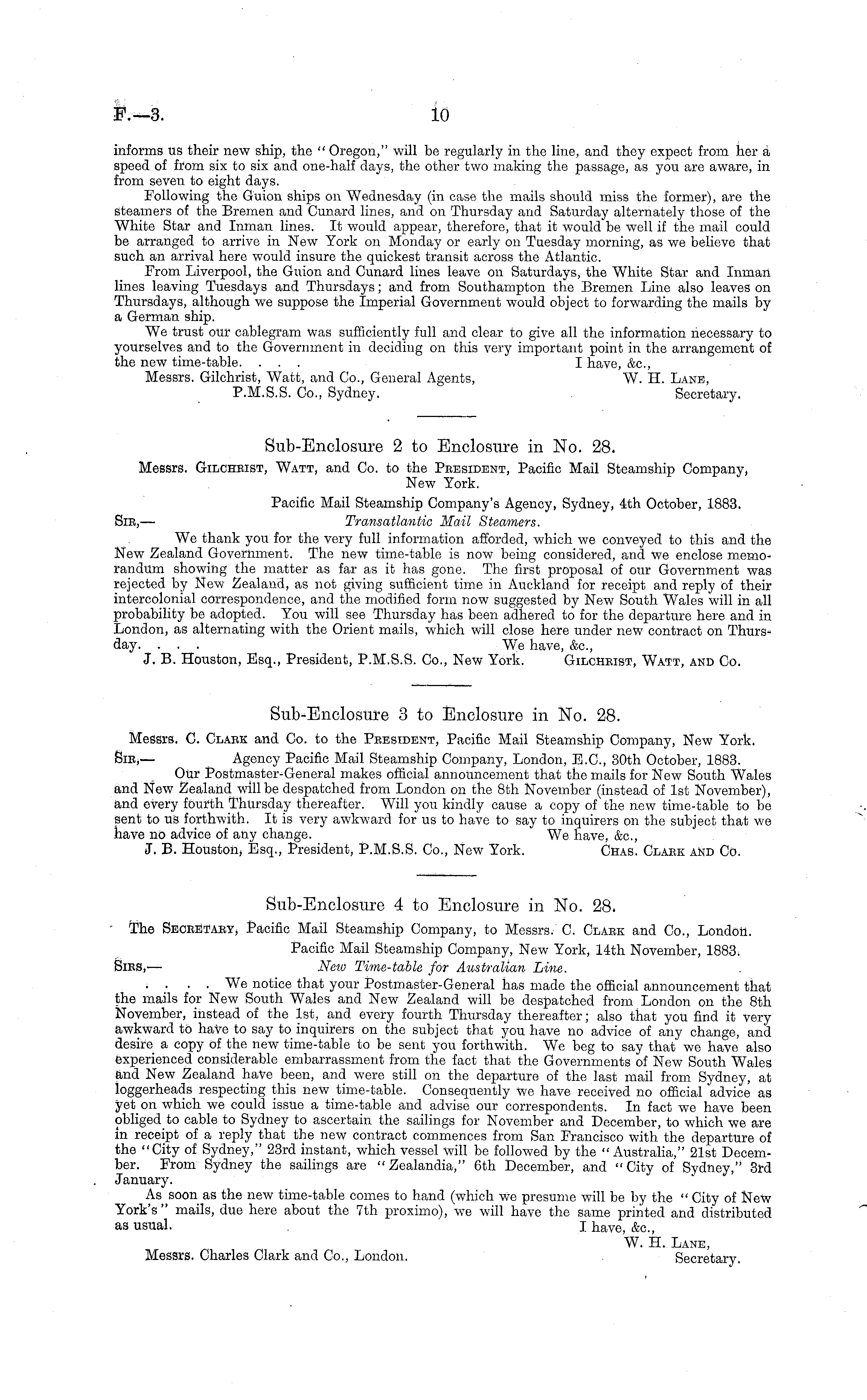 Sub-Enclosure 3 to Enclosure in No. 28. Messrs. C. Clark and Co. to the President, Pacific Mail Steamship Company, New York. Sir, — Agency Pacific Mail Steamship Company, London, E.C., 30th October, 1883. Our Postmaster-General makes official announcement that the mails for New South Wales and New Zealand will be despatched from London on the Bth November (instead of Ist November), and every fourth Thursday thereafter. Will you kindly cause a copy of the new time-table to be sent to us forthwith. It is very awkward for us to have to say to inquirers on the subject that we have no advice of any change. We have, &c, J. B. Houston, Esq., President, P.M.S.S. Co., New York. Chas. Clark and Co.