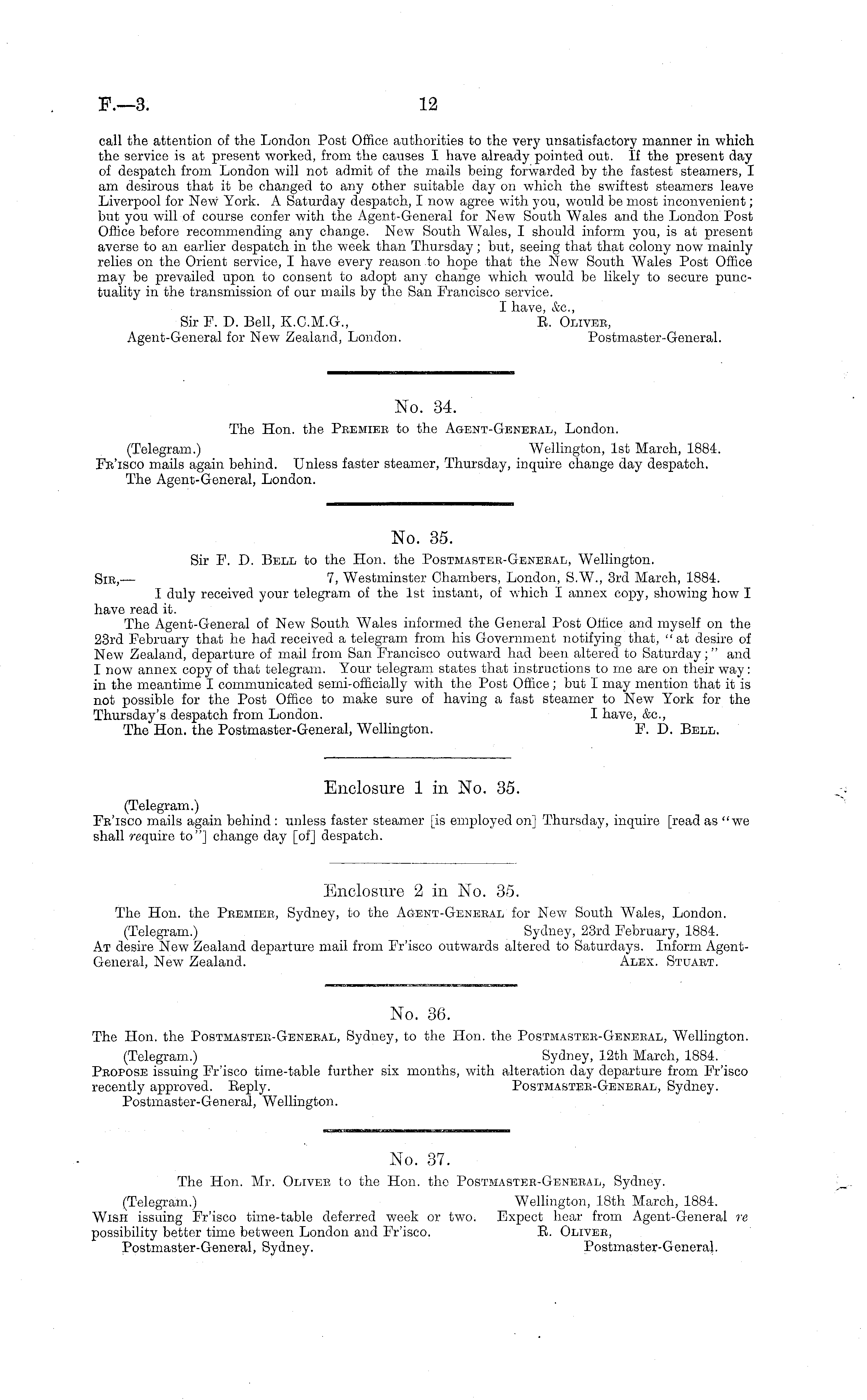 No. 35. Sir F. D. Bell to the Hon. the Postmaster-General, Wellington. Sir, — 7, Westminster Chambers, London, S.W., 3rd March, 1884. I duly received your telegram of the Ist instant, of which I annex copy, showing how I have read it. The Agent-General of New South Wales informed the General Post Office and myself on the 23rd February that he had received a telegram from his Government notifying that, " at desire of New Zealand, departure of mail from San Francisco outward had been altered to Saturday;" and I now annex copy of that telegram. Your telegram states that instructions to me are on their way: in the meantime I communicated semi-officially with the Post Office; but I may mention that it is not possible for the Post Office to make sure of having a fast steamer to New York for the Thursday's despatch from London. I have, <fee, The Hon. the Postmaster-General, Wellington. F. D. Bell.