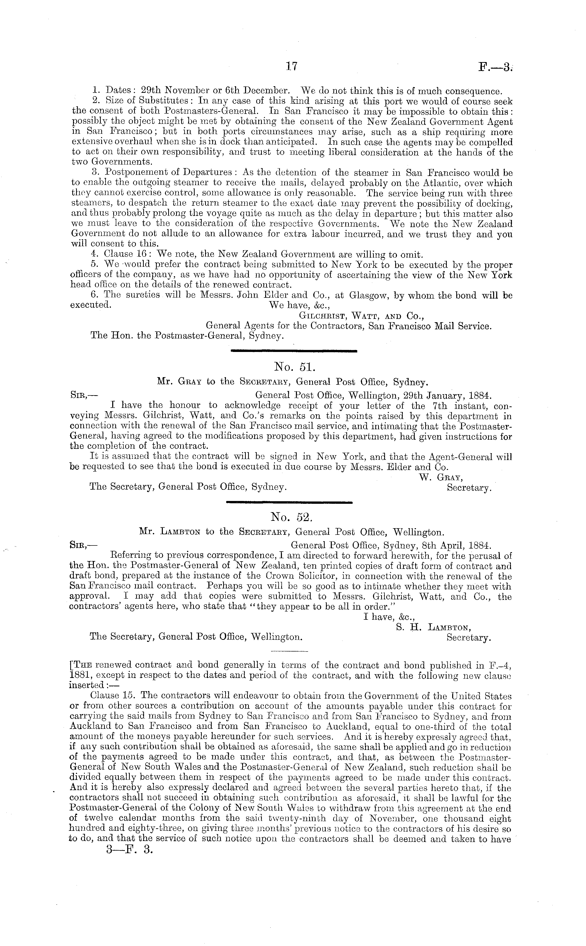 No. 51. Mr. Gray to the Secretary, General Post Office, Sydney. Sir, — General Post Office, Wellington, 29th January, 1884. I have the honour to acknowledge receipt of your letter of the 7th instant, conveying Messrs. Gilchrist, Watt, and Co.'s remarks on the points raised by this department in connection with the renewal of the San Francisco mail service, and intimating that the PostmasterGeneral, having agreed to the modifications proposed by this department, had given instructions for the completion of the contract. It is assumed that the contract will be signed in New York, and that the Agent-General will be requested to see that the bond is executed in due course by Messrs. Elder and Co. W. Gray, The Secretary, General Post Office, Sydney. Secretary.