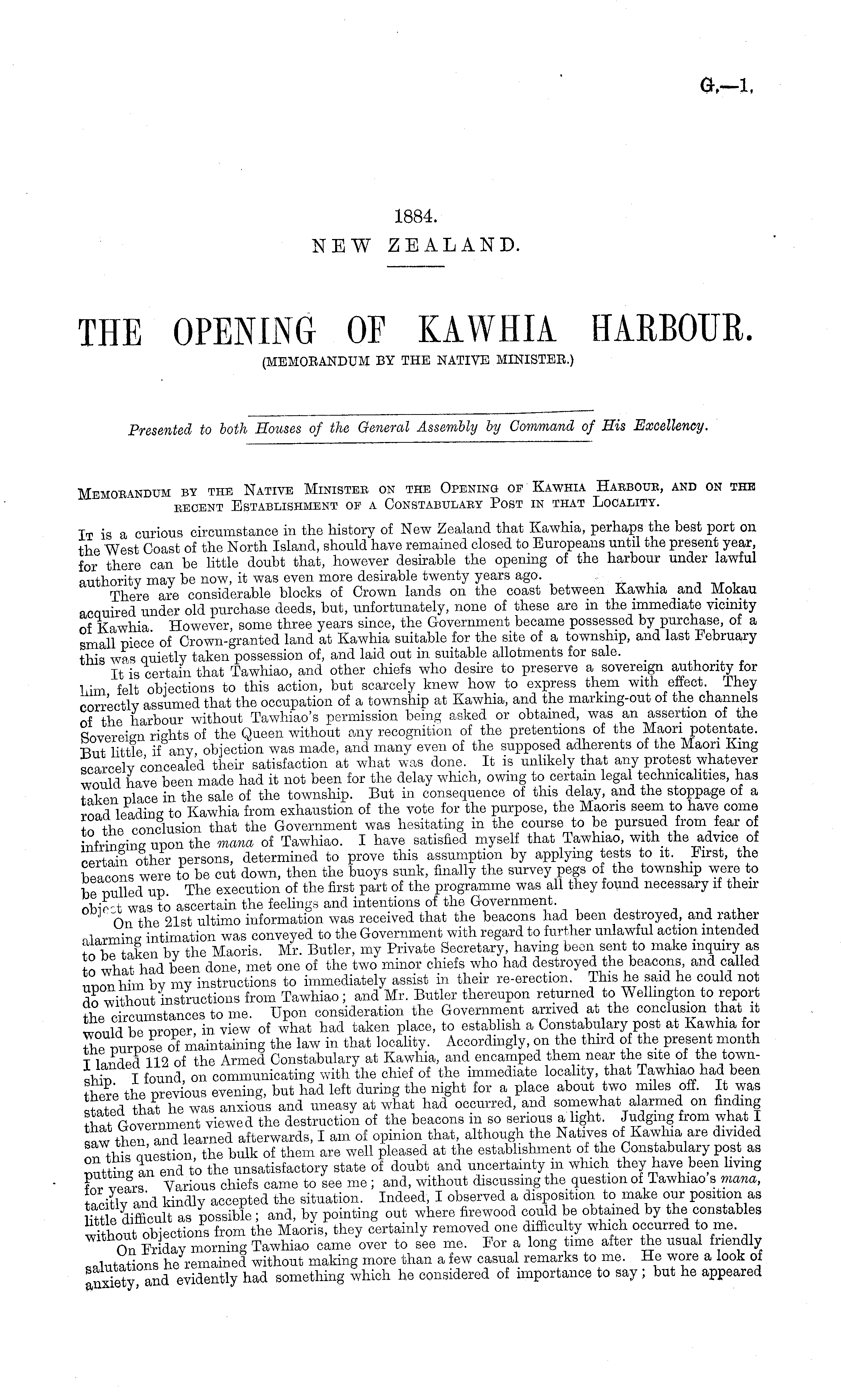 THE OPENING OF KAWHIA HARBOUR. (MEMORANDUM BY THE NATIVE MINISTER.)