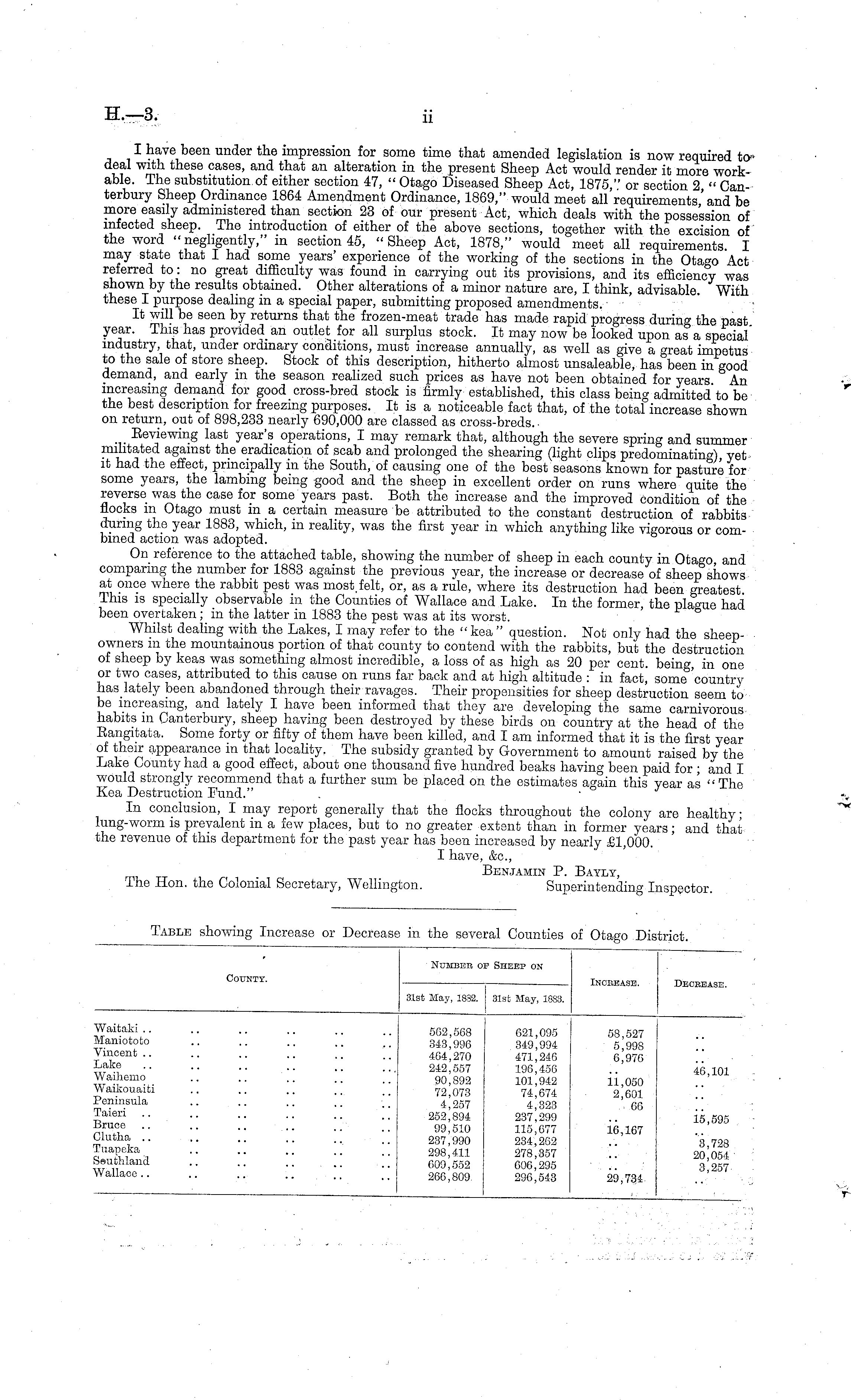 Number of Sheep on County. Increase. Decbeasu. 31st May, 1832. 31st May, 1883. Waitaki .. Maniototo Vincent .. Lake Waihemo Waikouaiti Peninsula Paieri Bruce 31utha .. Fuapeka seuthlaiiil Wallace .. 5G2,568 343,996 464,270 242,557 90,892 72,073 4,257 252,894 99,510 237,990 298,411 609,552 266,809 621,095 349,994 471,246 196,456 101,942 74,674 4,323 237,299 115,677 234,202 278,357 606,295 296,543 58,527 5,998 6,976 11,050 2,601 60 46,101 16,167 15,595 3,728 20,054 3,25729,734