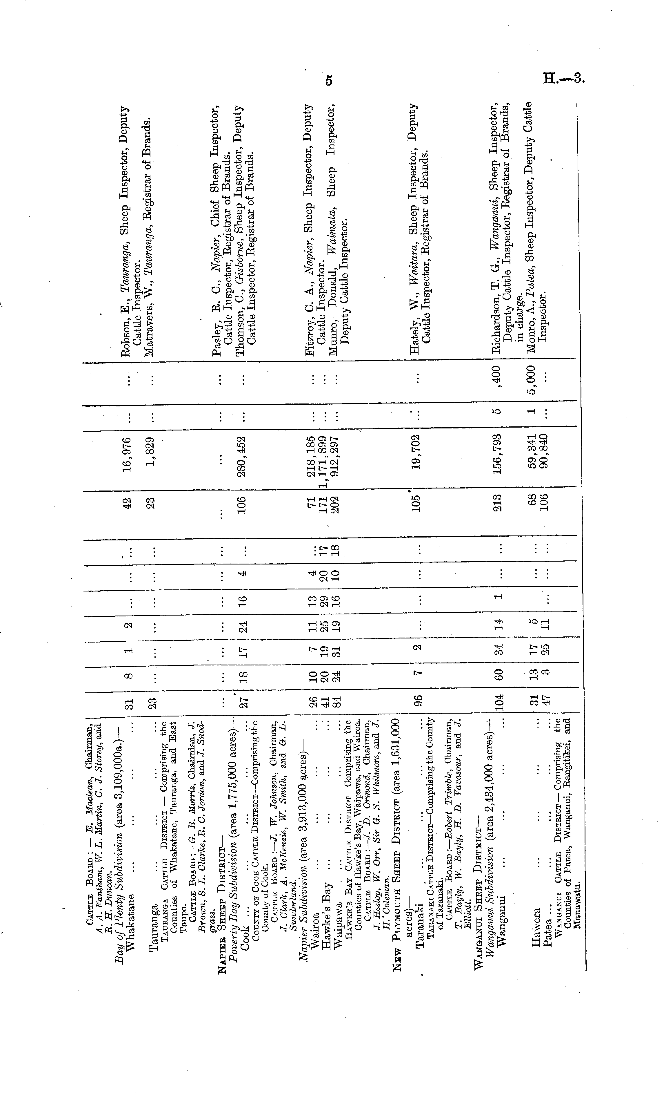 Cattle Boaed : — E. Maclean, Chairman, A. A. Fantham, W. L. Martin, C. J. Storey, and B. H. Duncan. Bay of Plenty Subdivision (area 3,109,000a.) — Whakatane Eobson, B., Tauranga, Sheep Inspector, Deputy Cattle Inspector. Matravers, W., Tauranga, Eegistrar of Brands. 31 8 1 2 42 16,976 Tauranga Taurajtga Cattle Distbict — Comprising the Counties of Whakatane, Tauranga, and East Taupo. Cattle Board :— G. B. Morris, Chairman, J. Brown, S. L. Clarke, B. C. Jordan, and J. Snodgrass. Napiek Sheep Distbict — Poverty Bay Subdivision (area 1,775,000 acres) — Cook ... ... ' ... County of Cook Cattle Distbict —Comprising the County of Cook. Cattle Board :—/. W. Johnson, Chairman, J. Clark, A. McKenzie, W. Smith, and G. L. Sunderland. Napier Subdivision (area 3,913,000 acres) — Wairoa Hawke's Bay ... Waipawa Hawke's Bay Cattle District —Comprising the Counties of Hawke's Bay, Waipawa, and Wairoa. Cattle Board :— J. t>. Ormond, Chairman, J. Reslop, W. Orr, Sir G. S. Whitmore, and J. H.' Golcman. New Plymouth Sheep Distbict (area 1,631,000 acres) — Taranaki . ••• Taranaki Cattle District —Comprising the County of Taranaki. Cattle Board :— Robert Trimble, Chairman, T. Bayly, W. Bayly, H. D. Vavasour, and J. Elliott. "Wanganui Sheep Disteict — Wanganui Subdivision (area 2,434,000 acres)— Wanganui 23 23 1,829 27 18 17 24 16 4 106 280,452 Pasley, E. C, Napier, Chief Sheep Inspector, Cattle Inspector, Eegistrar of Brands. Thomson, C, Gisborne, Sheep Inspector, Deputy Cattle Inspector, Eegistrar of Brands. 26 41 84 10 20 24 7 19 31 11 25 19 13 29 16 4 20 10 17 18 71 171 202 218,185 1,171,899 912,297 Fitzroy, C. A., Napier, Sheep Inspector, Deputy Cattle Inspector. Munro, Donald, Waimata, Sheep Inspector, Deputy Cattle Inspector. 96 105 19,702 Hately, W., Waitara, Sheep Inspector, Deputy Cattle Inspector, Eegistrar of Brands. 104 60 34 14 213 156,793 ,400 Eichardson, T. G., Wanganui, Sheep Inspector, Deputy Cattle Inspector, Eegistrar of Brands, in charge. Monro, A., Patea, Sheep Inspector, Deputy Cattle Inspector. Hawera Patea ... Wanganui Cattle District — Comprising the Counties of Patea, Wanganui, Eangitikei, and Manawatu. 31 47 13 3 17 25 5 11 68 106 59,341 90,840 1 5,000 »