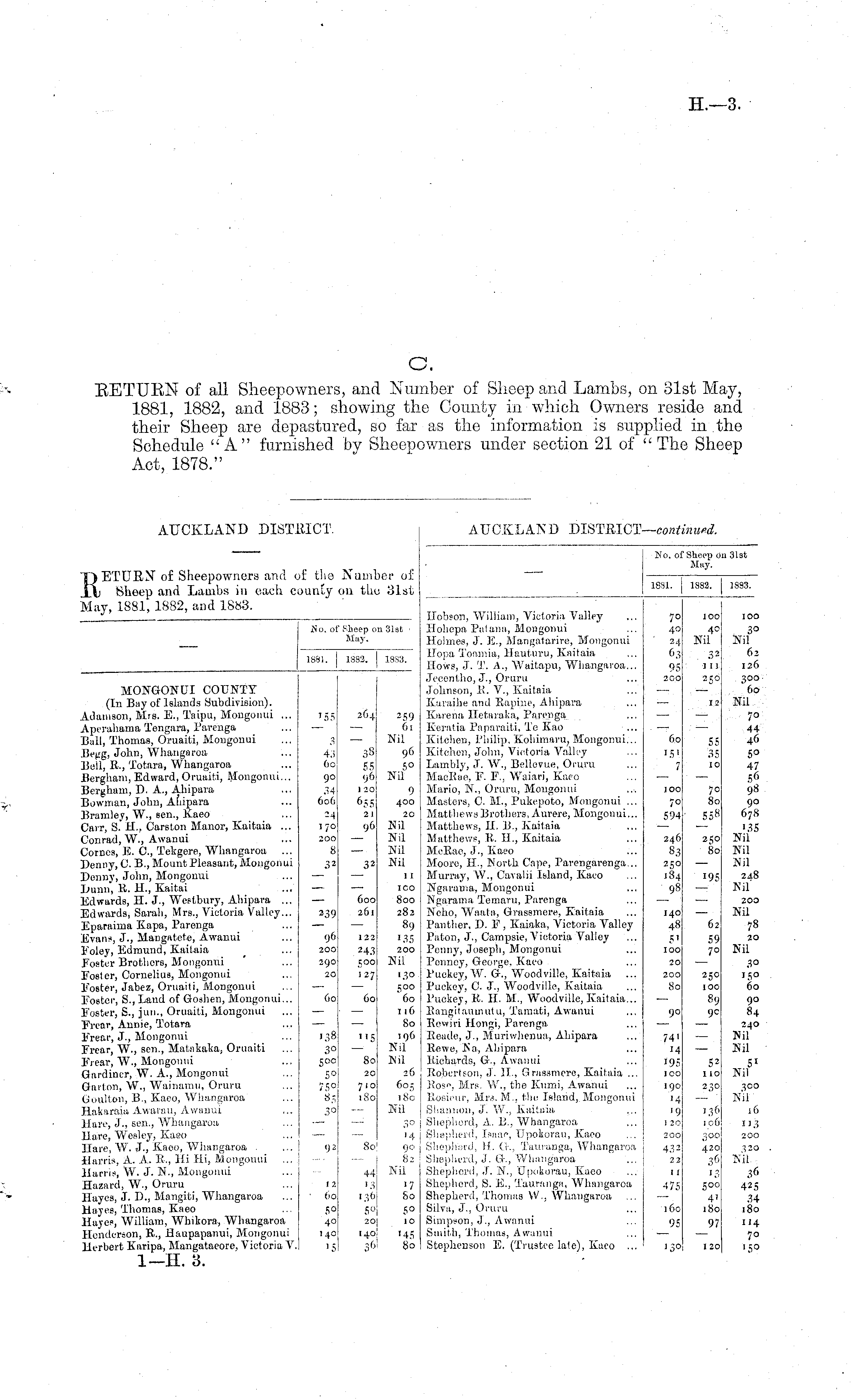 c. EETUEN of all Sheepowners, and Number of Sheep and Lambs, on 31st May, 1881, 1882, and 1883; showing the County in which Owners reside and their Sheep are depastured, so far as the information is supplied in the Schedule "A" furnished, by Sheepowners under section 21 of "The Sheep Act, 1878."