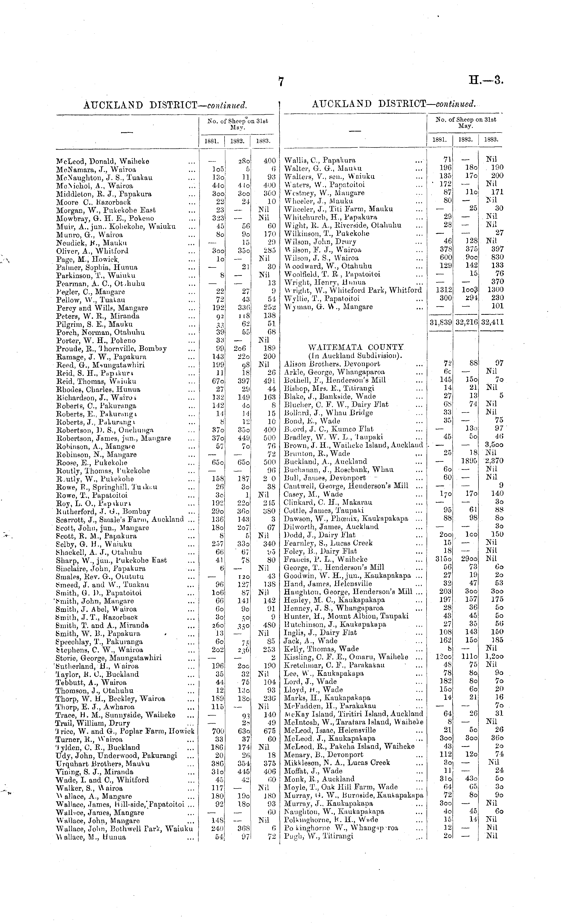 No. of Sheep on 31sfc May. 1881. I 1882. 1883. Wnllis, C, Papakura Walter, G: &., Mauku Walters, V.. sen., W'aiuku Waters, W., Papatoitoi Westney, VV., Mangare Wheeler, J,, Mauku Wlieeler, J., Tili Farm, Mauku Whitchureh, IT., Papakura Wight, It. A., Kiverside, Otahuhu Wilkinson, T., Pubekohe Wilson, John, Drury \A ilson, F. J., Wairoa Wilson, J. 8., Wairoa V\ oodivard, W., Otahuhu Woolfield, T. It , Papatoitoi Wright, llenrv, ilunua W right, W., Whiteford Park, Whitford Wyllie, T., Papatoitoi Wjmuii, G. V\ ., Mangare 71 196 135 ■ 172 87 80 29 28 18o 17c llo 25 128 375 9oo 142 15 Nil 190 200 Nil 171 Kil 30 Nil Nil 27 Nil 397 830 133 76 370 1300 230 101 46 37S 600 129 1312 300 Ioo3 291 31,839 32,210 32,411 WAITEMATA COUNTY (In Auckland Subdivision). Alison Brothers. Devonport Arklo, George, Whangaparoa Bethell, F., Henderson's Mill Bishop, Mrs. K., Titirangi Blake, J., Bankside, Wade Blucher, 0. F. W., Dairy Flat Bollard, J., Whau Bridge Bond, Ji., W r ade U.ord, J. C, Kumeo Flat Bradley, W. W. L., laupnki Brown, J. II. , Waibeke Island, Auckland Brunton, R., Wade Buckland, A., Auckland Buchanan, J., Eosebank, Whau Bull, James, Devonport Cantwell, Q-eorge, Henderson's Mill ... Casey, M., Wade Clinkard, C. H., Makarau Cottle, James, Taupaki Dawson, W., PhcBiiix, Kaukapakapa ... DilwortJt, James, Auckland Dodd, J., Dairy Flat Fearnley, 8., Lucas Creek Foley, B., Dairy Flat Francis, P. L., Waiheke George, T., Henderson's Mill Goodwin, W. H., jun., Kaukapakapa ... Hand, James, Heleneville Haugliton, George, Henderson's Mill ... Henley, M. C, Kaukapakapa Henney, J. S., Whangaparoa Hunter, H., Mount Albion, Taupaki Hutchinson, J., Kaukapakupa Inglis, J., Dairy Flat Jack, A., Wade Kelly, Thomas, Wade Kissling, C. F. E., Ooiaru, Waiheke ... Kretcliinar, C. F., Parakakau Lee, Vt'., Kaukapakapii Lord, J., Wade Lloyd, H., Wade Marks, II., Kaukapakapa McFadden, H., parakakau ivi cKny Island, Tiritiri Island, Auckland Mclntosh, W.,Taratara Island, Waiheie McLeod, Isaac, Hclensville lleLeod. J., Kaukapakapa McLeod, It., Pakeha Island, Waiheke Menary, IS., Devonport Mikkleson, N. A., Lucas Creek Moflat, J., Wade Monk, E., Auckland Moyle, T., Oak Hill Farm, Wade Murray, ii. W., liurneide, Kauhapakupa Murray, J.. Kankapakapa Naugliton, W., Kaukapakapa Polkinghorne, U. H., Wade Po kinghonie W., Whang ip roa Pugl), W., Titirangi 7:' 6c 145 14 27 63 33 35 45 25 Go 60 1'° 95: 88 2oo 15 18 315o 56 27 32 203 197 28 43 27 108 162 is 12oo 48 78 182 15o 14 88 15o 21 13 74 ISo 5o 18 1895 17o 61 98 Ico 29oo 73 19 47 3oo 157 36 45 35 143 loo 97 Nil 7o Nil 5 Nil Nil 75 97 4,6 3,5oo Nil 2,370 Nil Nil 9 140 3o 88 8o 3o 150 Nil Nil Nil tio 2o 53 3oo 175 5o 5o 56 150 )85 Nil 1.2oo Nil 9o 7o 20 16 7o 31 Nil 26 3fio 2o 74 Nil 24 5o So 9o Nil 6o Nil Nil Nil lllo 75 8o 8o Oo 21 64 8 21 3oo 43 112 So 11 31o 64 72 3 oo 4o 15 12 2o 26 5o 3oo 12o 43o 65 8o 45 1-i