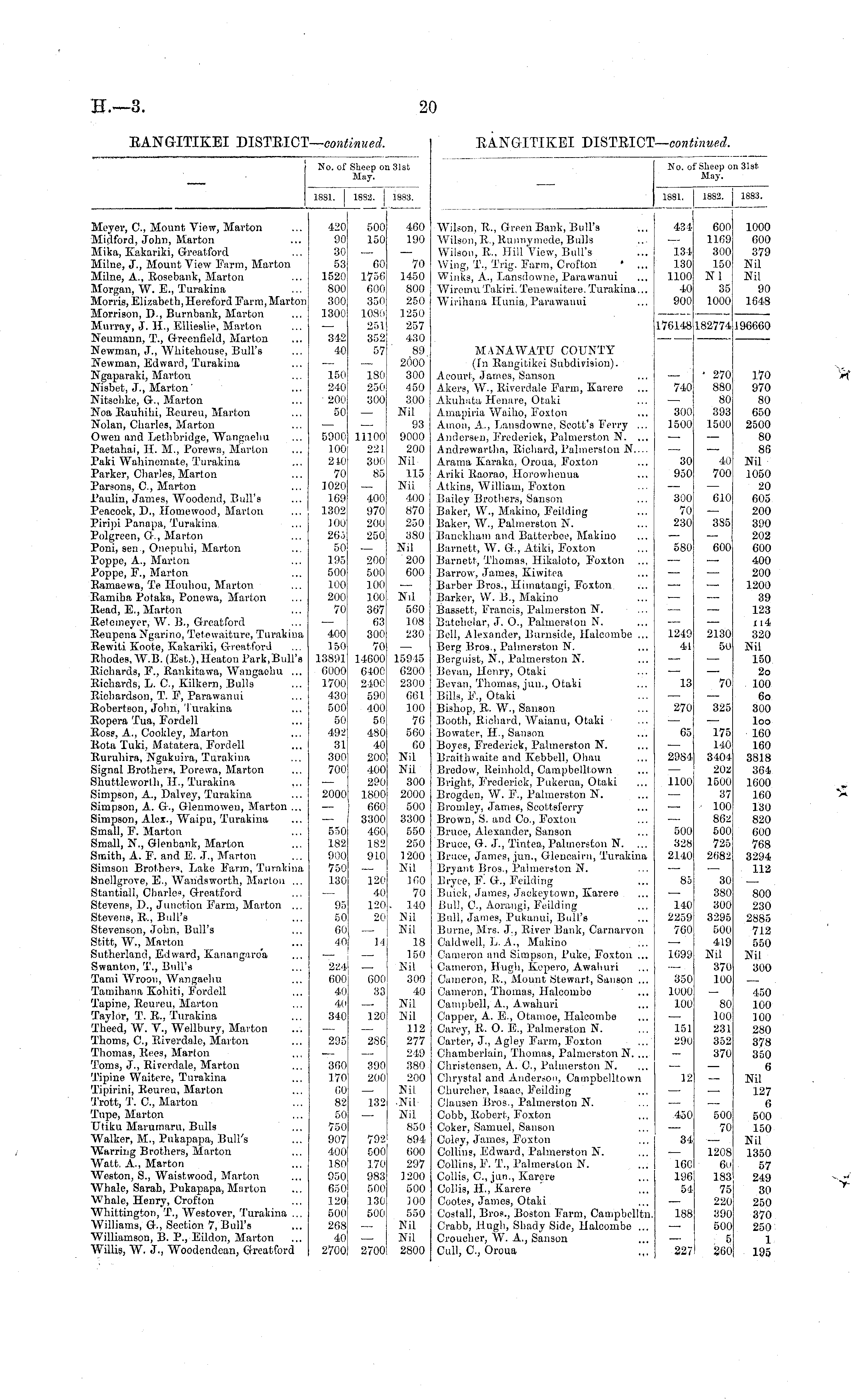 No. of Sheep on 31at May. 1881. I 18S2. 18S:j. Meyer, C, Mount View, Marton Midford, John, Marton Mika, Kakariki, Greatford Milne, J., Mount View Farm, Marton Milne, A., Rosebank, Marton Morgan, W. E., Turakina Morris, Elizabeth, Hereford Farm,Martoi Morrison, D., Burnbank, Marfcon Murray, J. H., Ellieslie, Mavton Neumann, T., G-reenfield, Marton Newman, J., Whitehouse, Bull's Newman, Edward, Turakina Ngaparald, Marton Nisbet, J., Marton' Nitsehke, Or., Marton Noa Rauhihi, Reureu, Marton Nolan, Charles, Marton Owen and Letlibridge, Wangaeliu Paetahai, II. M., Porewa, Marlon Paki Wahinomate, Turakina Parker, Charles, Marlon Parsons, C, Marton i'aulin, James, Woodond, Bull's Peacock, 1)., Homewood, Marton Piri])i Pannpa, Turakina Polgreen, O., Marton Poni, sen , OnepuUi, Marton Poppe, A., Marton Poppe, F., Marton Ramaewa, Tβ Houhou, Marton Eamiba Potaka, Ponewa, Marton Read, E., Marton Retemeyer, W\ B., Greatford Reupena Ngarino, Tetowaiture, Turakina Rewiti Koote, ICakariki, G-reatford Rhodes, W.B. (Est.),Heaton Park.Bull's Richards, F., Rankita-wa, Wnngaobu ... Richards, L. C, Kilkern, Bulla Richardson, T. .F, Parawanui Robertson, John, Turakina Eopera Tua, Fordell Ross, A., Cookley, Marton Kota Tuki, Matatera, Ford ell Ruruhira, Ngakuira, Turakina Signal Brothers, Porewa, Marton Shuttleworth, II., Turakina Simpson, A., Dalvey, Turakina Simpson, A. G., Glenmowen, Marton ... Simpson, Alex., Waipu, Turakina Small, F. Marton Small, N., Glenbank, Marton Smith, A. F. and E. J., Marton Simson Brothers, Lake Farm, Turakina ISnellgrove, E., Wandsworth, Marlon ... Stantiall, Oharle*, G-reatford Stevens, D., Junction Farm, Marton ... Stevens, B., Bull's Stevenson, J ohn, Bull's Stitt, W., Marton Sutherland, Edward, Xanangaroa Swanton, T., Bull's Tami Wroon, Wangaehu Tamihana Kohiti, Fordell Tapine, Reureu, Mai-ton Taylor, T. R., Turakina Theed, W. V., Wellbury, Marton Thorns, C, liiverdalc, Marton Thomas, Rees, Marton Toms, J., Rivprdale, Marton Tipine Waitere, Tura.kina Tipirini, Reureu, Marton Trott, T. C, Marton Tupe, Marton Utiku Marurnaru, Bulls Walker, M., Pukapapa, Bull's Warring Brothers, Marton Walt. A., Marton Weston, S., Waistwood, Marton Whale, Sarah, Pukapapa, Miirton Whale, Henry, Croft on Whittington, T., Westover, Turakina ... Williams, Gr., Section 7, Bull's Williamson, B. P., Eildon, Marton Willis, W. J., Woodendean, G-reatford 420 90 30 53 1520 800 300 1300 312 40 150 240 ■ 201.1 50 5900 100 2 to 70 1020 169 1302 J 00 263 50 195 500 100 200 70 400 150 13891 6000 1700 430 500 50 492 31 300 700 500 150 (10 1756 600 350 1080 251 352 57 ISO 250 300 11100 221 300 85 400 970 200 250 200 500 100 100 367 63 300 70 14600 6400 2400 590 400 50 480 40 200 400 290 1800 660 3300 460 182 910 460 190 70 1450 800 250 1250 257 430 89 2000 300 450 300 Nil 83 9000 200 Nil 115 Nil 400 870 250 380 Nil 200 600 Nil 560 108 230 15945 6200 2300 GGl 100 70 560 SO Nil Nil 300 2000 500 3300 550 250 1200 Nil ]fi0 70 . 140 Nil Nil 18 150 : Nil 300 40 Nil Nil 112 277 249 380 200 Nil NilNil 850 ' 894 (i00 297 1200 500 100 550 Nil Nil 2800 2000 550 182 900 750 130 95 50 60 401 12(i 40 120 20 ' I 224i 600 40 40 340 600 33 120 295 2SG 360 170 60 82 50 750 907 400 ISO 950 650 120 500 268 40 2700 890 200 132 7921 600 170 983 500 130 500 2700