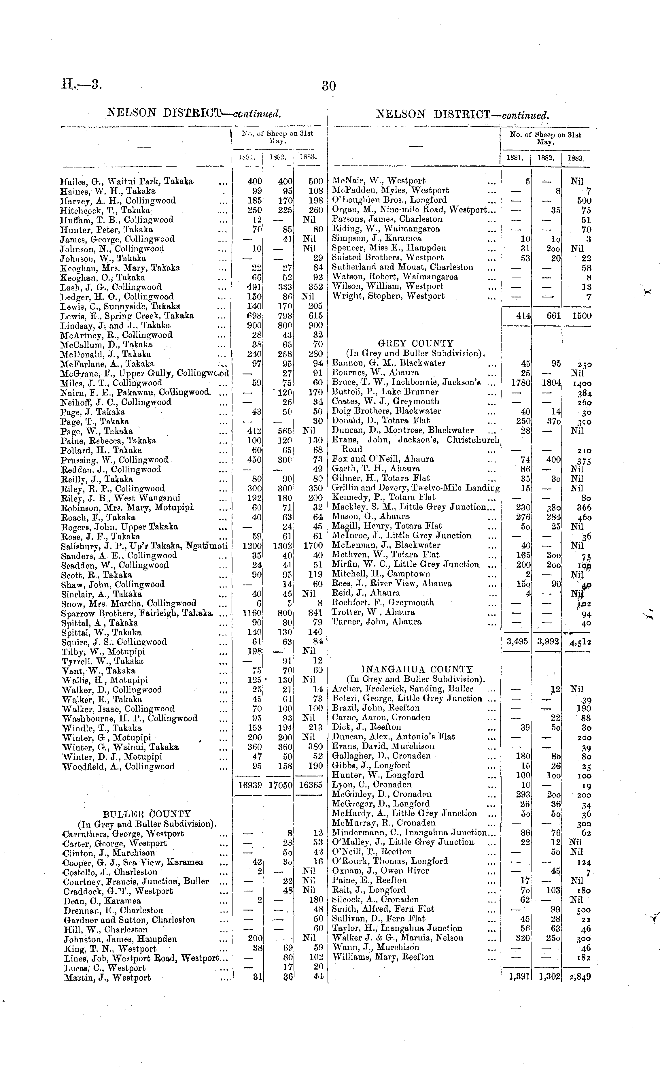 No. of Sheep on 31st May. 1S81. 1882. I 1883. McNair, W., Weslport McFadden, My lee, Weatporb O'LougMen Bros., Longford Organ, M., Nine-mile Road, Westport... Parsons, J amen, Charleston Riding, W., Wainiangaroa Simpson, J., ICaramea Spencer, Miss E., Hampden Suisted Brothers, Westport Sutherland and Mount, Charleston Watson, Robert, Waimangaroa Wilson, William, Westport Wright, Stephen, Weetport 5 10 31 53 8 35 lo 2oo 20 Nil 7 500 75 51 70 3 Nil 22 58 8 13 7 414 661 1500 GREY COUNTY (In Grey and Buller Subdivision). Banuon, G. M., Blaekwater Bournes, W., Ahaura Bruce, T. W., Inchbonnie, Jackson's ... Buttoli, P., Lake Brunner Coates, W. J., Greymouth .,. Doig Brothers, Blaekwater Donald, D., Totara Plat Duncan, D., Montrose, Blaokwater Evans, John, Jackson's, Christcliurch Road Fox and O'Neill, Ahaura Garth, T. H., Ahaura Gilmer, H., Totara Flat Grillin and Devery, Twelve-Mile Landing Kennedy, P., Totara Flat Maekley, S. M., Little Grey Junction... Mason, G., Ahaura Magill, Henry, Totara Flat Mclnroe, J.. Little Grey Junction. McLennan, J., Blaekwater Methven, W., Totara Flat Mirfln, W. C, Little Grey Junction. ... Mitchell, II., Camptown Rees, J., River View, Ahaura Reid, J., Ahaura Rochfort, F., Greymouth Trotter, W , Ahaura Turner, John, Ahaura 45 25 1780 40 250 28 74 8fi 35 15 95 1804 14 37o 400 3o 2 S O Nil 1400 384 260 30 3CO Nil 210 375 Nil Nil Nil 80 366 460 Nil 36 Nil 75 100 Nil 40 Nil 102 94 40 230 276 5o 380 284 25 40 165 200 2 15o 4 3oo 2oo 90 3,495 3,992 4.5*2 INANGAHUA COUNTY (In Grey and Buller Subdivision). Archer, Frederick, Sanding, Buller Beteri, George, Little Grey Junction ... Brazil, John, Heefton Carrie, Aaron, Cronaden Dick, J., Reefton Duncan, Alex., Antonio's Flat ... Evans, David, Murchison Gallagher, D., Cronaden Gibbs, J., Longford Hunter, W., Longford Lyon, C, Cronaden McGinley, D., Cronaden McGregor, D., Longford Mctlardy, A., Little Grey Junction McMurray, R., Cronaden Mindermann, C, Inangahua Junction... O'Malley, J., Little Grey Junction O'Neill, T., Reefton O'Rourk, Thomas, Longford Oxnarn, J., Owen River Paine, E., Reefton Rait, J., Longford Sileock, A., Cronaden Smith, Alfred, Fern Flat Sullivan, D., Fern Flat Taylor, H., Inangahua Junction Walker J. & G., Maruia, Nelson Wann, J., Murchison Williams, Mary, Reefton 39 180 15 100 10 293 26 5o 12 22 5o 8o 26 loo 2oo 36i 5o Nil 39 190 88 3o 200 39 80 2 S 100 '9 200 34 36 300 62 Nil Nil 124 Nil t8o Nil 86 22 76 12 5o 17 7o 62 45 103 45 56 320 99 28 63 25o 500 22 46 300 46 182 1,391 1,302 2,8 4 9