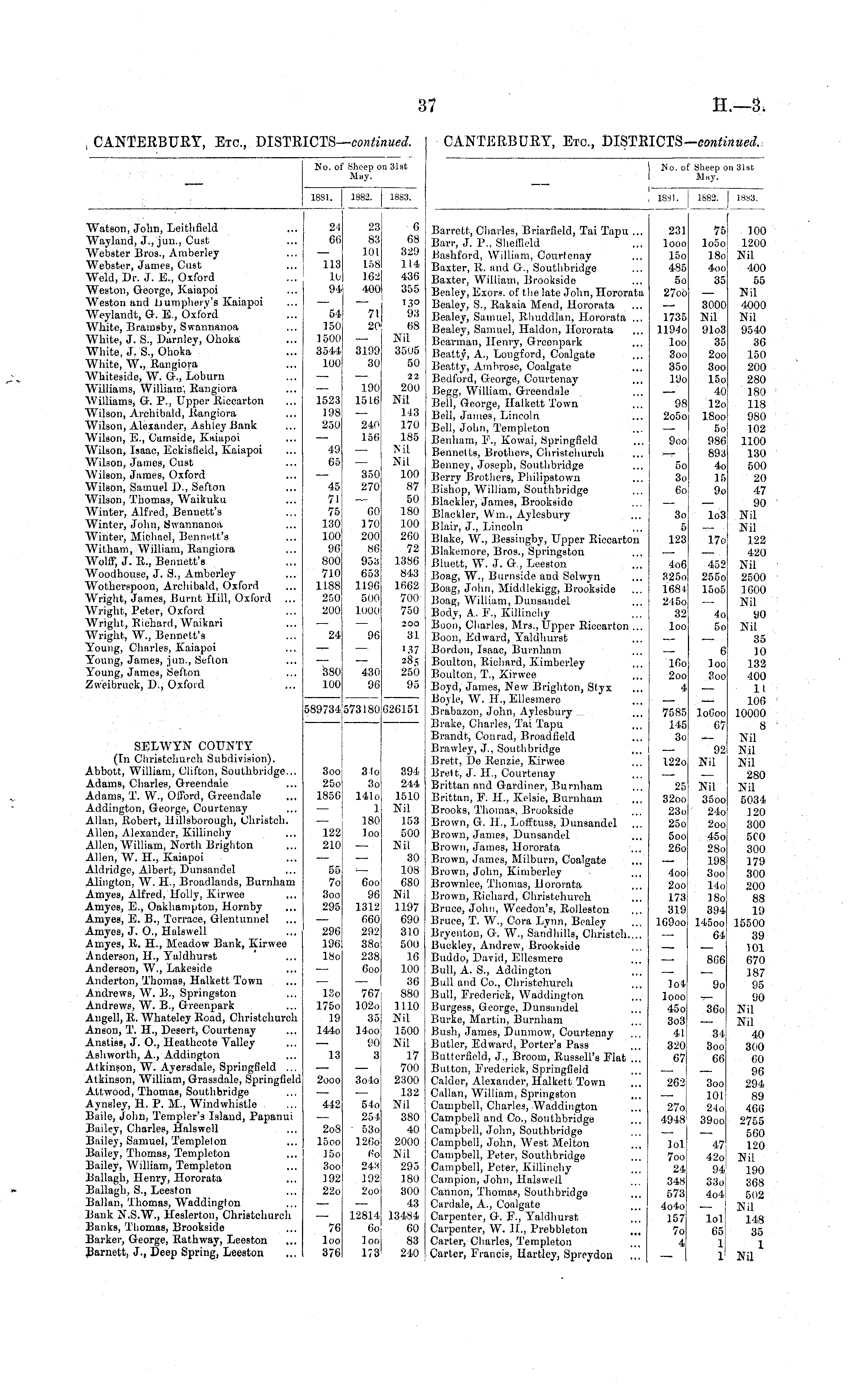 Ko, of Sheep on 31st May. iS3i. 1882. 1853. Barrett, Charles, 33riarficld, Tai Tapu ... Ban-, J. P., Sheffield Bashi'ord, William, Courtenay Baxter, R. and Or., Southbridge Baxter, William, Brookside Bealey, Exors. of the late John, Hororata Bealey, S., Rakaia Mend, Hororata Bealey, Samuel, Khuddlan, Hororata ... Bealey, Samuel, Haldon, Hororata Bearman, Henry, Greenpark Beatty, A., Longford, Coalgate Beatty, Ambrose, Coalgate Bedford, G-eorge, Courtenay ... Begg, William, Qreendale Bell, George, Halkett Town Bell, James, Lincoln Bell, John, Terapleton Benham, P., Kowai, Springfield Bennetts, Brothers, Christchuroh Benney, Joseph, Southbridge Berry Brothers, Philipstown Bishop, William, Southbridge Bladder, James, Brookeide Blackler, Win., Aylesbury Blair, J., Lincoln Blake, W., Bessingby, Upper Riecarton Blakemore, Bros., Springston Bluett, W. J. G\, Leeston Boag, W., Burnside and Selwyn Boag, John, Middlekigg, Brookside Boag, William, Dunsandel Body, A. F., Killinchy Boon, Charles, Mrs., Upper Ricearton ... Boon, Edward, Yaldhurat Bordon, Isaac, Burnham Boulton, Richard, Kimberley Boulton, T., Kirwee Boyd, .Tames, New Brighton, Styx Boyle, W. II., Ellesmero Brabazon, John, Aylesbury Brake, Charles, Tai Tapu Brandt, Conrad, Broadfield Brawley, J., Southbridge Brett, De Renzie, Kirwee Brett, J. II., Courtenay Brittan and G-ardiner, Burnham Brittan, F. H., ICelsie, Burnham Brooks, Thomas, Brookside Brown, G-. H., Lofftuss, Dunsandel Brown, James, Dunsandel Brown, James, Hororata Bvown, James, Milburn, Coalgate Brown, John, Kimberley Brownlee, Thomas, llororata Brown, Richard, Christenurch Bruce, John, Weedon's, Rolleston Bruce, T. W., Cora Lynn, Bealey Bryenton, G. W., Sandhills, Christcli.... Buckley, Andrew, Brookside Buddo, David, Ellesmere Bull, A. S., Addington Bull and Co., Christclmrch Bull, Frederick, Waddington. Burgess, George, Duneandel Burke, Martin, Burnham Bush, James, Dunmow, Courtenay Butler, Edward, Porter's Pass ButterHcld, J., Broom, Russell's Flat ... Button, Frederick, Springfield Calder, Alexander, Halkett Town Cullan, William, Springston Campbell, Charles, Waddington Campbell and Co., Southbridge Campbell, John, Southbridge Campbell, John, West Melton Campbell, Peter, Southbridge Campbell, Peter, Killinehy Campion, John, Halswell Cannon, Thomas, Southbridge Curdale, A., Coulgate Carpenter, G-. F., Yaldhurst, Carpenter, W. 11., Prebbleton Carter, Charles, Templeton Carter, Francis, Hartley, Spreydon 231 looo 15o 485 5o 27oo 1735 1194o loo 3oo 35o lUo 98 2o5o 9oo 5o 3o 6o 3o 5 123 4o6 .1250 1684 2'15o 32 loo 10o 2oo 4 7585 145 3o 76 Io5o 18o 4oo 35 3000 Nil 91o3 35 2oo 3oo 15o 40 12o 18oo 5o 986 893 4o 16 9o Io3 17b 452 255o 15o5 4o 5o 6 loo 8oo loCoo 67 92 Nil 100 1200 Nil 400 55 Nil 4000 Nil 9540 3G 150 200 280 180 118 980 102 1100 130 500 20 47 90 Nil Nil 122 4.20 Nil 2500 1600 Nil yo Nil 35 10 132 400 II 106 10000 8 Nil Nil Nil 280 Nil 5034 120 300 5C0 300 179 300 200 88 19 15500 39 101 670 187 95 90 Nil Nil 40 300 60 96 294 89 466 2755 560 120 Nil 190 368 502 Nil 148 35 1 Nil 122o 25 32oo 23o 25o 5oo 26o 4oo 2oo 173 319 109oo Nil 35oo 24o 2oo 45o 286 198 3 oo l4o 18o 394 145oo 64, 806 loi looo 45o 3o3 41 320 67 9o 36o 34 3oo 66 262 3oo 101 too 39oo 27o 4948' 3ol 7oo 24 348 573 4o4o 157 7o 4 47 42o 94 38p 4oi\ lol 65 1 1