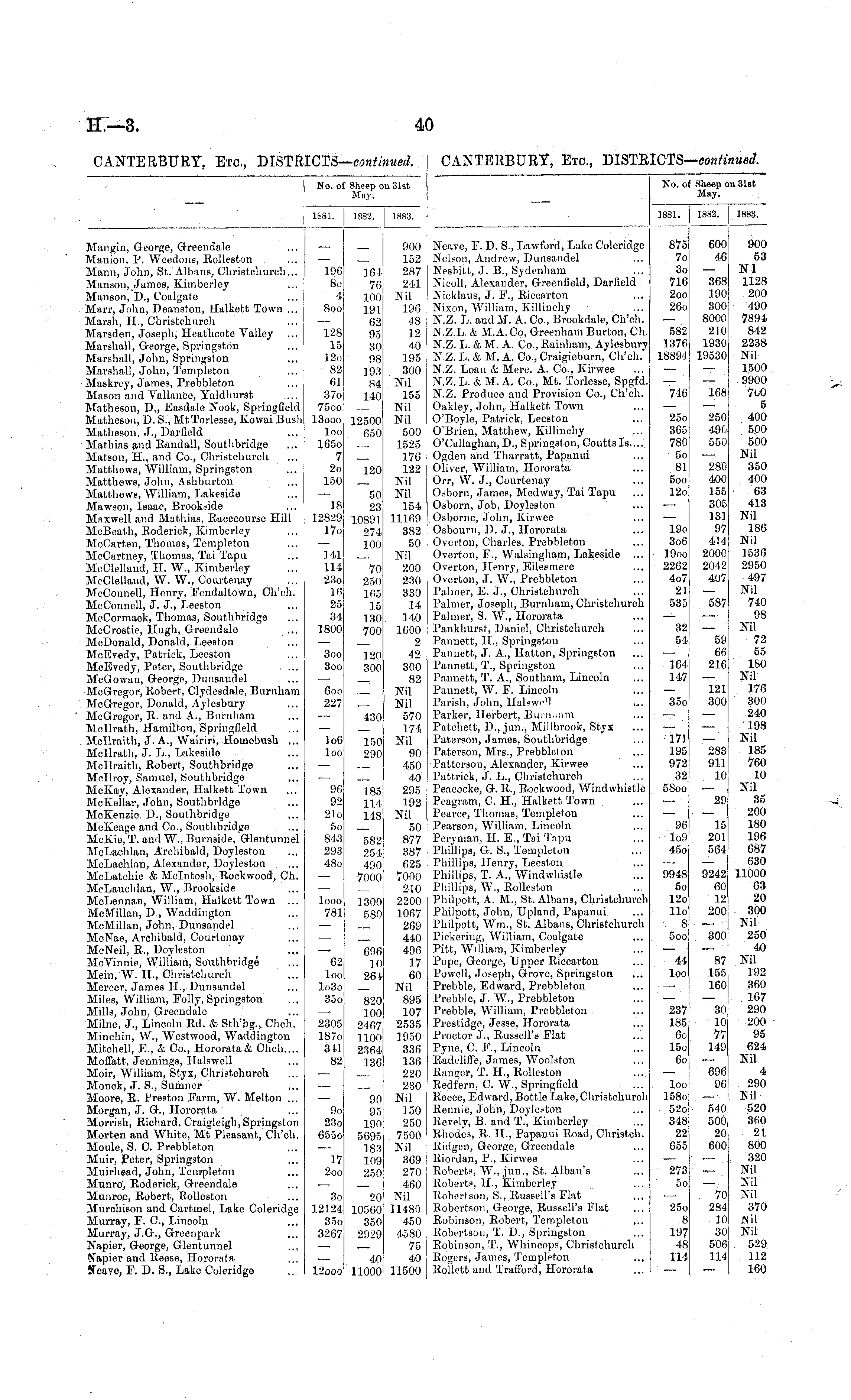 No. of Sheep on 31et May. 1881. 1882. 1883. Neave, F. D. S., Lawford, Lake Coleridge Nelson, Andrew, Dunsandel Neebitt, J. B., Sydenham Nieoll, Alexander, Greenfield, Dariield Nicklaus, J. E., Biccarton Nixon, William, Killirichy N.Z. L. aud M. A. Co., Brookdale, Ch'oli. N.Z.L. & M.A.Co, Greenham Burton, Ch. N.Z. L. & M. A. Co., Rainham, Aylesbury N.Z. L. & M. A. Co., Craigieburn, Ch'ch. N.Z. Loan & Mere. A. Co., Kirwee N.Z. L. & M. A. Co., Mt. Torlesse, Spgfd. N.Z. Produce and Provision Co., Ch'eh. Oakley, John, Ilalkett Town O'Boyle, Patrick, Leoston O'Brien, Matthew, Killinchy O'Callaghan, D., Springston, Couttsls.... Ogden and Tharrat.t, Papanui Oliver, William, Hororata Orr, W. J., Courtenay Osborn, James, Medway, Tai Tapu Osborn, Job, X)oyleston ... Osborne, John, Kirwee Osbourn, D. J., Hororata Overlou, Charles, Prebbleton Overton, F., Walsingham, Lakeside ... Overton, Henry, Elleemere Orerton, J. W., Prebbleton Palmer, E. J., Christchureh Palmer, Joseph, Burnhain, Christchureh Palmer, S. W., Hororata Pankhurst, Daniel, Christchureh Paimett, H., Springston Pannett, J. A., Hatton, Springston Pannett, T., Springston Paimett, T. A., Southam, Lincoln Pannett, W. P. Lincoln Parish, John, Halswe>l Parker, Herbert, Burn..;tm Patchett, D., jun., Millbrook, Styx Paterson, James, Southbridge Paterson, Mrs., Prebblelon Patterson, Alexander, Kirwee Patlrick, J. L., Christ church Peacocke, G. B., Rockwood, Windvvhistle Peagram, C. Ii., Ilalkett Town Pearee, Thomas, Templet on Pearson, William, Lincoln Peryman, II. E., Tai Tapu Phillips, G. S., Templelon Phillips, Henry, Leeston Phillips, T. A., Windwhislle Phillips, W., Rolleston Philpott, A. M., St. Albans, Christclvuroh Philpott, John, Upland, Papanui Philpott, Wm., St. Albans, Christchureh Pickering, William, Coalgate Pitt, William, Kimberley Pope, George, Upper Riccarton Powell, Joseph, Grove, Springston Prebble, Edward, Prebbleton Probble, J. W., Prebbleton Prebble, William, Prebbletou Prestidge, Jesse, Hororata Proctor J., Russell's Flat Pyne, C. E., Lincoln Radelilfe, James, Woolston Ranger, T. H., Rolleston Redfern, C. W., Springfield Reece, Edward, Bottle Lake, Christchureh Rennie, John, Doyleston Revely, 13. and T., Kimberlev Rhodes, R. H., Papanui Road, Christch. Ridgen, George, Greendale Rionlan, P., Kirwee Roberts, W., jun., St. Alban's Roberts, H., Kimborley Rnbcrlson, S., Russell's Flat Robertson, George, Russell's Flat Robinson, Robert, Templeton Robertson, T. D., Springston Robinson, T., Whincops, Chrislchurch Rogers, James, Templeton ... Rollett and Traft'ord, Hororata 875 7o 3o 716 2oo 26o 582 1376 18894 746 25o 365 780 5o 81 5oo 12o 19o 3o6 19oo 2262 4o7 21 535 32 54 164 147 600 46 368 190 300 8000 210 1930 19530 168 250 490 550 280 400 155 305 131 07 414 2000 2042 407 587 59 66 216 900 53 m 1128 200 490 7891 842 2238 Nil 1500 9900 700 5 400 500 500 Nil 350 400 63 413 Nil 186 Nil 153(! 2950 497 Nil 740 98 Nil 72 55 180 Nil 176 300 240 198 Nil 185 760 10 Nil 35 200 180 196 687 630 11000 63 20 300 Nil 250 40 Nil 192 360 167 290 200 95 624, Nil 35o 121 300 171 195 972 32 58oo 283 911 10 29 96 Io9 45o 15 201 564 9948 5o 12o llo 8 9242 60 12 200 5oo 300 44 loo 87 155 160 237 185 6o 15o 6o 30 10 77 149 696 96 4 290 Nil 520 3fiO 21 800 320 Nil Nil Nil 370 Ail Nil 529 112 160 loo 158o 52o 348 22 655 540 500 20 600 273 5o 25o 8 197 48 114 70 284 10 30 506 114