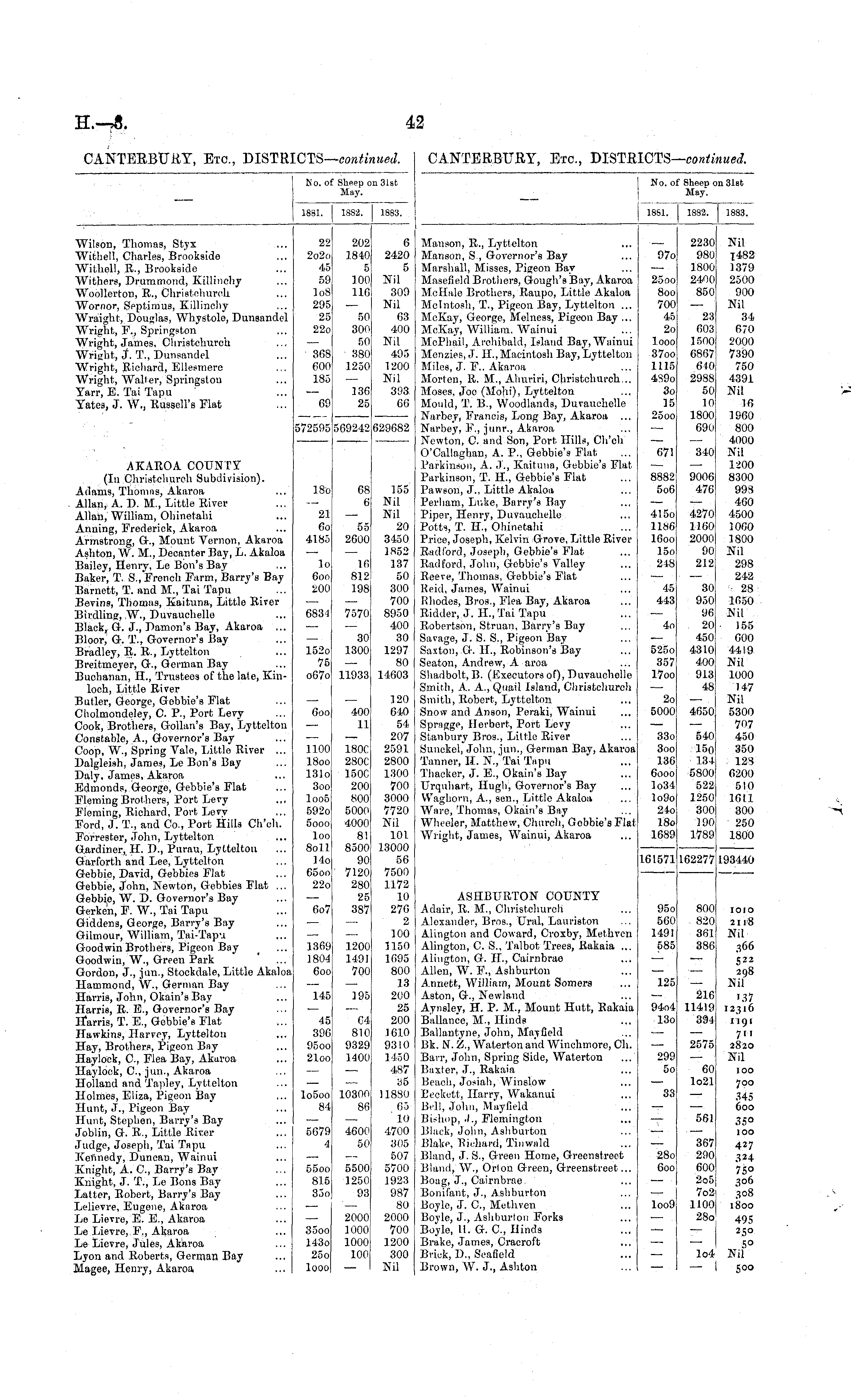 No. of Sheep on 31st May. 18S1. J 1882. I 1883. Mausori, R., Lyttelton Manson, S , Governor's Bay Marshall, Misses, Pigeon Bay Masefield Brotliere, Q-ougli's Bay, Akaroa McHale Brothers, Raupo, LitlJe Akaloa Mclntosli, T., Pigeon Bay, Lyttelton ... McKay, George, Melness, Pigeon Bay ... McKay, William. Wainui McPhail, Archibald, Island Bay,Wainui Menzies, J. H., Macintosh Bay, Lyttelton Miles, J. F., Akaroa Morten, R, M., Ahuriri, Christclmi'ch... Moses, Joe (Molii), Lyttelton Mould, T. B., Woodlands, Duvauehe'le Narbey, Francis, Long Bay, Akaroa ... Narbey, F,, junr., Akaroa Newton, C. and Son, Port Hills, Ch'cli O'Callaghan, A. P., Gebbie's Flat Parkinson, A. J., Kaifnna, Gebbie's Flat Parkinson, T. EC., Gebbie's Flat Pawson, J., Little Akaloa Perham, Lr.ke, Barry's Bay Piper, Henry, Duvauchelle Pott?, T. H., Ohinetahi Price, Joseph, Kelvin Grove, Littlo Rivor Bedford, Joseph, Gebbie's Flat Radford, John, Gebbie's Valley Reeve, Thomas, Gebbie's Flat Reid, James, Wainui Rhodes, Bros., Flea Bay, Akaroa Ridder, J. H., Tai Tapu Robertson, Struan, Barn's Bay Savage, J. S. S., Pigeon Bay Saxton, G. H,, Robinson's Bay Seaton, Andrew, A aroa Staadbolfc, B. (Executors of), Duvauchelle Smith, A. A., Quail Island, Christehurch Smith, Robert, Lyttelton Snow and Anson, Peraki, Wainui Sprngge, Herbert, Port Levy Stanbury Bros., Little River Sunckel, John, jun., German Bay, Akaroa Tanner, 11. N., Tai Tnpn Thacker, J. E., Okain's Bay Urquhart, Hugh, Governor's Bay Waghorn, A., sen., Little Akaloa Ware, Thomas, Okain's Bay Wheeler, Matthew, Church, Gebbie'eFlat Wright, James, Wainui, Akaroa 97o 25oo 8oo 700 45 2o looo 37oo 1115 4S9o 3o 15 25oo 671 8882 5o6 415o 1186 16oo 15o 218 2230 980 1800 2400 850 23 603 1500 6867 6«) 2938 50 10 1800 690 340 9006 476 4270 1160 2000 90 212 Nil 1482 3379 2500 900 Nil 34 670 2000 7390 750 4391 Nil 16 I960 800 4000 Nil 1200 8300 998 460 4500 1060 1800 Nil 298 242 28 1050 Nil 155 600 4419 Nil 1000 147 Nil 5300 707 450 350 12S 6200 510 1611 300 250 1800 45 443 4o 30 950 96 20 450 4310 400 913 48 525o 357 17oo 2o 5000 4650 33o 3oo 136 6ooo ]o34 3o9o 24o 18o 1689 540 150 13+ 5800 522 1250 300 190 1789 161571 162277 193440 ASHBTTRTON COUNTY Adair, R. M., Cliristehurch Alexander, Bros., Ural, Lauriston Alington and Coward, Crosby, Methvcn Alington, C. S., Talbot Trees, liakaia ... Alington, G. H., Cairnbrae Allen, W. F., Ashburton Annett, William, Mount Somers Aston, G., Newland Aynsley, H. P. M., Mount Hutt, Rakaia Ballance, M., Hinds Ballantyne, John, May field Bk. N. '£., Waterton and Winchmore, Ch. Barr, John, Spring Side, Waterton Baxter, J., Rakaia ... Beach, Josiah, Winslow Beckett, Harry, Wakanui Bell, John, Mayfield Bishop, .1., Fleminglou Black, John, Ashburton Blake, Richard, Tinwald Bland, J. S., Green Home, Greenstreet Bland, W., Orion Green, Greenstreet... Boag, J., Cairnbrae Bonifant, J., Ashburton Boyle, J. C, Methven Boyle, J., Ashburton Forks Boyle, II. G. C, Hinds Brake, James, Cracroft Brick, D., SeaEeld Brown, W. J., Ashton 95o 560 1491 585 125 94o4 13o 299 5o 800 820 361 386 216 11419 394 2575 60 Io21 1010 2118 Nil 366 522 298 Nil 137 12316 1191 711 2820 Nil 100 700 345 600 35° 100 427 324 75° 3°6 308 1800 495 250 SO Nil I 500 33 561 28o 6oo 367 290 600 2oo 7o2 1100 28o Ioo9 Io4