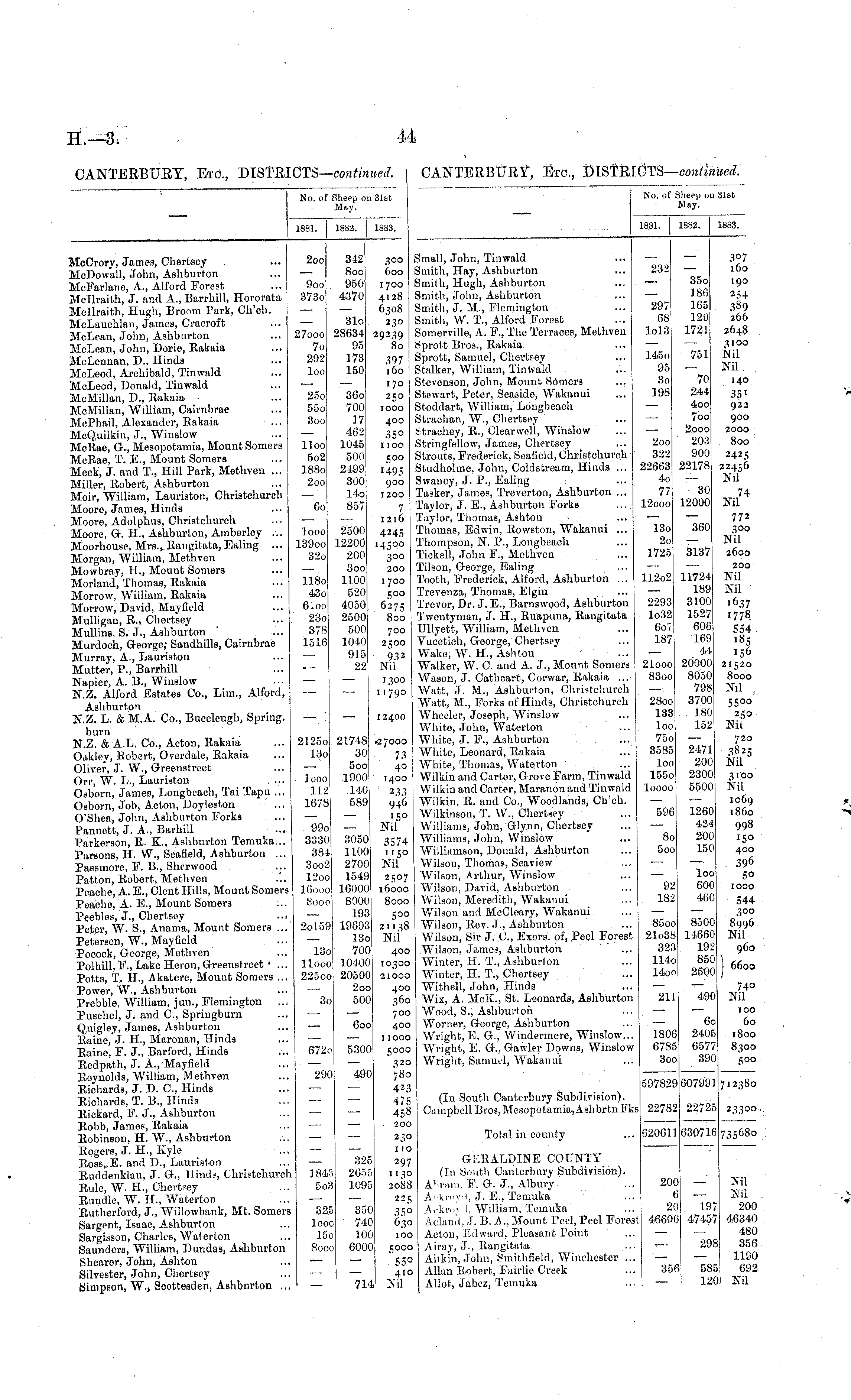 No. of Shet'p on 31st May. 1881. 1882. 1883. McCrory, James, Chertsey MeDow'all, John, Asliburton McFarlane, A., Alford Forest Mcllraith, J. and A., Barrhill, Hororata Mcllraith, Hugh, Broom Park, Ch'ch. McLauchlan, James, Ci'aoroft McLean, John, Ashburton McLean, John, Dorie, Bakaia McLennan, D.. Hinds McLeod, Archibald, Tinwald McLeod, Donald, Tinwald McMillan, D., Rakaia • McMillan, William, Caimbrae McPhail, Alexander, Kakaia McQuilkin, J., Winslow Mcliae, Gr., Mesopotamia, Mount Somers McRae, T. E., Mount Somers Meek, J. and T., Hill Park, Methven ... Miller, Bobert, Ashburton Moir, Winiam, Lauriston, Christchurch Moore, James, Hinds Moore, Adolphus, Christchurch Moore, Gh H., Ashburton, Amberloy ... Moorhouse, Mrs., Bangitata, Baling ... Morgan, William, Methven Mowbray, H., Mount Somers Morland, Thomas, Bakaia Morrow, William, Rakaia Morrow, David, Mayfield Mulligan, R., Chertsey Mullins. S. J., Ashburton Murdoch, George, , Sandhills, Caimbrae Murray, A., Lauriston Mutter, P., Barrhill Napier, A. B., Winslow N.Z. Alford Estates Co., Lun., Alford, Ashburton N.Z. L. & M.A. Co., Buccleugh, Spring. burn N.Z. & A.L. Co., Acton, Rakaia Oakley, Kobert, Overdale, Bakaia Oliver, J. W., Greenstreet On , , W. L., Lauriston ... Osborn, James, Longbeach, Tai Tapu ... Osborn, Job, Acton, Doyleston O'Shea, John, Ashburton Forks Pannett, J. A., Barhill Parkerson, B. K., Asliburton Temuka... Parsons, H. W., Seafteld, Ashburtou ... Passmore, F. B., Sherwood Patton, Bobert, Methven Peache, A. E., Clent Hills, Mount Somers Peache, A.. B., Mount Somers Peebles, J., Chertsey Peter, W. S., Anama, Mount Somers ... Petereen, W., Mayfield Pocock, George, Methven Polhill, E., Lake Heron, Grreensfreet ' ... Potts, T. H., Akatere, Mount Somers ... Power, W., Ashburton Prebble, William, jun., Flernington Puschel, J. and C, Springburn Quigley, James, Ashburton Baine, J. H., Maronan, Hinde Baine, F. J., Barford, Hinde Bedpath, J. A., Mayfield Beynolds, William, Methven Bichards, J. D. C, Hinds Bichards, T. B., Hinds Bickard, F. J., Ashburton Bobb, James, Bakaia Bobiiison, H. W., Ashburton Kogers, J. H., Kyle and D., Lauriston Buddenklau, J. Gr., Hindp, Christchurch Bule, W. H., Chertsey Bundle, W. H., Waterton Butherford, J., Willowbank, Mt. Somers Sargent, Isaac, Ashburton Sargisson, Charles, Walerton Saundere, William, Dundas, Ashburton Shearer, John, Ash ton Silvester, John, Chertsey Simpson, W., Soottesden, Ashbnrton ... 2oo 9oo 373o 312 8oo 950 4370 3OO 600 1700 4128 6308 2.50 29239 80 397 160 170 250 1000 27ooo ! 7o 292 loo 31o 28634 : 95 173 150 25o 55o 3oo lloo 5o2 I880 2oo 36o 700 17 462 1045 500 2499 300 14o 857 400 35° 1100 500 H95 900 1200 60 7 1216 4245 14500 300 200 looo 139oo 32o 2500 12200 200 3 oo 1100 520 4050 2500 500 1040 915 22 II80 43o 6*oo 23o 378 1516 1700 500 6275 800 700 2500 932 Nil 1300 11790 12400 2125o 13o ]ooo 112 1678 21748 , 30 5oo 1900 140 589 »2 7OOO 73 40 1400 233 946 «5° Nil 3574 1150 Nil 99o 3330 384 3oo2 12 00 I6000 8000 3050 1100 2700 1549 16000 8000 193 19893 13o 700 10400 20500 2oo 500 2507 16000 8000 2o.l59 500 21138 Nil 13o n.000 225oo 400 10300 21000 3o 672o 290 6oo 5300 490 400 360 700 400 11000 5000 320 780 423 475 458 200 230 110 184S 5o3 325 2655 1095 297 i 1130 . 2088 325 looo 15c 8000 350 740 100 6000 225 ' 35° ) 630 ) 100 ) 5000 55° 410 I Nil 714