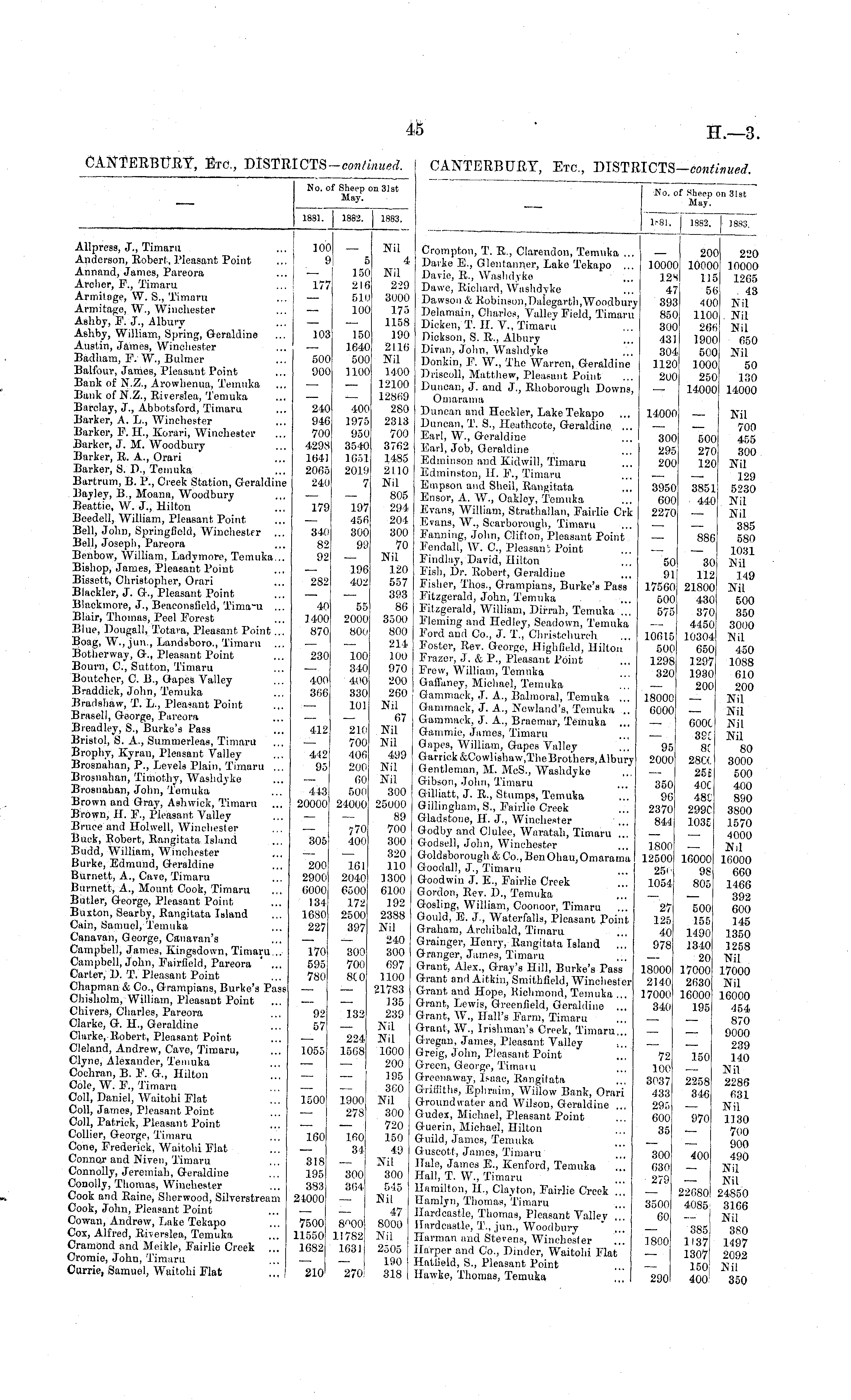 No. of Sheep on 31st May. 1881. I 1882. I 1883. Allpress, J., Timaru Anderson, Robert, Pleasant Point Annand, James, Pareora Arolier, F., Timaru Armitoge, W. S., Timaru Armitage, W., Winchester Ashby, F. J., Albury Ashby, William, Spring, Geraldine Austin, James, Winchester Badham, F. W., Buhner Balfour, James, Pleasant Point Bank of N.Z., Arowhenua, Temuka Bank of N.Z., Riverslea, 'J'omuka Barclay, J., Abbotsford, Timaru Barker, A. L., Winchester Barker, l< 1 . II., Korari, Winchester Barker, J. M. Woodbury Barker, R. A., Orari Barker, S. l>., Tenmka Bartrum, B. P., Creek Station, Geraldine Bayley, B., Moana, Woodbury Beattie, W. J., Hilton Beedell, William, Pleasant Point Bell, John, Springfield, Winchester Bell, Joseph, Pareora Benbow, William, Ladymore, Temuka... Bishop, James, Pleasant Point Bissett, Christopher, Orari Blnckler, J. G., Pleasant Point Blaekmore, J., Beaconsfield, Tima-u ... Blair, Thomas, Peel Forest Blue, Dougall, Totara, Pleasant Point... Boag, W., jun., Landsboro., Timaru Botherway, G., Pleasant Point Bourn, C, Button, Timaru Bouteher, C. B., Gapes Valley Braddick, John, Temuka Brarishaw, T. L., Pleasant Point Brasell, George, Pureora Breadley, S., Burke's Pass Bristol, S. A., Summerleas, Timaru Brophy, Kyran, Pleasant Valley Brosnahan, P., Levels Plain, Timaru ... Brosnahan, Timothy, Washdyke Brosnahan, Jolm, Temuka Brown and Gray, Aehwick, Timaru Brown, II. F., Pleasant Valley Brnoe and Hohvell, Winchester Buck, Eobert, Kangitata Island Budd, William, Winchester Burke, Edmund, Geraldine Burnett, A., Cave, Timaru Burnett, A., Mount Cook, Timaru Butler, George, Pleasant Point Buxton, Searby, Rangitata Inland Cain, Samuel, Temuka Canavan, George, Canavan's Campbell, James, Kingsdown, Timaru... Campbell, John, Fairiield, Pareora ' ... Carter, l>. T. Pleasant Point Chapman & Co., Grampians, Burke's Pass Chisholm, William, Pleasant Point Chivers, Charles, Pareora Clarke, G. II., Geraldine Clarke, Robert, Pleasant Point Cleland, Andrew, Cave, Timaru, Clyne, Alexander, Temuka Cochran, B. F. G., Hilton Cole, W. F., Timaru Coll, Daniel, Waitohi Flat Coll, James, Pleasant Point Coll, Patrick, Pleasant Point Collior, George, Timaru Cone, Frederick, Waitohi Flat Connor and Niven, Timaru Connolly, Jeremiah, Geraldiue Conolly, Thomas, Winchester Cook and Raine, Sherwood, Silverstream Cook, John, Pleasant Point Cowan, Andrew, Lake Tekapo Cox, Alfred, Biverslea, Temuka Cramond and Meikle, Fairlie Creek Cromie, John, Timaru Currie, Samuel, Waitohi Flat 100 Q 150 216 510 100 Nil 4 I 177 103 500 900 240 946 700 429H 1641 2065 240 179 340 82 92 282 40 1400 870 230 400 366 412 442 95 150 1640 500 ] 100 40(i 1975 950 3540 1651 2019 197 456 300 99 196 402 55 2000 800 100 310 400 330 101 210 700 40R 200 60 500 24000 Nil 229 3000 175 1158 190 2116 Nil 1400 12100 12869 280 2313 700 3763 1485 2110 Nil 805 294 20-1 300 70 Nil 120 557 393 80 350O 800 214 100 970 200 260 Nil (17 Nil Nil 499 Nil Nil 300 25000 89 700 300 320 110 1300 6100 192 2388 Nil 240 300 697 noo 21783 135 239 Nil Nil 1G00 200 195 3G0 Nil 300 720 150 49 Nil 300 545 Nil 47 8000 Nil 2505 190 318 413 20000 305 770 400 200 2900 6000 134 1680 227 161 2040 6500 17* 2500 397 170 595 780 300 700 810 92 57 132 1055 224 1508 1500 1900 278 160 lfiO 34 318 195 383 21000 300 364 7500 11550 1682 8 n 00 11782 1631 A i 1 210 i I J I 270