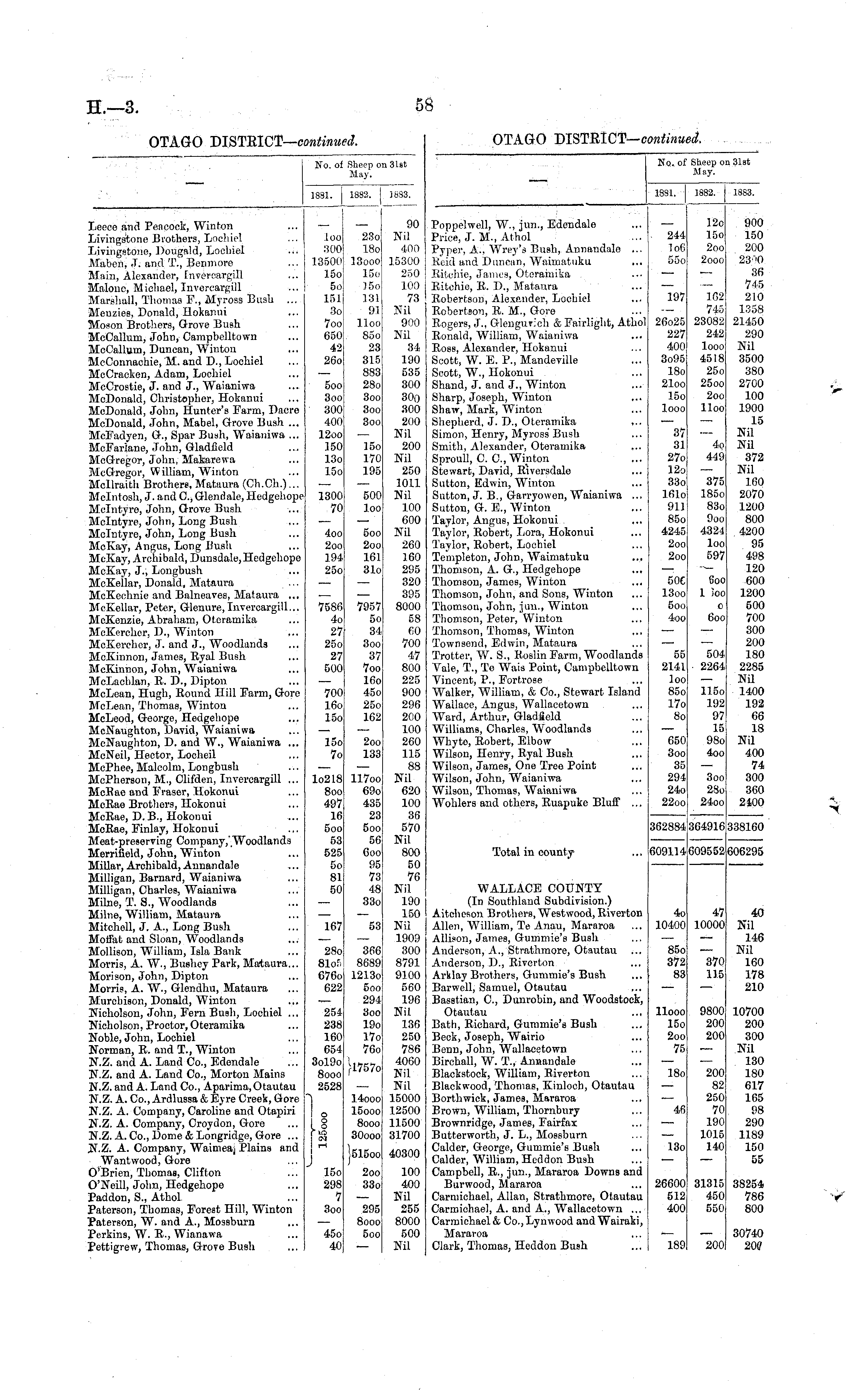 No. of Sheep on 31st May. 1881. 1882. I 1883. Leece and Pencoek, Winton Livingstone Brothers, Loehiel Livingstone, Dougald, Lochiel ... j Mabon, J. and T., Benmore ... I Main, Alexander, fnvereargill Millone, Michael, Invereargill Marshall, Thomas F., Myross Bush ... Meuzies, Donald, Hokanui Moson Brothers, Grove Bush McCallum, John, Campbelltown McCallurn, Duncan, Winton McConnachie, M. and D., Lochiel McCraeken, Adam, Loehiel McCrostie, J. and J., Waianiwa McDonald, Christopher, Hokanui McDonald, John, Hunter's Farm, Dacre McDonald, John, Mabel, Grove Bush ... MeFadyen, &., Spar Bush, Waianiwa ... McFariane, John, Gladfield McGregor, John, Makarewa McGregor, W illiam, Winton Mcllraith Brothers, Mataura (Ch.Ch.)... Mclntosh, J. and C, Gleniiale, Hedgehope McTntyre, John, Grove Bush Mclntyre, John, Long Bush Mclntyre, John, Long Bush McKay, Angus, Long Bush McKay, Archibald, Dunsdale, Hedgehope McKay, J.; Longbush McKellar, Donald, Mataura McKechnie and Balneaves, Mataura ... McKellar, Peter, Glenure, InTercargill... McKenzie, Abraham, Oteramika MeKercher, D., Winton McKercher, J. and J., Woodlands McKinnon, James, Byal Bush McKinnon, John, Waianiwa McLachlan, B. D., Dipton McLean, Hugh, Bound Hill Farm, Gore McLean, Thomas, Winton McLeod, George, Hedgehope McNaughton, David, Waianiwa McNaughton, D. and W., Waianiwa ... McNeil, Hector, Locheil McPhee, Malcolm, Longbush McPherson, M., Clifden, Invercargill ... McBae and Fraser, Hokonui McBae Brothers, Hokonui McEae, D. B., Hokonui _ McBae, Finlay, Hokonui Meat-preserving Company,'Woodlands Merrifield, John, Winton Millar, Archibald, Annandale Milligan, Barnard, Waianiwa Milligan, Charles, Waianiwa Milne, T. S., Woodlands Milne, William, Mataura Mitchell, J. A., Long Bush Moffat and Sloan, Woodlands Mollison, William, Isla Bank Morris, A. W., Bushey Park, Mataura... Mori son, John, Dipton Morris, A. W., Glendhu, Mataura Murchison, Donald, Wintou Nicholson, John, Fern Bush, Lochiel ... Nicholson, Proctor, Oteramika Noble, John, Lochiel Norman, B. and T., Winton N.Z. and A. Land Co., Edendale N.Z. and A. Land Co., Morton Mains N.Z. and A. Land Co., Aparima, Otautau N.Z. A. Co., Ardlussa & Eyre Creek, Gore N.Z. A. Company, Caroline and Otapiri N.Z. A. Company, Croydon, Goro N.Z. A. Co., Dome & Longridge, Gore ... N.Z. A. Company, Waimeaj Plains and Wantwood, Gore O'Brien, Thomas, Clifton O'Neill, John, Hedgehope Paddon, S., Athol Paterson, Thomas, Forest Hill, Winton Paterson, W. and A., Moseburn Perkins, W. K., Wianawa Pettigrew, Thomas, Grove Bush 1 001 800 I 13500 15o 5o 151 3o 7oo 650 42 26o 5oo 8oo 300 400 12oo 150 13o 15o 1300 70 4oo 2oo 194 25o 7586 4o 27 25o 27 500 700 16o 15o 15o 7o 23o 18o 13ooo 15o ]5o 131 91 lloo Soo 23 315 883 28o 3oo 3oo 3oo 15o 170 195 500 loo 5oo 2oo 161 31o 7957 5o 34 3oo 37 7oo 16o 45o 25o 162 2oo 133 90 Nil 400 15300 250 100 73 Nil 900 Nil 34 190 535 300 300 300 200 Nil 200 Nil 250 1011 Nil 100 600 Nil 260 160 295 320 395 8000 58 fiO 700 47 800 225 900 296 200 100 260 115 88 Nil 620 100 36 570 Nil 800 50 76 Nil 190 150 Nil 1909 300 8791 9100 560 196 Nil 136 250 786 4060 Nil Nil 15000 12500 11500 31700 40300 Io218 8oo 497 16 5oo 53 525 5o 81 50 117oo 69o 435 23 5 oo 56 6oo 95 73 48 33o 167 53 28o 81of. 676o 622 366 8689 1213o 5 oo 294 3oo 19o 17o 76o 254 238 160 654 3ol9o 8ooo 2528 l r 1757o 1, I o L O 1MI I r-l 14ooo 15ooo 8ooo 30ooo J515oo J 15o 298 7 3oo 2oo 33o 295 8ooo 5oo 100 400 Nil 255 8000 500 Nil 45o 40