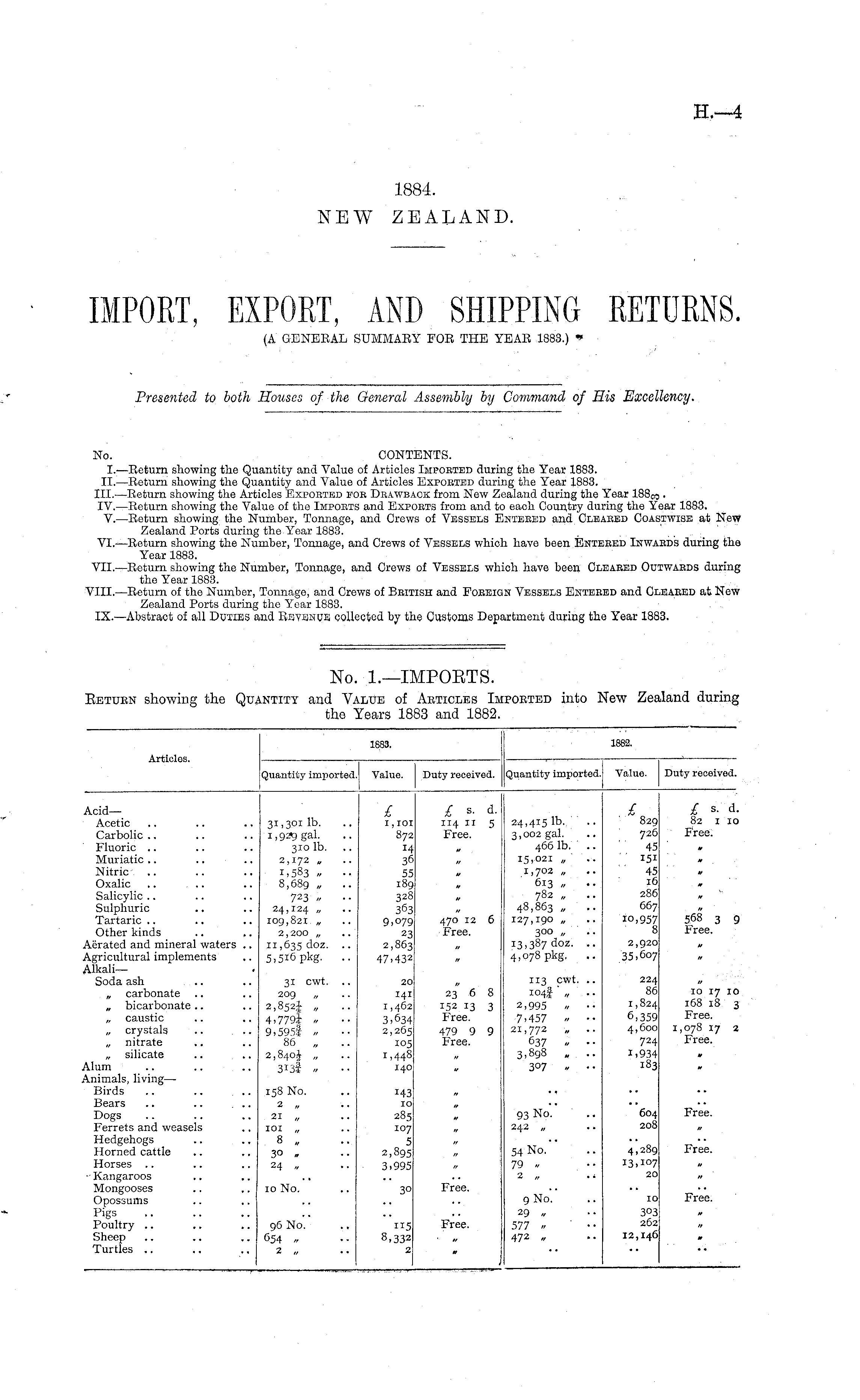 No. 1.—IMPORTS. Return showing the Quantity and Value of Articles Imported into New Zealand during the Years 1883 and 1882.