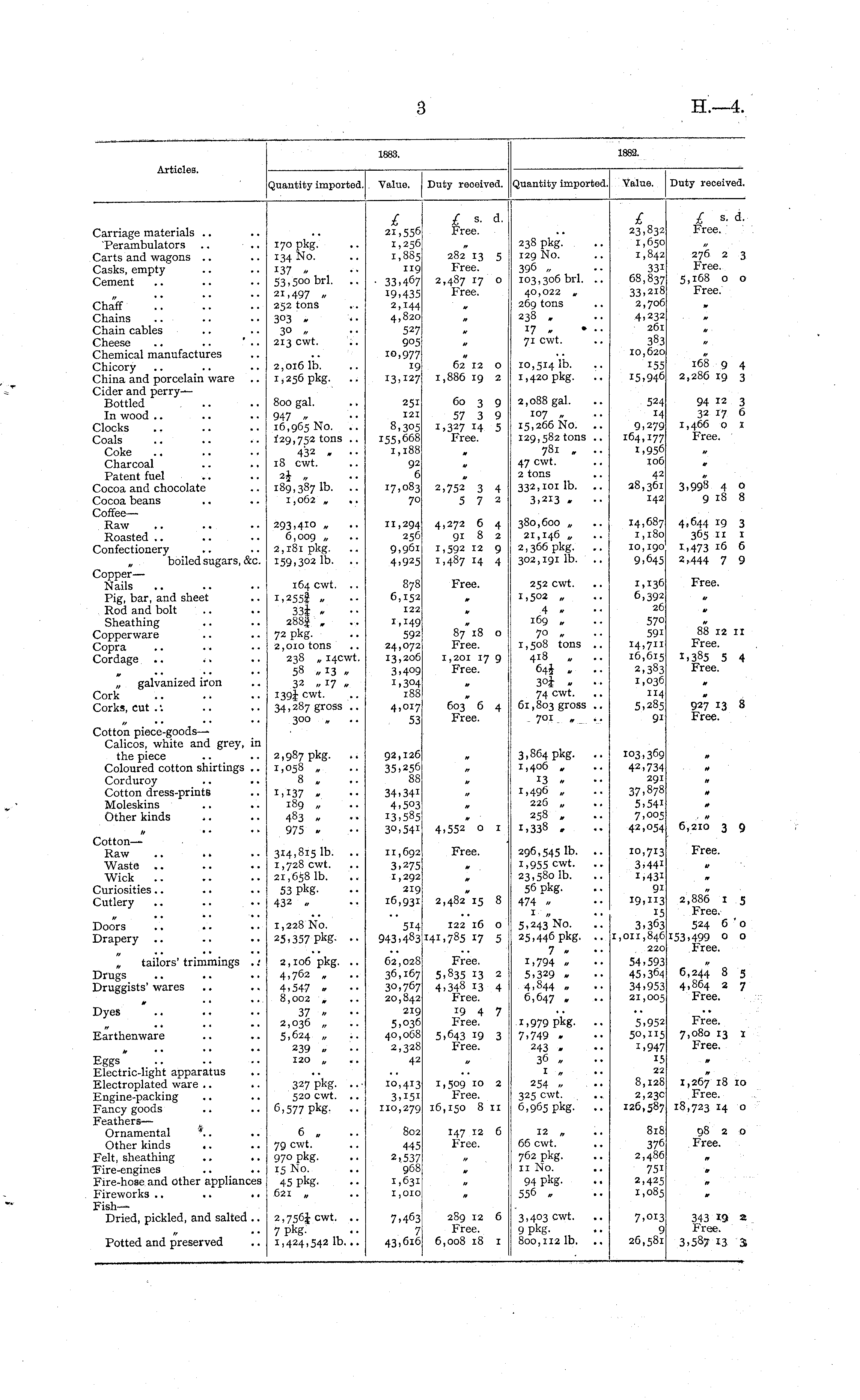 1883. 1882. Articles. Quantity imported. Value. Duty recoived. Quantity imported. Value. Duty reoeived. £ 21,556 1,256 1,885 119 ■ 33,467 19,435 2,144 4,820 527 905 10,977 19 I3,!27 Free. £ 23,832 1,650 1,842 331 68,837 33,218 2,706 4,232 261 383 10,620 155 15,946 £ s. d. rree. Carriage materials 'Perambulators Carts and wagons Casks, empty Cement 170 pkg. 134 No. 137 v. ■ •■ 53,500 brl. 21,497 . 252 tons 3°3 » 3° » 213 cwt. 282 13 5 Free. 2,487 17 o Free. 238 pkg. 129 No. 396 „ 103,306 brl. .. 40,022 „ 269 tons 238 . 17 » * ■• 71 cwt. 276 2 3 Free. 5,168 o o Free. Chaff Chains Chain cables Cheese .. . ■ Chemical manufactures Chicory China and porcelain ware Cider and perryBottled In wood Clocks Coals Coke Charcoal Patent fuel Cocoa and chocolate Cocoa beans CoffeeRaw Roasted Confectionery „ boiled sugars, &c. Copper— Nails Pig, bar, and sheet Rod and bolt Sheathing Copperware Copra Cordage 2,016 lb. 1,256 pkg. 800 gal. . ■ 947 » 16,965 No. f29,752 tons .. 432 - 18 cwt. 2j „ 189,3871b. .. 1,062 „ ,. 251 121 8,305 155,668 I,l88 92 6 I7,° 8 3 70 62 12 o 1,886 19 2 60 3 9 57 3 9 1,327 14 5 Free. 0 2,752 3 4 5 7 2 10,5141b. 1,420 pkg. 2,088 gal. 107 „ 15,266 No. 129,582 tons .. 781 , •• 47 cwt. 2 tons 332,101 lb. 3.213 - 524 9,279 164,177 1,956 106 42 28,361 142 168 9 4 2,286 19 3 94 12 3 32 17 6 1,466 o 1 Free. tr 3,998 4 0 9 18 8 293,410 „ 6,009 „ 2,181 pkg. 159,302 lb. 11,294 256 9,961 4,925 4,272 6 4 91 8 2 1,592 12 9 1,487 14 4 380,600 „ 21,146 „ 2,366 pkg. 302,191 lb. 14,687 1,180 10,190 9,645 4.644 *9 3 365 11 1 1,473 16 6 2,444 7 9 164 cwt. i,255i „ 33l » •• 288| , 72 pkg. 2,010 tons 238 „ 14CWL 58 »I3 » 32 ./ 17 » I39i cwt - 34,287 gross .. 300 „ 878 6,152 122 1,149 592 24,072 13,206 3,409 1,304 188 4,017 53 Free. 252 cwt. 1,502 „ 4 * 169 „ 70 „ 1,508 tons .. 418 64J . •• 3o£ . -. 74 cwt. 61,803 gross .. 701 „ .. 1,136 6,392 26 570 591 14,711 16,615 2,383 1,036 114 5,285 91 Free. 87"18 o Free. 1,201 17 9 Free. 88 12 ir Free. l>385 5 4 Free. „ galvanized iron Cork Corks, cut . -. 603 6 4 Free. 927 13 8 Free. Cotton piece-goods — Calicos, white and grey, in the piece Coloured cotton shirtings .. Corduroy Cotton dress-prints Moleskins Other kinds 2,987 pkg. 1,058 „ 8 „ 92,126 35,256 88 34.34 1 4,503 13,585 30,541 3,864 pkg. .. 1,406 „ 103,369 42,734 291 37,878 5.54 1 7,005 42,054 1,137 » 189 „ 483 . 975 . H 13 » 1,496 „ 226 „ 258 „ 1,338 , 4,552 O I 6,210 3 9 Cotton — Raw Waste .. Wick Curiosities Cutlery 314,815 lb. 1,728 cwt. 21,658 lb. 53 pkg432 » 11,692 3,275 1,292 219 16,931 Free. 0 296,5451b. .. 1,955 cwt. 23,580 lb. 56 pkg. 474 » 1 „ 5,243 No. 25,446 pkg. .. 7 » 1,794 » 5,329 . 4,844 „ «. 6,647 , 10,713 3.441 i,43i 9i 19."3 15 3,363 1,011,846 220 54,593 45,364 34,953 21,005 Free. If Doors Drapery .. 1,228 No. 25,357 P k S- ■• 514 943,4 8 3 2,482*15 8 122 16 0 141,785 17 5 2,886 1 5 Free. 524 6 o 153.499 o o Free. „ tailors' trimmings . : Drugs Druggists' wares Dyes 2,106 pkg. .. 4,762 „ 4,547 » 8,002 „ 37 » 2,036 „ 5,624 „ 239 „ 120 „ 62,028 36,167 30,767 20,842 219 5,036 40,068 2,328 42 Free. 5.835 13 2 4,348 13 4 Free. 19 4 7 Free. 5,643 19 3 Free. 1,979 pkg. .. 7.749 . 243 « 36 . Iff • . 254 „ 325 cwt. 6,965 pkg. 5,952 50,115 i,947 15 22 8,128 2,23c 126,587 6,244 8 5 4,864 2 7 Free. Free. 7,080 13 i Free. Earthenware Eggs* Electric-light apparatus Electroplated ware Engine-packing Fancy goods FeathersOrnamental Other kinds Felt, sheathing "Fire-engines .. .. Fire-hose and other appliances Fireworks .. .. .. FishDried, pickled, and salted .. 327 pkg. .. ■ 520 cwt. .. 6.577 Pkg- •• 6 . 79 cwt. 970 pkg. 15 No. 45 Pkg. 621 „ 10,413 3.151 110,279 802 445 2>,537 968 1,631 1,010 1,509 10 2 Free. 16,150 8 11 147 12 6 Free. 12 , 66 cwt. 762 pkg. 11 No. 94 P k g556 .. 818 376 2,486 751 2,425 1,085 & 1,267 J 8 10 Free. 18,723 14 o 98 2 o Free. ft W a n cwt. .. 7 pkg. 1,424,542 lb... 7,463 7 43,616 289 12 6 Free. 6,008 18 1 3,403 cwt. 9 Pkg800,112 lb. 7, OI 3 9 26,581 343 19 2 Free. 3.587 13 3s Potted and preserved ..
