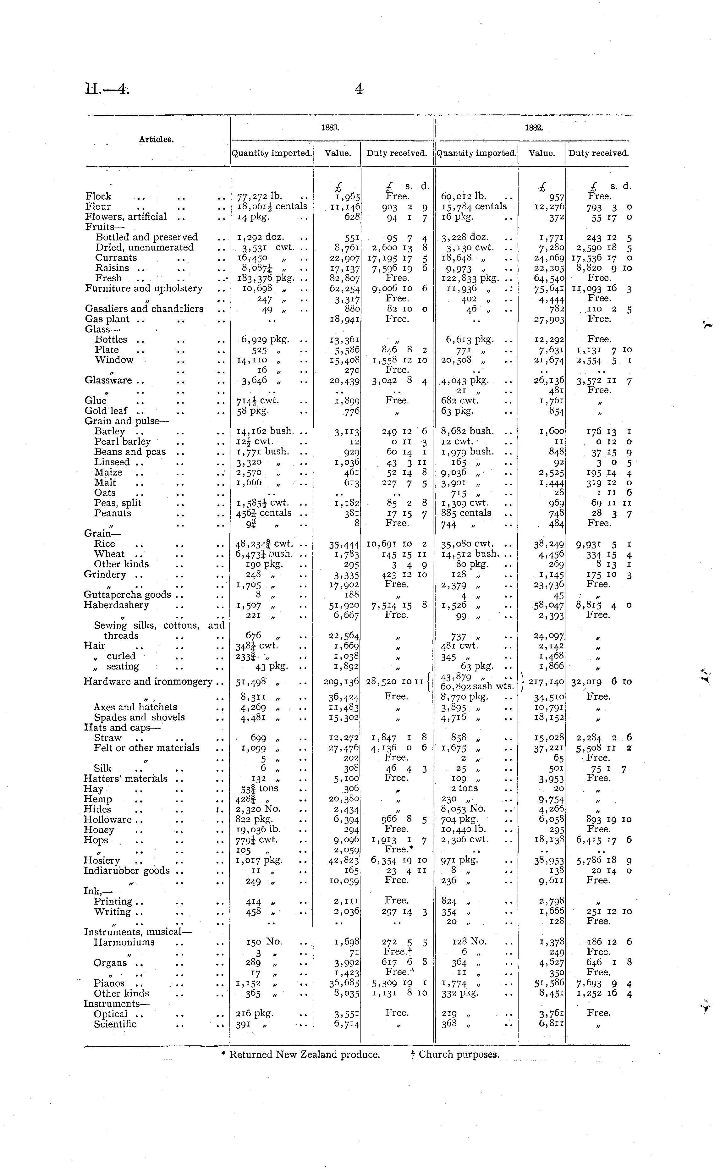 Articles. Quantity imported. Value. Duty received. Quantity imported. Value. Duty received. Flock Flour Flowers, artificial FruitsBottled and preserved Dried, unenumerated Currants Raisins Fresh Furniture and upholstery 77,272 lb. 18,061 J centals 14 pkg. £ 1,965 11,146 628 £ ■• d. Free. 903 2 9 94 1 7 60,012 lb. 15,784 centals 16 pkg. £ 957 12,276 372 I s. d. Free. 793 3 o 55 17 o 1,292 doz. 3,531 cwt. .. 16,450 „ 8,o8 7 J „ .. 183,376 pkg. .. 10,698 „ 247 „ . - 49 „ •• 551 8,761 22,907 17,137 82,807 62,254 3.317 880 95 7 4 2,600 13 8 i7. x 95 17 5 7,596 19 6 Free. 9,006 10 6 Free. 82 10 o Free. 3,228 doz. 3,130 cwt. 18,648 „ 9.973 „ 122,833 pkg. •• 11,936 „ .: 402 „ 46 „ .. t>771 7,280 24,069 22,205 64,540 75,641 4.444 782 27.903 243 12 5 2,590 18 5 17,536 17 o 8,820 9 10 Free. 11,093 J 6 3 Free, no 2 5 Free. Gasaliers and chandeliers Gas plant GlassBottles Plate Window 6,929 pkg. .. 525 ,, 14,110 „ 16 „ 3,646 „ 18,941 13,361 5,586 15,408 270 20,439 846" 8 2 1,558 12 10 Free. 3,042 8 4 6,613 pkg. .. 77 1 » 20,508 „ 4.043 pkg. •• 21 „ 682 cwt. 63 pkg. 12,292 7> 6 3i 21,674 Free. 1,131 7 10 2,554 5 1 Glassware 26,136 481 1,761 854 3,572 11 7 Free. Glue" .. '.'. '.'. Gold leaf Grain and pulse — Barley Pearl barley Beans and peas Linseed Maize Malt Oats Peas, split Peanuts 714J cwt. 58 pkg. 1,899 776 Free. 14,162 bush. .. 12j cwt. 1,771 bush. .. 3.320 „ 2,570 „ 1,666 „ 3.113 12 929 1,036 461 613 249 12 6 o 11 3 60 14 1 43 3 11 52 14 8 227 7 5 8,682 bush. .. 12 cwt. 1,979 bush. .. 165 „ 9,036 „ 3,901 „ 715 „ 1,309 cwt. 885 centals .. 744 „ 1,600 11 848 92 2,525 1,444 28 969 748 484 176 13 1 0 12 o 37 15 9 305 195 14 4 319 12 O 1 11 6 69 11 11 28 3 7 Free. 1,585} cwt. .. 456J centals .. 1,182 381 8 85 2 8 17 15 7 Free. GrainRice Wheat .. Other kinds Grindery 48,234f cwt. .. 6,473jbush. .. 190 pkg. 248 „ i,7°5 „ 8 „ 1,507 „ 221 „ 35,444 1,783 295 3.335 17,902 188 51,920 6,667 10,691 10 2 145 15 11 3 4 9 423 12 10 Free. 35,080 cwt. .. 14,512 bush. .. 80 pkg. 128 „ 2,379 » 4 if 1,526 „ 99 » 38,249 4.456 269 I,i45 23.736 45 58,047 2,393 9>93i 5 1 334 15 4 8 13 1 175 10 3 Free. Guttapercha goods Haberdashery 7.5H 15 8 Free. 8,815 4 o Free. Sewing silks, cottons, and threads Hair „ curled „ seating 676 „ 3 4 8| cwt. 2331 « 43 pkg- • ■ 22,564 1,669 1,038 1,892 737 » 481 cwt. 345 „ 63 pkg. .. 43.879 „ 60,892 sash wts. 8,770 pkg. 3.895 « 4,7 I( 5 » 24,097 2,142 1,468 1,866 Hardware and ironmongery .. 51,498 „ 209,136 28,520 10 11 - Free. - 217,140 32,019 6 10 Free. Axes and hatchets Spades and shovels Hats and caps — Straw .. Felt or other materials 8,311 „ 4,269 „ 4,481 „ 36,424 ",483 15,302 34.510 10,791 18,152 699 „ 1,099 „ 5 „ 6 „ 132 „ 53f tons 428I „ 2,320 No. 822 pkg. 19,036 lb. 779I cwt. 105 „ 1,017 pkg. .. 11 „ 249 „ 12,272 27,476 202 308 5,100 306 20,380 2,434 6,394 294 9,096 2,059 42,823 165 10,059 1,847 1 8 4,136 o 6 Free. 46 4 3 Free. 858 „ 1,675 „ 2 „ 25 -, 109 „ 2 tons 230 „ 8,053 No. 704 pkg. 10,440 lb. 2,306 cwt. 15,028 37,221 65 501 3,953 20 9,754 4,266 6,058 295 18,13s 2,284 2 6 5,508 11 2 Free. 75 1 7 Free. Silk Hatters' materials Hay Hemp Hides .. .. :. Holloware Honey Hops .. .. .. *> H 966 8 5 Free. 893 19 10 Free. i>913 1 7 Free.* 6,415 17 6 Hosiery Indiarubber goods 6,354 19 10 23 4 11 Free. 971 pkg. 8 „ 236 „ 38,953 138 9,611 5,786 18 9 20 14 o Free. Ink,— Printing Writing 414 v 458 . 2,111 2,036 Free. 297 14 3 824 „ 354 ,, 20 „ 2,798 1,666 128 251 12 10 Free. Instruments, musical— Harmoniums 150 No. 3 » 289 „ 17 r, 1,152 „ 365 . 1,698 7i 3,992 1,423 36,685 8,035 272 5 5 Free.t 617 6 8 Free.f 5.3O9 19 1 1,131 8 10 128 No. 6 „ » 11 „ 1,774 „ 332 pkg. i,378 249 4,627 35O 51,586 8,45i 186 12 6 Free. 646 1 8 Free, 7,693 9 4 1,252 16 4 Organs Pianos Other kinds Instruments — Optical .. .. .. Scientific 216 pkg. 391 * 3,55i 6,714 Free. 219 „ 368 „ 3,76i 6,811 Free. * Returned New Zealand iroduce. t Church ;ur; rases.