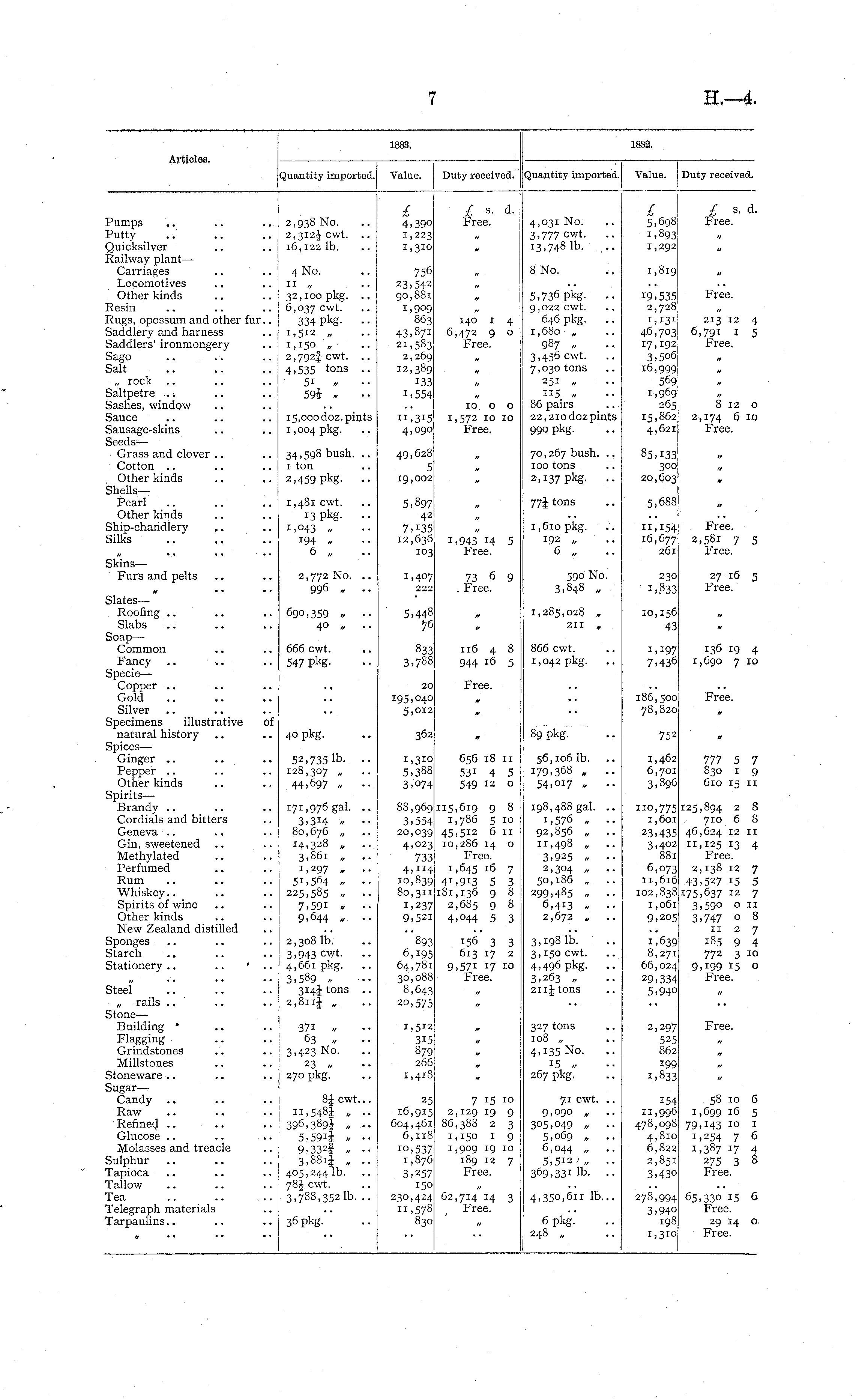 Articles. Quantity imported. Value. Duty received. Quantity imported. Value. Duty received. £ 4,39O 1,223 1,310 £ s. d. Free. 4,031 No. 3,777 cwt. .. 13,7481b. £ 5,698 1,893 1,292 £ s. d. Free. Pumps Putty Quicksilver Railway plant— Carriages Locomotives Other kinds Resin Rugs, opossum and other fur.. Saddlery and harness Saddlers' ironmongery Sago Salt „ rock Saltpetre .: Sashes, window 2,938 No. cwt. .. 16,122 lb. 4 No. ii// 32,100 pkg. .. 6,037 cwt. 334 pkg. 1,512 „ 1,150 „ 2,792! cwt. ... 4,535 tons .. 51 » 59i » 756 23,542 90,881 1,909 863 43,871 21,583 2,269 12,389 133 1,554 8 No. 1,819 5,736 pkg. 9,022 cwt. 646 pkg. 1,680 „ 987 » 3,456 cwt. 7,030 tons 251 „ 115 . 86 pairs 22,2iodozpints 990 pkg. ' .. 19,535! 2,728 1,131 46,703 17,192 3,506 16,999 569 1,969 265 15,862 4,621 Free. 140 1 4 6,472 9 o Free. 213 12 4 6,791 1 5 Free. Sauce Sausage-skins Seeds— Grass and clover Cotton Other kinds ShellsPearl Other kinds Ship-chandlery Silks 15,000 doz. pints 1,004 pkg. ",315 4,090 10 o o 1,572 10 10 Free. 8 12 o 2,174 6 10 Free. 34,598 bush. .. 1 ton 2,459 pkg. .. 49,628 5 19,002 70,267 bush. .. 100 tons 2,137 pkg85,133 300 20,603 1,481 cwt. 13 pkg. .. 1,043 „ 194 » 6 „ 5,897 42! 7, T 35 12,636 103 77J tons 5,688 1,943 14 5 Free. 1,610 pkg. .. 192 „ 6 „ 11.154 16,677 261 Free. 2,581 7 5 Free. SkinsFurs and pelts 2,772 No. .. 996 » 1,407 222 73 6 9 . Free. 590 No. 3,848 „ 230 1,833 27 16 5 Free. SlatesRoofing Slabs .. Soap— Common Fancy .. Specie — Copper Gold Silver .. Specimens illustrative of natural history Spices— Ginger Pepper Other kinds Spirits— Brandy Cordials and bitters Geneva Gin, sweetened Methylated Perfumed Rum Whiskey Spirits of wine Other kinds New Zealand distilled 690,359 // •■ 40 „ .. 666 cwt. 547 Pkg40 pkg. 52,7351b. .. 128,307 „ 44,697 „ 5,448 76 833 3,788 20 195,040 5,012 362 1,310 5,388 3,°74 116 4 8 944 16 5 Free. * 656 18 11 531 4 5 549 12 o 1,285,028 „ 211 „ 866 cwt. 1,042 pkg. 89 pkg. 56,106 lb. 179,368 „ .. 54,017 0 10,156 43 1,197 7,436 186,500 78,820 752 1,462 6,701 3,896 V 136 ig 4 1,690 7 10 Free. u 777 5 7 830 1 9 610 15 II 171,976 gal. .. 3,3i4 » •• 80,676 „ 14,328 „ .. 3,861 „ .. 1,297 „ 51,564 ,/ •• 225,585 „ .. 7,59i „ .. 9,644 » •• 88,969 3,554 20,039 4,°23 733 4,114 10,839 80,311 1,237 9,5"-i 115,619 g 8 1,786 5 10 45,512 6 11 10,286 14 o Free. 1,645 16 7 4i,9i3 5 3 181,136 9 8 2,685 9 8 4,O44 5 3 198,488 gal. .. 1,576 . -• 92,856 , .. 11,498 „ 3,925 „ ■• 2,304 „ 50,186 „ 299,485 „ .. 6,413 „ 2,672 „ .. 110,775 1,601 23,435 3,402 881 6,073 11,616 102,838 1,061 9,205 125,894 2 8 710 6 8 46,624 12 11 11,125 13 4 Free. 2,138 12 7 43,527 15 5 175,637 12 7 3,590 on 3.747 ° 8 11 2 7 185 9 4 772 3 10 9,199 15 o Free. Sponges Starch Stationery .. .. ' 2,308 lb. 3,943 cwt. 4,661 pkg. 3,589 „ 314J tons .. 2,8ll| „ 893 6,195 64,781 30,088 8,643 2o,575 156 3 3 613 17 2 9,571 17 10 Free. 3,1981b. 3,150 cwt. 4,496 pkg. 3,263 „ 2iijtons 1,639 8,271 66,024 29,334 5,94° Steel „ rails Stone — Building " Flagging Grindstones Millstones Stoneware Sugar— Candy Raw Refined Glucose Molasses and treacle Sulphur Tapioca Tallow Tea Telegraph materials Tarpaulins.. .. .. 371 » 63 „ 3,423 No. 23 « 270 pkg. 8J cwt... 11,548! „ .. 396,389! „ .. 5,59-ii » •■ 9,332! ,/ .. 3 ,88iJ „ .. 405,2441b. .. 78 J cwt. 3,788,3521b. .. 1,512 315 879 266 1,418 25 16,915 604,461 6,118 io,537 1,876 3,257 150 230,424 ii,578 830 7 IS 10 2,129 19 9 86,388 2 3 1,150 1 9 1,909 19 10 189 12 7 Free. 327 tons 108 „ 4,135 No. 15 „ 267 pkg. 71 cwt. .. 9,090 „ 305,049 „ .. 5,069 „ .. 6,044 „ 5,512 „ .. 369,3311b. .. 2,297 525 862 199 1,833 154 11,996 478,098 4,810 6,822 2,851 3.430 Free. 58 10 6 1,699 16 5 79,143 10 1 1,254 7 6 i>387 17 4 275 3 8 Free. 62,714 14 3 Free. 4,350,611 lb... 6 pkg. 248 „ 278,994 3,940 198 1,310 65,330 15 6 Free. 29 14 o. Free. 36 pkg.