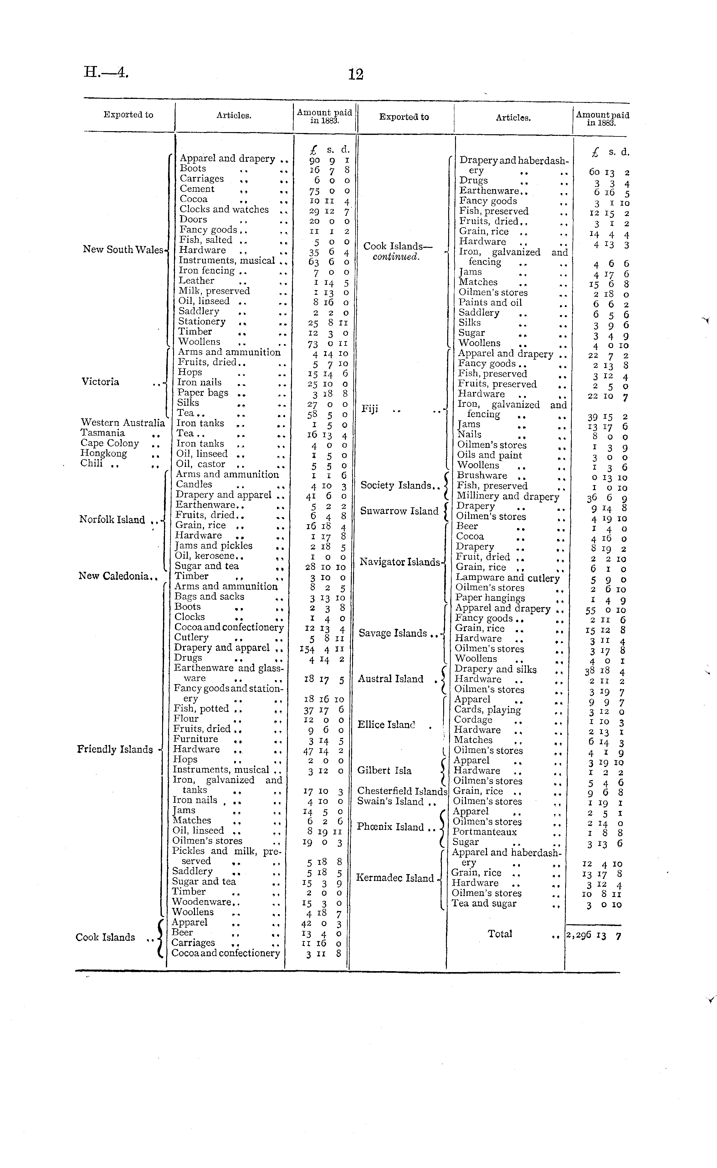 Exported to Articles. -mount paii in 1883. Exported to Articles. Amount paid in 1883. Apparel and drapery . Boots Carriages ,, „ Cement ,, , Cocoa Clocks and watches . Doors ,, Fancy goods., Fish, salted ,, , Hardware ■, Instruments, musical . Iron fencing .. Leather Milk, preserved Oil, linseed .. Saddlery . ■ . Stationery ,. . Timber Woollens ,. , Arms and ammunition Fruits, dried.. Hops Iron nails Paper bags .. Silks Tea Iron tanks .. .. Tea Iron tanks .., Oil, linseed ., Oil, castor ,. Arms and ammunition Candles .. ., Drapery and apparel .. Earthenware,. ,, Fruits, dried.. Grain, rice .. Hardware .. ,. Jams and pickles .. Oil, kerosene., ,, Sugar and tea ,, Timber ., ,. Arms and ammunition Bags and sacks Boots ., ,, Clocks .. ,, Cocoa and confectionery Cutlery .. ., Drapery and apparel ,, Drugs Earthenware and glass- £ s. d 90 9 1 16 7 8 600 75 o 0 10 11 4 29 12 7 20 o o Drapery and haberdash ery Drugs ., Earthenware,, , Fancy goods , Fish, preserved Fruits, dried.. Grain, rice Hardware Iron, galvanized anc fencing Jams Matches Oilmen's stores Paints and oil . Saddlery ., Silks Sugar .. Woollens Apparel and drapery . Fancy goods .. Fish,preserved . Fruits, preserved Hardware Iron, galvanized anc fencing ., ,. Jams Nails Oilmen's stores ,, Oils and paint Woollens ., Brushware ., ,, Fish, preserved ,, Millinery and drapery Drapery .. ., Oilmen's stores Beer Cocoa ,, ., Drapery .. ,, Fruit, dried ,. ,, Grain, rice ,, ,, Lampware and cutlery Oilmen's stores ,, Paper hangings ,, Apparel and drapery ., Fancy goods .. Grain, rice .. ,, Hardware .. ,, Oilmen's stores ., Woollens ., ., Drapery and silks Hardware ,. ,, Oilmen's stores ., Apparel ,. ,\, Cards, playing ,, Cordage Hardware ., Watches ,, ,, Oilmen's stores ., Apparel ., hardware Oilmen's stores ., Grain, rice ., ,, Oilmen's stores ,, Apparel ,. ,, Oilmen's stores ,, 'ortmanteaux ., Sugar Apparel and haberdashery ., ,, Grain, rice .. lardware ., ,, Oilmen's stores ., ~ea and sugar ,, £ B. d. Co 13 2 3 3 4 6 16 5 3 1 10 12 15 2 3 1 2 14 4 4 4 J 3 3 Victoria Western Australia Tasmania ,. Cape Colony .. Hongkong ,, Chili ., New South Wales 11 I 2 5 0 0 35 6 4 63 6 o 700 1 14 5 1 13 o 8 16 o 220 25 8 11 12 3 o 73 o 11 4 14 10 5 7 10 15 14 6 25 10 o 3 18 8 27 o o 58 5 o 1 5 o 16 13 4 400 1 5 o 5 5 0 1 1 6 4 10 3 41 6 0 522 648 16 18 4 1 17 8 2 18 s 100 28 10 10 3 10 o 825 3 13 10 2 3 8 140 12 13 4 5 8 11 154 4 11 4 14 2 Fiji .. i Society Islands.. ■ I Cook Islands— continued. 466 4 17 6 15 6 8 2 18 o 662 656 3 9 6 3 4 9 4 o 10 22 7 2 2 13 8 3 12 4 250 22 10 7 39 15 2 13 17 6 800 1 3 9 300 1 3 6 0 13 10 1 o 10 36 6 9 g 14 8 4 19 10 140 4 16 o 8 19 2 2 2 10 6 1 o 5 9 0 2 6 10 149 55 o 10 2 11 6 15 12 8 3 11 4 3 17 8 401 38 18 4 2 11 2 3 19 7 9 9 7 3 12 o 1 10 3 2 13 1 6 14 3 4 1 9 3 19 10 122 5 4 6 968 1 19 I 2 5 1 2 14 o 1 8 8 3 13 6 Norfolk Island ... Suwarrow Island ■ i New Caledonia., Navigator Islands - Savage Islands .. - ware ,. Fancy goods and stationery .. ,. 7 ish, potted .. ,, r lour ,, ,, T ruits, dried ,, ,, r urniture ,, ,, hardware ,, lops ,, ., nstruments, musical ., ron, galvanized and tanks ., ron nails , ,» ,, ams ,. ,, ilatches », ,, Oil, linseed Oilmen's stores ., Pickles and milk, preserved ,, addlery ,. ,, ugar and tea ,, 'imber .. ,, Wooden ware,. Woollens Apparel leer ,, ,, Carriages ., ,. Cocoa and confectionery 18 17 5 Austral Island . \ ( 18 16 10 37 17 0 12 o o 960 3 14 5 47 14 2 200 3 12 o Ellice Island . ! I Friendly Islands Gilbert Isla i 17 10 3 4 10 0 14 5 o 6 2 G 8 19 11 19 o 3 Chesterfield Islands Swain's Island ., r Phoenix Island .. 3 5 18 8 5 18 5 l 5 3 9 200 15 3 o 4 18 7 42 o 3 13 4 o 11 16 o 3 11 8 Kermadec Island - 12 4 10 13 17 8 3 12 4 10 8 11 3 o 10 Total 2,296 13 7 took Islands ,.