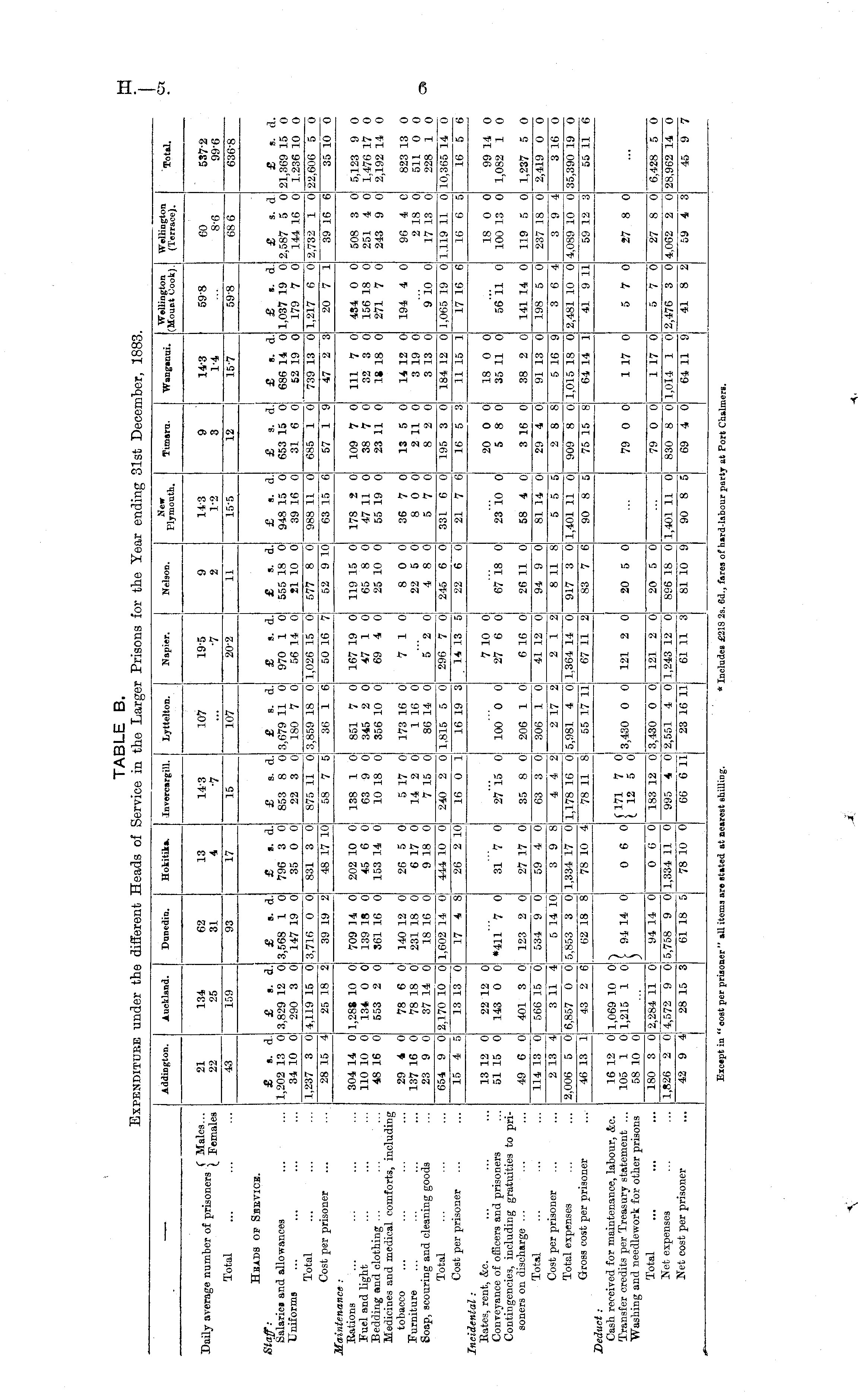 TABLE B. Expenditure under the different Heads of Service in the Larger Prisons for the Year ending 31st December, 1883.