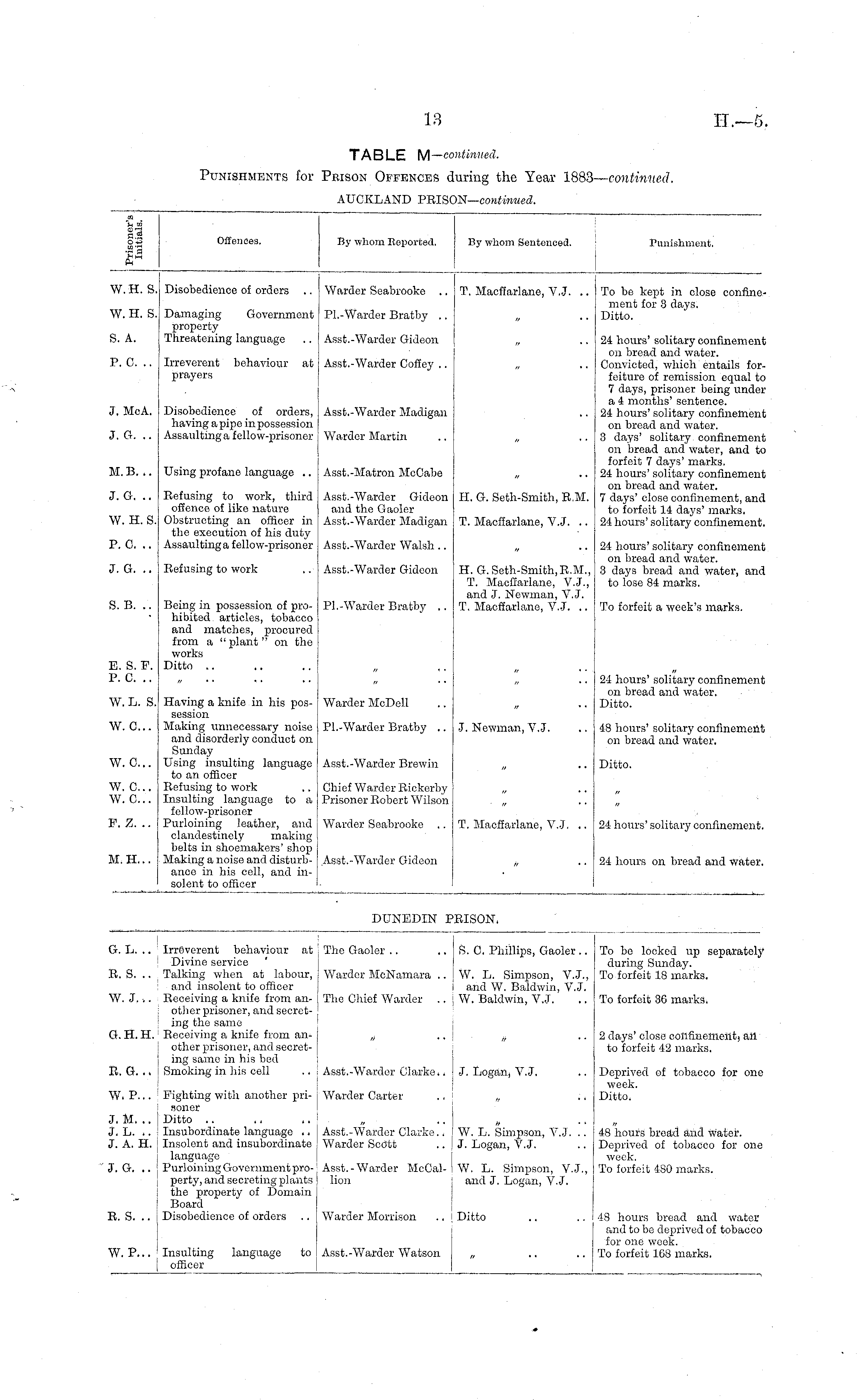 TABLE M— continued. Punishments for Prison Offences during the Year 1883— continued. AUCKLAND PRISON— continued.