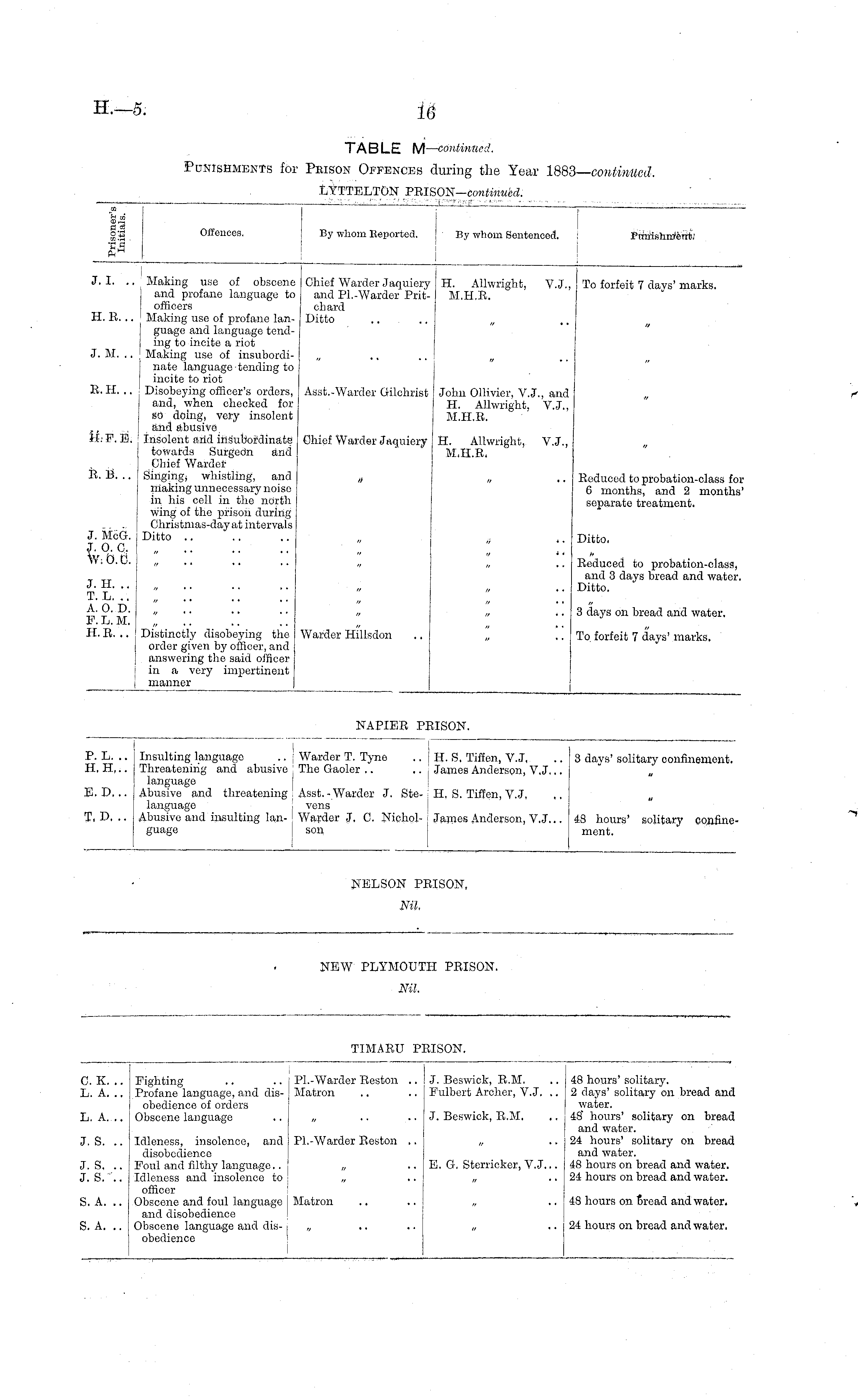 TABLE M — continued. Punishments for Prison Offences during the Year 1883— continued. LYTTELTON PRISON—continued.