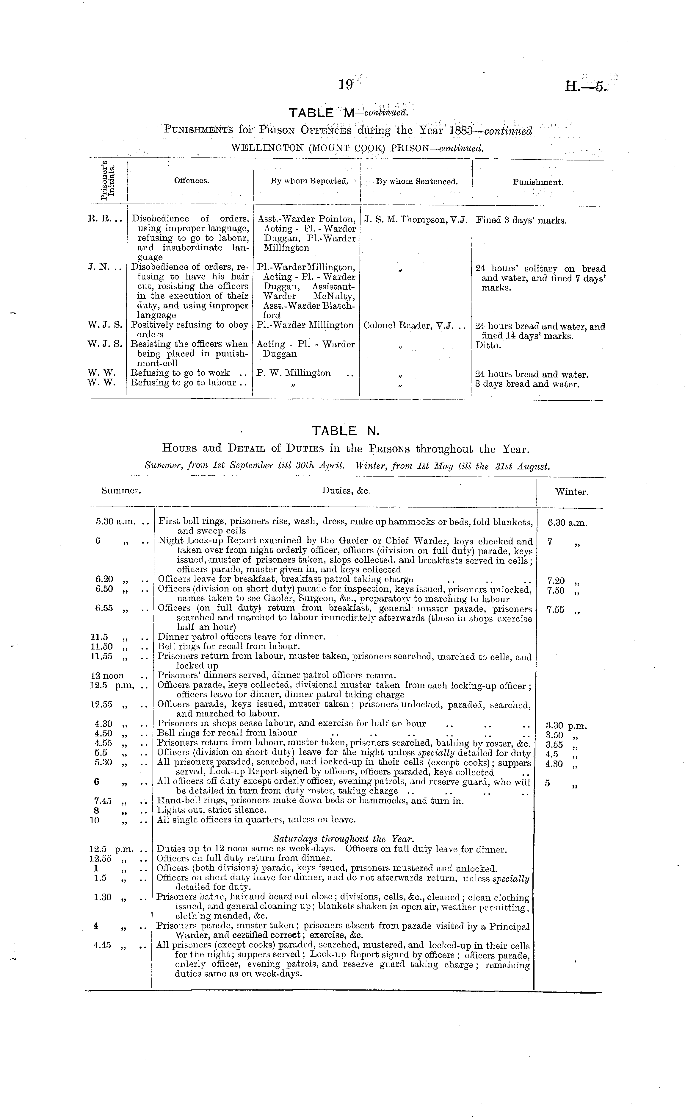 TABLE N. Hours and Detail of Duties in the Prisons throughout the Year. Summer, from 1st September till 30th April. Winter, from 1st May till the 31st August.