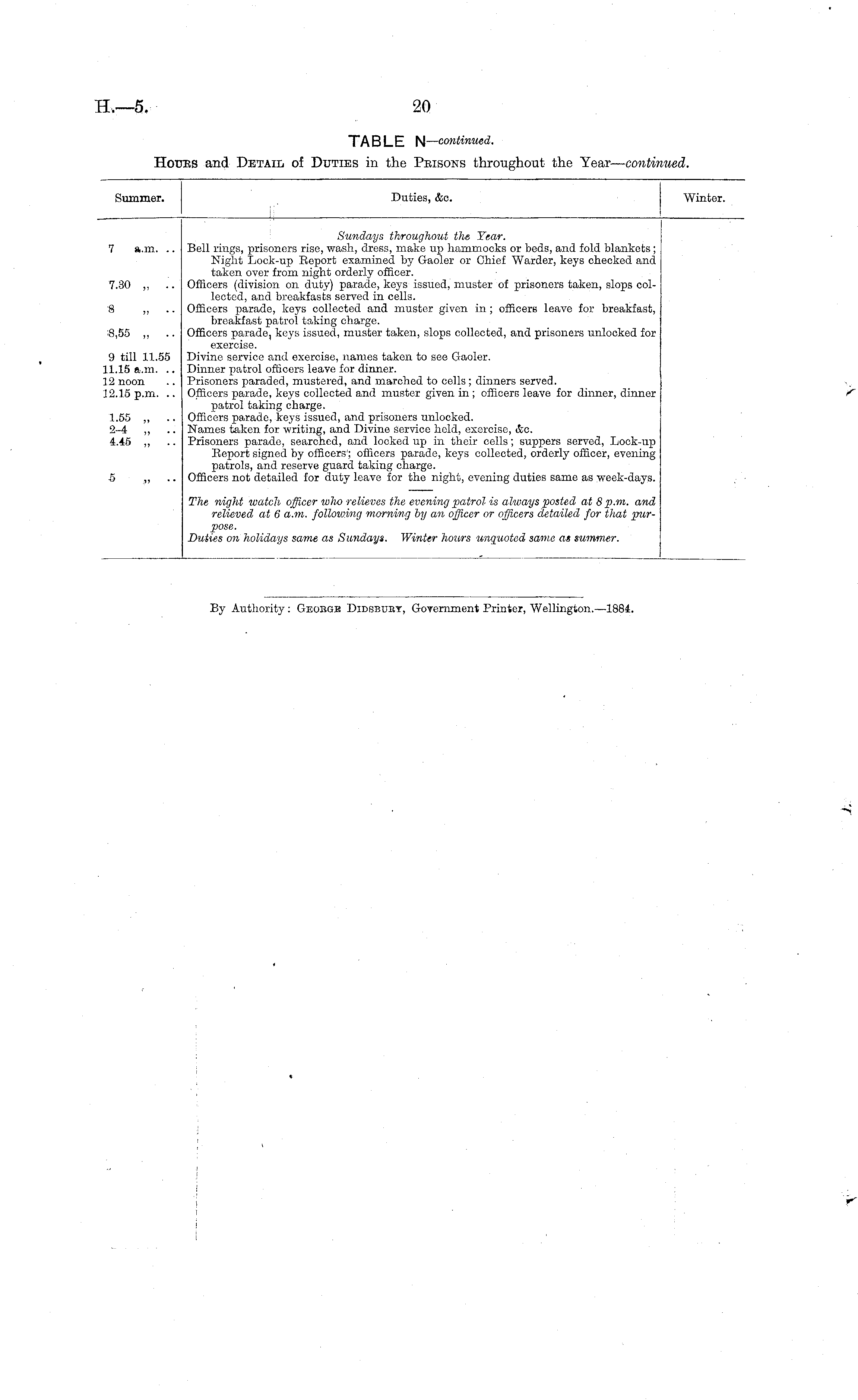 Summer. Duties, &c. Winter. 7 a.m. .. 7.30 „ .'. '8 „ .. «,55 „ .. 9 till 11.55 11.15 a.m. .. L2 noon 12.15 p.m. .. Sundays throughout the Year. Bell rings, prisoners rise, wash, dress, make up hammocks or beds, and fold blankets; Night Lock-up Report examined by Gaoler or Chief Warder, keys checked and taken over from night orderly officer. Officers (division on duty) parade, keys issued, muster of prisoners taken, slops collected, and breakfasts served in cells. Officers parade, keys collected and muster given in ; officers leave for breakfast, breakfast patrol taking charge. Officers parade, keys issued, muster taken, slops collected, and prisoners unlocked for exercise. Divine service and exercise, names taken to see Gaoler. Dinner patrol officers leave for dinner. Prisoners paraded, mustered, and marched to cells ; dinners served. Officers parade, keys collected and muster given in; officers leave for dinner, dinner patrol taking charge. Officers parade, keys issued, and prisoners unlocked. Names taken for writing, and Divine service held, exercise, &o. Prisoners parade, searched, and locked up in their cells; suppers served, Lock-up Report signed by officers'; officers parade, keys collected, orderly officer, evening patrols, and reserve guard taking charge. Officers not detailed for duty leave for the night, evening duties same as week-days. 1.55 „ .. 2-4 „ .. 4.45 „ .. 5 „ .. The night watch officer who relieves the evening patrol is always posted at 8 p.m. and relieved at 6 a.m. following morning by an officer or officers detailed for that purpose. Duties on holidays same as Sundays. Winter hours unquoted same as summer.