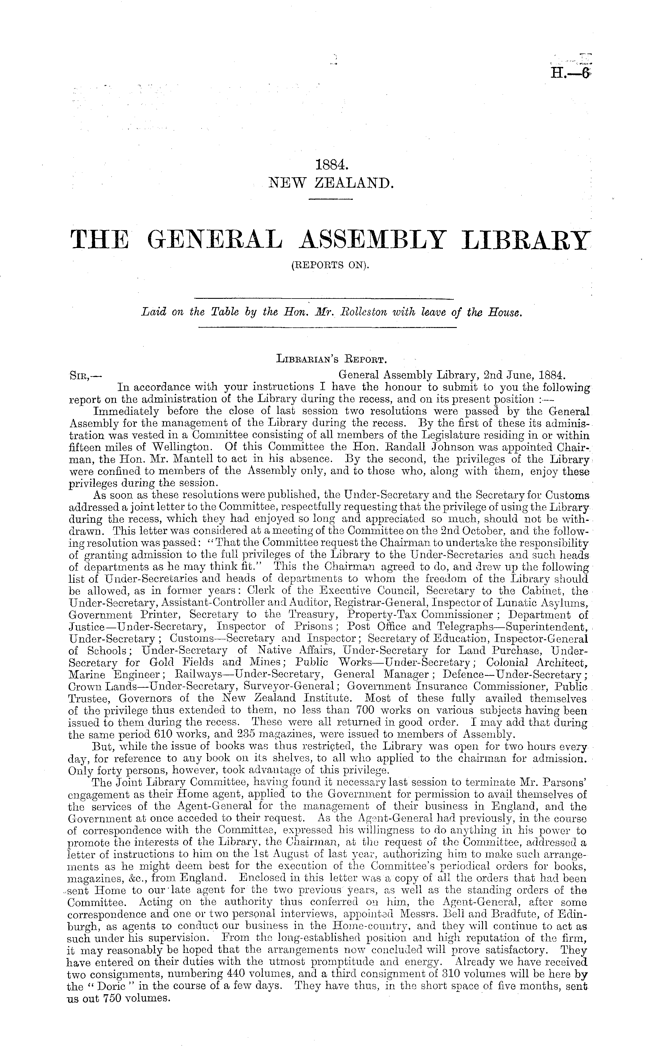 Libbaeian's Eepoet. Sic, — General Assembly Library, 2nd June, 1884. In accordance with your instructions I have the honour to submit to you the following report on the administration of the Library during the recess, and on its present position : — Immediately before the close of last session two resolutions were passed by the General Assembly for the management of the Library during the recess. By the first of these its administration was vested in a Committee consisting of all members of the Legislature residing in or within fifteen miles of Wellington. Of this Committee the Hon. Eandall Johnson was appointed Chair-, man, the Hon. Mr. Mantell to act in his absence. By the second, the privileges of the Library were confined to members of the Assembly only, and to those who, along with them, enjoy these privileges during the session. As soon as these resolutions were published, the Under-Secretary and the Secretary for Customs addressed a joint letter to the Committee, respectfully requesting that the privilege of using the Library during the recess, which they had enjoyed so long and appreciated so much, should not be withdrawn. This letter was considered at a meeting of the Committee on the 2nd October, and the following resolution was passed: "That the Committee request the Chairman to undertake the responsibility of granting admission to the full privileges of the Library to the Under-Secretaries and such heads of departments as he may think fit." This the Chairman agreed to do, and drew up the following list of Under-Secretaries and heads of departments to whom the freedom of the Library should be allowed, as in former years : Clerk of the Executive Council, Secretary to the Cabinet, the Under-Secretary, Assistant-Controller and Auditor, Eegistrar-General, Inspector of Lunatic Asylums, Government Printer, Secretary to the Treasury, Property-Tax Commissioner ; Department of Justice —Under-Secretary, Inspector of Prisons ; Post Office and Telegraphs —Superintendent, Under-Secretary ; Customs—Secretary and Inspector; Secretary of Education, Inspector-General of Schools; Under-Secretary of Native Affairs, Under-Secretary for Land Purchase, UnderSecretary for Gold Fields and Mines; Public Works—Under-Secretary; Colonial Architect, Marine Engineer; Eailways—Under-Secretary, General Manager; Defence—Under-Secretary; Crown Lands —Under-Secretary, Surveyor-General; Government Insurance Commissioner, Public Trustee, Governors of the New Zealand Institute. Most of these fully availed themselves of the privilege thus extended to them, no less than 700 works on various subjects having been issued to them during the recess. These were all returned in good order. I may add that during the same period 610 works, and 235 magazines, were issued to members of Assembly. But, while the issue of books was thus restricted, the Library was open for two hours every day, for reference to any book on its shelves, to all who applied to the chairman for admission. Only forty persons, however, took advantage of this privilege. The Joint Library Committee, having found it necessary last session to terminate Mr. Parsons' engagement as their Home agent, applied to the Government for permission to avail themselves of the services of the Agent-General for the management of their business in England, and the Government at once acceded to their request. As the Agsnt-General had previously, in the course of correspondence with the Committee, expressed his willingness to do anything in his power to promote the interests of the Library, the Chairman, at the request of the Committee, addressed a letter of instructions to him on the Ist August of last year, authorizing him to make such arrangements as he might deem best for the execution of the Committee's periodical orders for books, magazines, &c, from England. Enclosed in this letter was a copy of all the orders that had been •sent Home to our'late agent for the two previous years, as well as the standing orders of the Committee. Acting on the authority thus conferred on him, the Agent-General, after some correspondence and one or two personal interviews, appointed Messrs. Bell and Bradfute, of Edinburgh, as agents to conduct our business in the Home-country, and they will continue to act as such under his supervision. From the long-established position and high reputation of the firm, it may reasonably be hoped that the arrangements now concluded will prove satisfactory. They have entered on their duties with the utmost promptitude and energy. Already we have received two consignments, numbering 440 volumes, and a third consignment of 310 volumes will be here by the " Doric "in the course of a few days. They have thus, in the short space of five months, sent ns out 750 volumes.