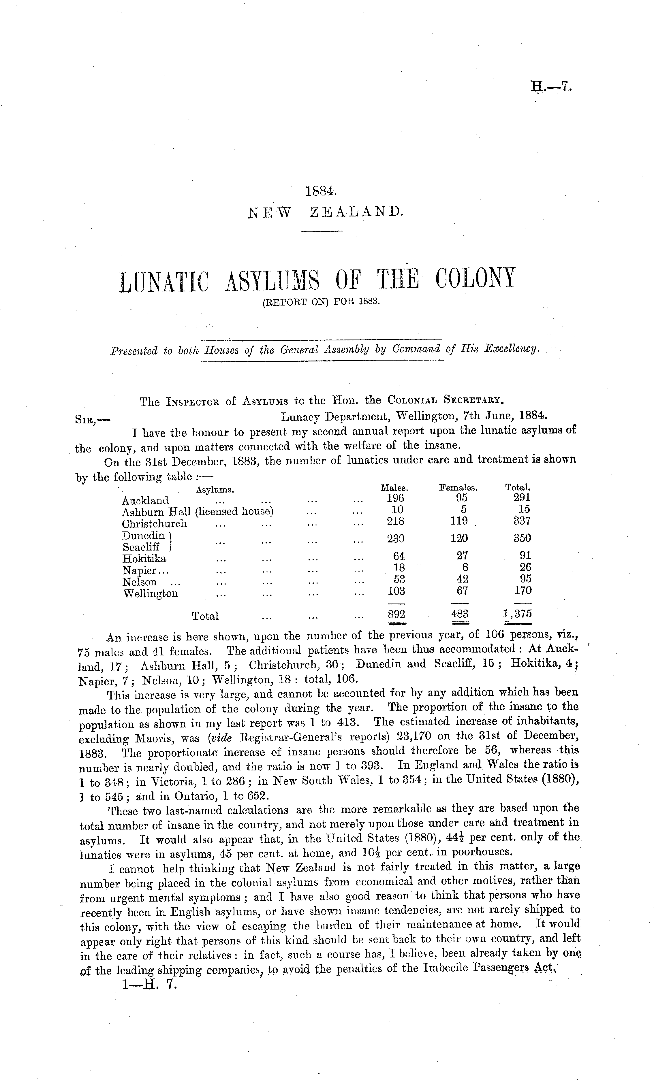 The Inspector of Asylums to the Hon. the Colonial Secretary. g IK __ Lunacy Department, Wellington, 7th June, 1884. I have the honour to present my second annual report upon the lunatic asylums of the colony, and upon matters connected with the welfare of the insane. On the 31st December, 1883, the number of lunatics under care and treatment is shown by the following table : — Asylums Males. Females. Total. Auckland 196 95 291 Ashburn Hall (licensed house) ... ... 10 5 15 Christchurch ... ... ••• ••• 218 119 337 Dunedinj 230 120 350 Seacliff: ) Hokitika 64 27 91 Napier... ... ... ••• ••■ 18 8 26 Nelson ... ... ... •■• ••• 53 42 95 Wellington ... 103 67 170 Total 892 483 1,375 An increase is here shown, upon the number of the previous year, of 106 persons, viz., 75 males and 41 females. The additional patients have been thus accommodated :At Auckland, 17; Ashburn Hall, 5; Christchurch, 30; Dunedin and Seacliff, 15; Hokitika, 4; Napier, 7; Nelson, 10; Wellington, 18 : total, 106. This increase is very large, and cannot be accounted for by any addition which has been made to the population of the colony during the year. The proportion of the insane to the population as shown in my last report was Ito 413. The estimated increase of inhabitants, excluding Maoris, was {vide Registrar-General's reports) 23,170 on the 31st of December, 1883. The proportionate increase of insane persons should therefore be 56, whereas this, number is nearly doubled, and the ratio is now Ito 393. In England and Wales the ratio is Ito 348; in Victoria, Ito 286 ; in New South Wales, 1 to 354; in the United States (1880), Ito 545; and in Ontario, Ito 652. These two last-named calculations are the more remarkable as they are based upon the total number of insane in the country, and not merely upon those under care and treatment in asylums. It would also appear that, in the United States (1880), 44| per cent, only of the lunatics were in asylums, 45 per cent, at home, and 10i per cent, in poorhouses. I cannot help thinking that New Zealand is not fairly treated in this matter, a large number being placed in the colonial asylums from economical and other motives, rather than from urgent mental symptoms ; and I have also good reason to think that persons who have recently been in English asylums, or have shown insane tendencies, are not rarely shipped to this colony, with the view of escaping the burden of their maintenance at home. It would appear only right that persons of this kind should be sent back to their own country, and left in the care' of their relatives : in fact, such a course has, I believe, been already taken by one, of the leading shipping companies, to avoid the penalties of the Imbecile Passengers Act, I—H. 7.