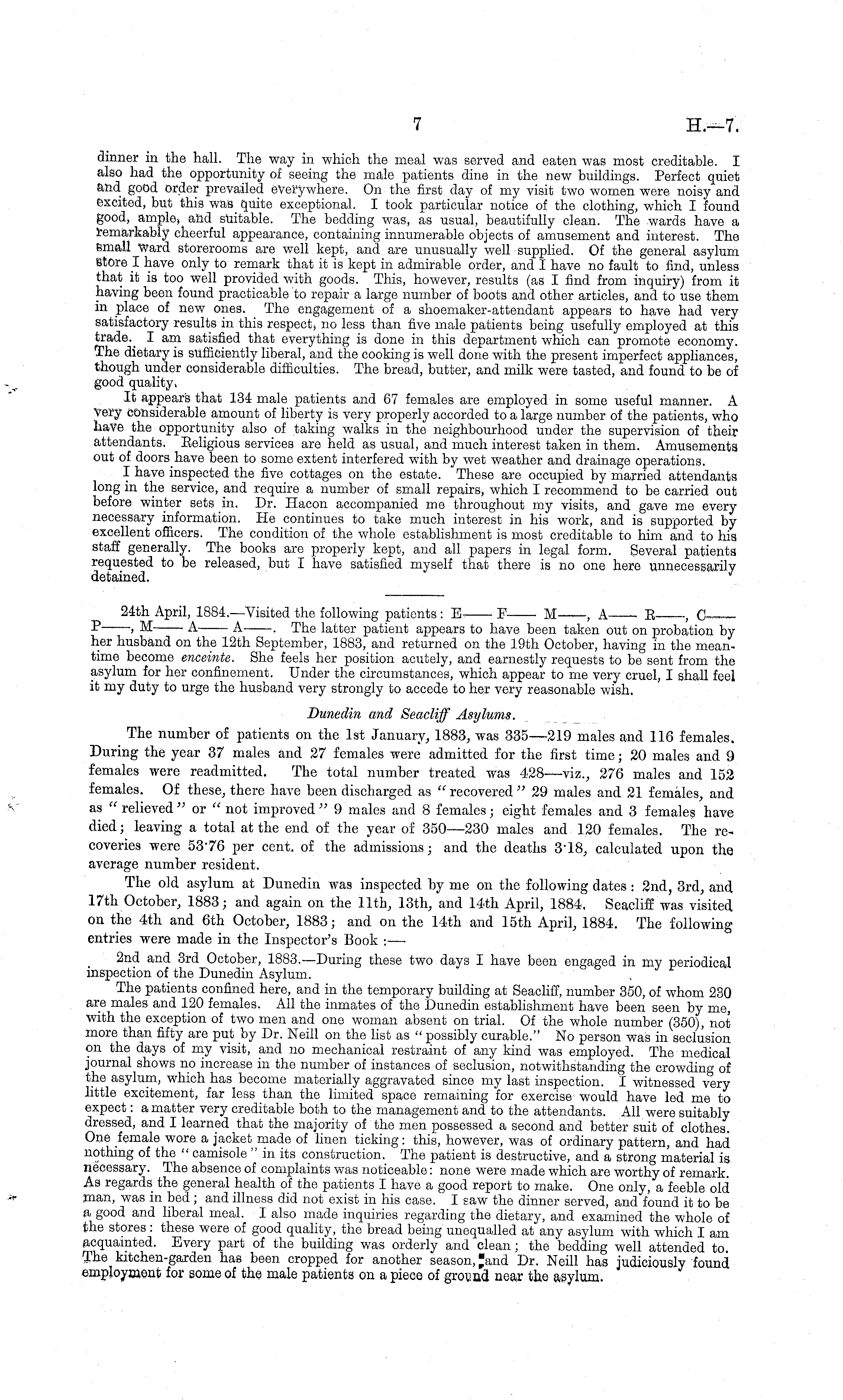 24th April, 1884.—Visited the following patients :E- E M , A R ,C— P ■> M A A . The latter patient appears to have been taken out on probation by her husband on the 12th September, 1883, and returned on the 19th October, having in the meantime become enceinte. She feels her position acutely, and earnestly requests to be sent from the asylum for her confinement. Under the circumstances, which appear to me very cruel, I shall feel it my duty to urge the husband very strongly to accede to her very reasonable wish. Dunedin and Seacliff Asylums. The number of patients on the Ist January, 1883, was 335—219 males and 116 females. During the year 37 males and 27 females were admitted for the first time; 20 males and 9 females were readmitted. The total number treated was 428—viz., 276 males and 152 females. Of these, there have been discharged as " recovered "29 males and 21 females, and as " relieved "or " not improved " 9 males and 8 females; eight females and 3 females have died; leaving a total at the end of the year of 350—230 males and 120 females. The recoveries were 53"76 per cent, of the admissions; and the deaths 3 - 18, calculated upon the average number resident. The old asylum at Dunedin was inspected by me on the following dates : 2nd, 3rd, and 17th October, 1883; and again on the 11th, 13th, and 14th April, 1884. Seacliff was visited on the 4th and 6th October, 1883; and on the 14th and 15th April, 1884. The following entries were made in the Inspector's Book :— 2nd and 3rd October, 1883.—During these two days I have been engaged in my periodical inspection of the Dunedin Asylum. The patients confined here, and in the temporary building at Seacliff, number 350, of whom 230 are males and 120 females. All the inmates of the Dunedin establishment have been seen by me, with the exception of two men and one woman absent on trial. Of the whole number (350), not more than fifty are put by Dr. Neill on the list as " possibly curable." No person was in seclusion on the days of my visit, and no mechanical restraint of any kind was employed. The medical journal shows no increase in the number of instances of seclusion, notwithstanding the crowding of the asylum, which has become materially aggravated since my last inspection. I witnessed very little excitement, far less than the limited space remaining for exercise would have led me to expect: a matter very creditable both to the management and to the attendants. All were suitably dressed, and I learned that the majority of the men possessed a second and better suit of clothes. One female wore a jacket made of linen ticking: this, however, was of ordinary pattern, and had nothing of the " camisole "in its construction. The patient is destructive, and a strong material is necessary. The absence of complaints was noticeable: none were made which are worthy of remark. As regards the general health of the patients I have a good report to make. One only, a feeble old man, was in bed ; and illness did not exist in his case. I saw the dinner served, and found it to be a good and liberal meal. I also made inquiries regarding the dietary, and examined the whole of the stores : these were of good quality, the bread being unequalled at any asylum with which I am acquainted. Every part of the building was orderly and clean; the bedding well attended to The kitchen-garden has been cropped for another season, Jand Dr. Neill has judiciously found employment for some of the male patients on a piece of ground, near the asylum.