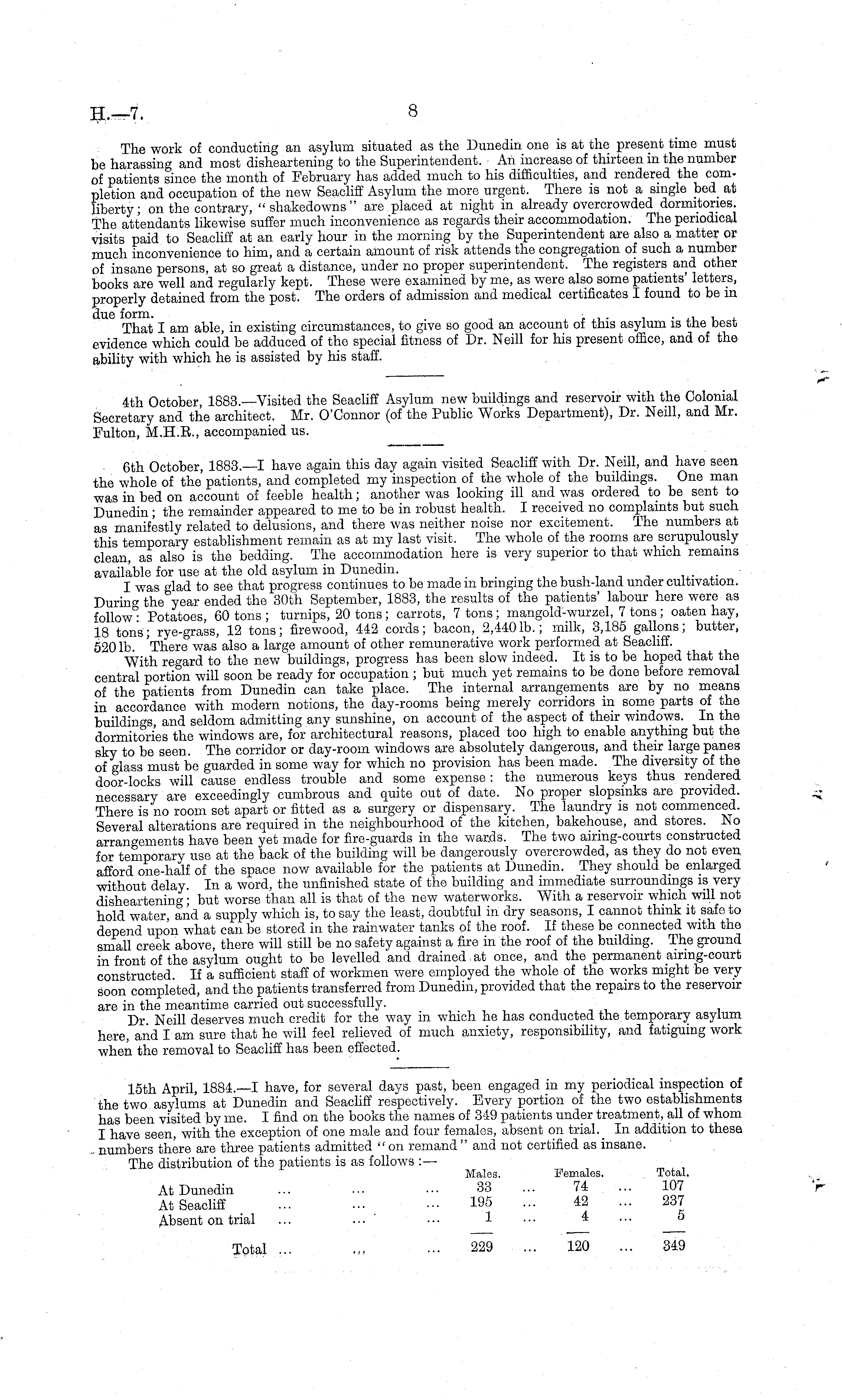 The work of conducting an asylum situated as the Dunedin one is at the present time must be harassing and most disheartening to the Superintendent. An increase of thirteen in the number of patients since the month of February has added much to his difficulties, and rendered the completion and occupation of the new Seacliff Asylum the more urgent. There is not a single bed at liberty; on the contrary, "shakedowns" are placed at night in already overcrowded dormitories. The attendants likewise suffer much inconvenience as regards their accommodation. The periodical visits paid to Seacliff at an early hour in the morning by the Superintendent are also a matter or much inconvenience to him, and a certain amount of risk attends the congregation of such a number of insane persons, at so great a distance, under no proper superintendent. The registers and other books are well and regularly kept. These were examined by me, as were also some patients' letters, properly detained from the post. The orders of admission and medical certificates I found to be in That I am able, in existing circumstances, to give so good an account of this asylum is the best evidence which could be adduced of the special fitness of Dr. Neill for his present office, and of the ability with which he is assisted by his staff.