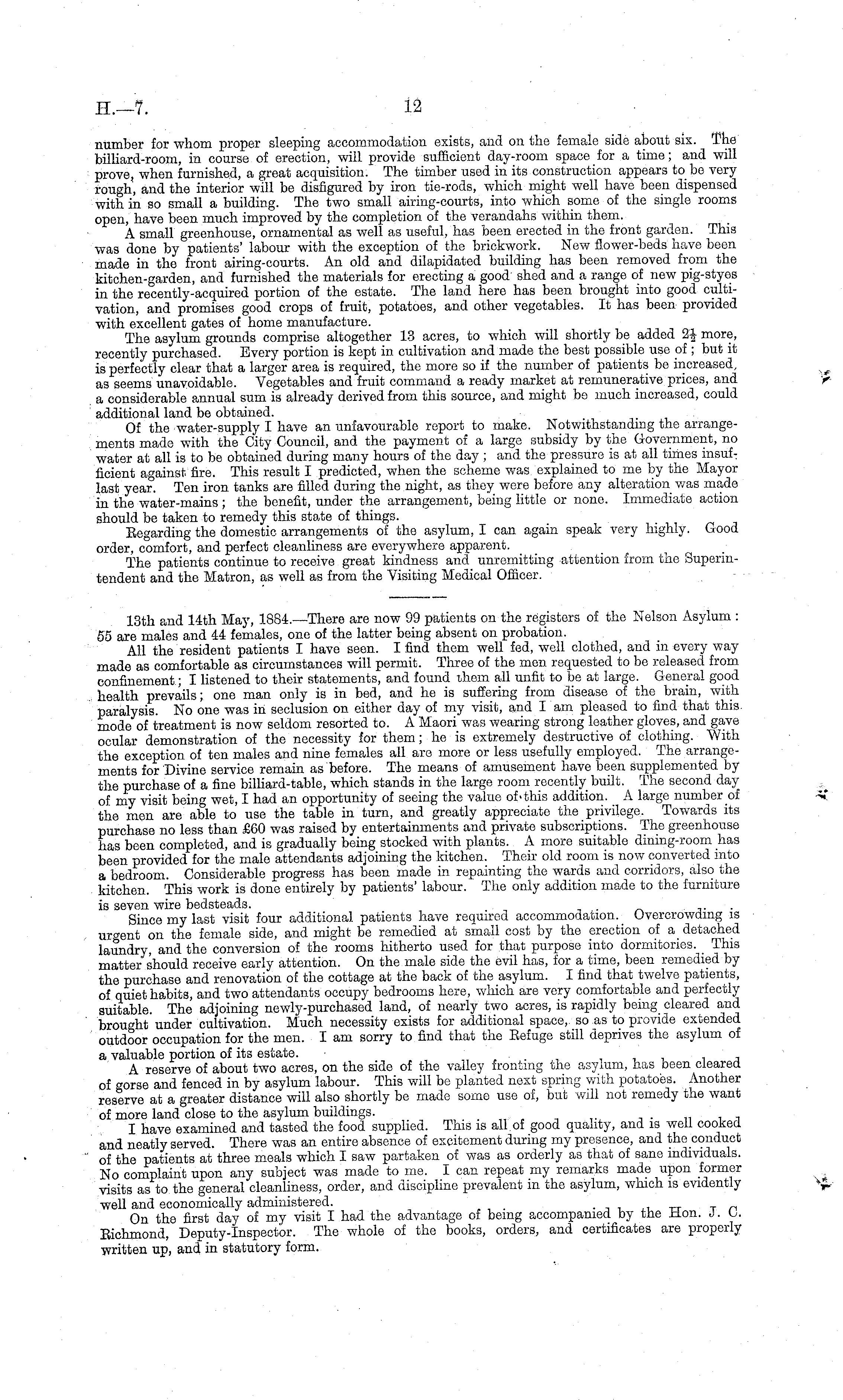 13th and 14th May, 1884.—There are now 99 patients on the registers of the Nelson Asylum : 55 are males and 44 females, one of the latter being absent on. probation. All the resident patients I have seen. I find them well fed, well clothed, and in every way made as comfortable as circumstances will permit. Three of the men requested to be released from confinement; I listened to their statements, and found them all unfit to be at large. General good health prevails; one man only is in bed, and he is suffering from disease of the brain, with paralysis. No one was in seclusion on either day of my visit, and I am pleased to find that this, mode of treatment is now seldom resorted to. A Maori was wearing strong leather gloves, and gave ocular demonstration of the necessity for them; he is extremely destructive of clothing. With the exception of ten males and nine females all are more or less usefully employed. The arrangements for Divine service remain as before. The means of amusement have been supplemented by the purchase of a fine billiard-table, which stands in the large room recently built. The second day of my visit being wet, I had an opportunity of seeing the value of«this addition. A large number of the men are able to use the table in turn, and greatly appreciate the privilege. Towards its purchase no less than £60 was raised by entertainments and private subscriptions. The greenhouse has been completed, and is gradually being stocked with plants. A more suitable dining-room has been provided for the male attendants adjoining the kitchen. Their old room is now converted into a bedroom. Considerable progress has been made in repainting the wards and corridors, also the kitchen. This work is done entirely by patients' labour. The only addition made to the furniture is seven wire bedsteads. Since my last visit four additional patients have required accommodation. _ Overcrowding is urgent on the female side, and might be remedied at small cost by the erection of a detached laundry, and the conversion of the rooms hitherto used for that purpose into dormitories. _ This matter should receive early attention. On the male side the evil has, for a time, been remedied by the purchase and renovation of the cottage at the back of the asylum. I find that twelve patients, of quiet habits, and two attendants occupy bedrooms here, which are very comfortable and perfectly suitable. The adjoining newly-purchased land, of nearly two acres, is rapidly being cleared and brought under cultivation. Much necessity exists for additional space, so as to provide extended outdoor occupation for the men. lam sorry to find that the Refuge still deprives tho asylum of a valuable portion of its estate. • ' A reserve of about two acres, on the side of the valley fronting the asylum, has been cleared of gorse and fenced in by asylum labour. This will be planted next spring with potatoes. Another reserve at a greater distance will also shortly be made some use of, but will not remedy the want of more land close to the asylum buildings. I have examined and tasted the food supplied. This is all.of good quality, and is well cooked and neatly served. There was an entire absence of excitement during my presence, and the conduct of the patients at three meals which I saw partaken of was as orderly as that of sane individuals. No complaint upon any subject was made to me. I can repeat my remarks made upon former visits as to the general cleanliness, order, and discipline prevalent in the asylum, which is evidently well and economically administered. . On the first day of my visit I had the advantage of being accompanied by the Hon. J. O. Richmond, Deputy-Inspector. The whole of the books, orders, and certificates are properly written up, and in statutory form.