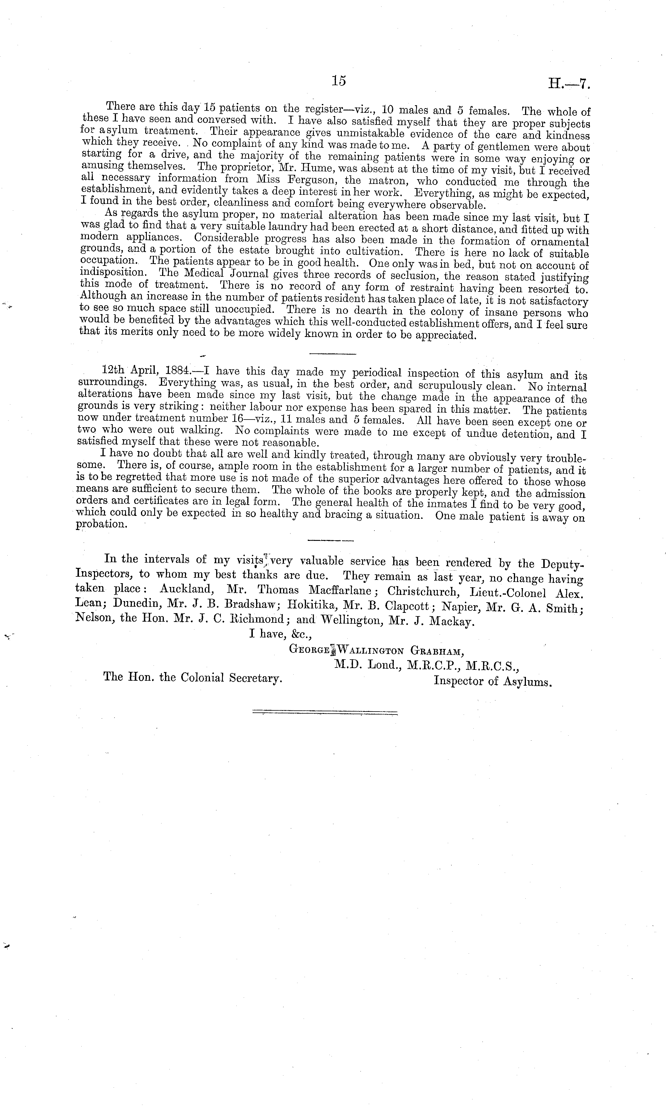 In the intervals of my visits'! very valuable service has been rendered by the DeputyInspectors, to whom my best thanks are due. They remain as last year, no change having taken place: Auckland, Mr. Thomas Macffarlane; Christchurch, Lieut.-Colonel Alex! Lean; Dunedin, Mr. J. B. Bradshaw; Hokitika, Mr. B. Clapcott; Napier, Mr. G. A. Smith; Nelson, the Hon. Mr. J. C. Richmond; and Wellington, Mr. J. Mackay. I have, &c, GeorgejWalmngton Grabham, M.D. Lond., M.R.C.P., M.R.C.S., The Hon. the Colonial Secretary. Inspector of Asylums.