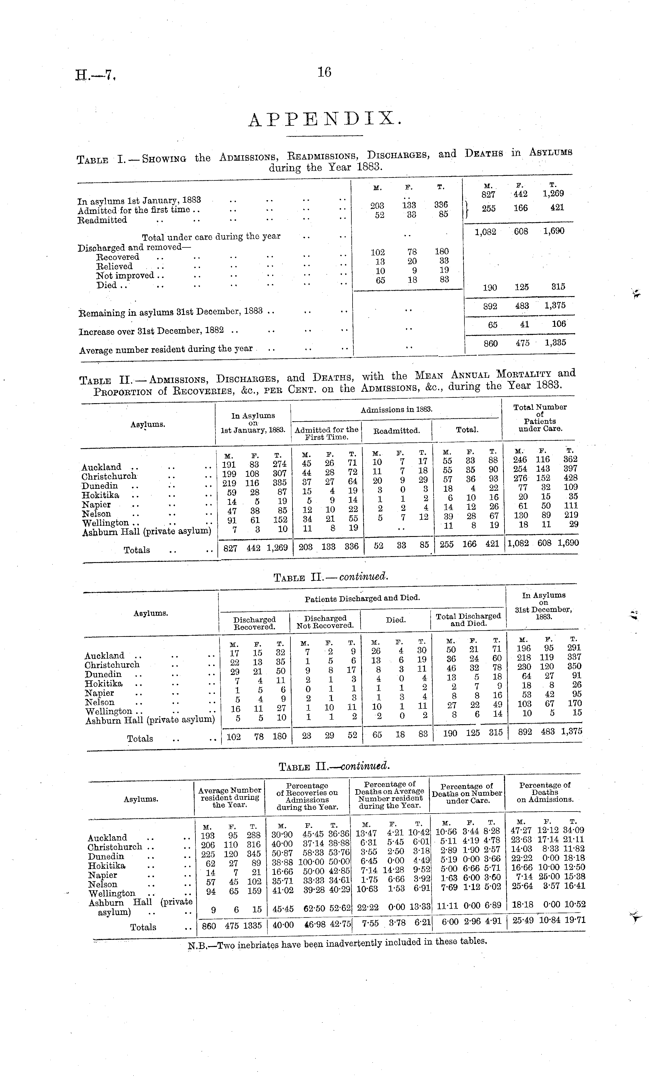 APPENDIX. Table I.— Showing the Admissions, Readmissions, Discharges, and Deaths in Asylums during the Year 1883.