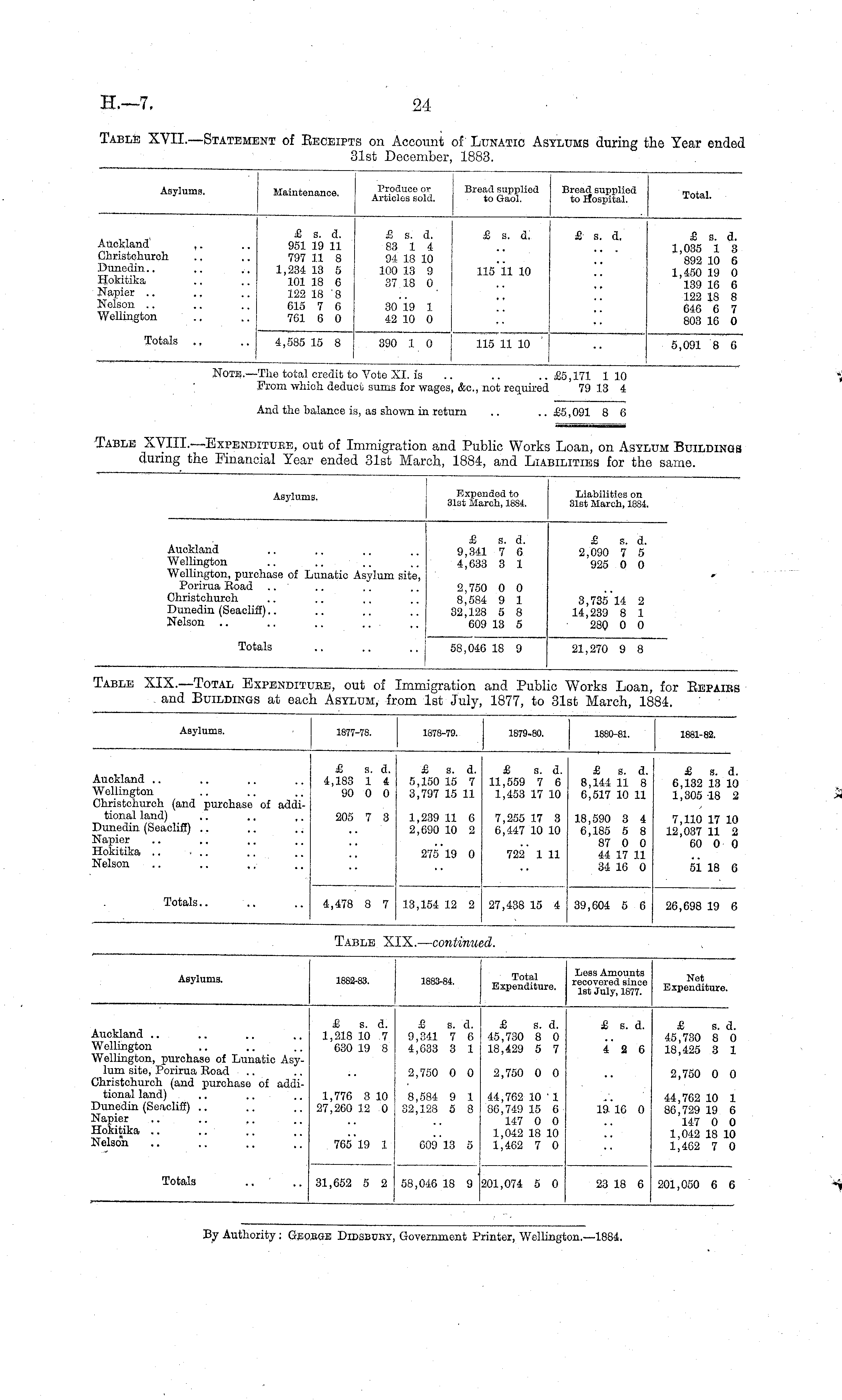 Asylums. 1882-83. 1883-84. Total Expenditure. Less Amounts recovered since 1st July, 1877. Net Expenditure. Luckland Wellington Vellington, purchase of Lunatic Asylum site, Porirua Road Ihristchurch (and purchase of additional land) )unedin (Seacliff) fapier lokitika .. Telsoh £ s. d. 1,218 10 7 630 19 8 £ s. d. 9,341 7 6 4,633 3 1 £ s. d. 45,730 8 0 18,429 5 7 £ s. d. £ s. d. 45,730 8 0 18,425 3 1 4 2 6 2,750 0 0 2,750 0 0 2,750 0 0 1,776 3 10 27,260 12 0 8,584 9 1 32,123 5 8 44,762 10 'I 86,749 15 6 147 0 0 1,042 18 10 1,462 7 0 19 16 0 44,762 10 1 86,729 19 6 147 0 0 1,042 18 10 1,462 7 0 765"19 1 609 13 5 Totals 31,652 5 2 58,046 18 9 201,074 5 0 23 18 6 201,050 6 6