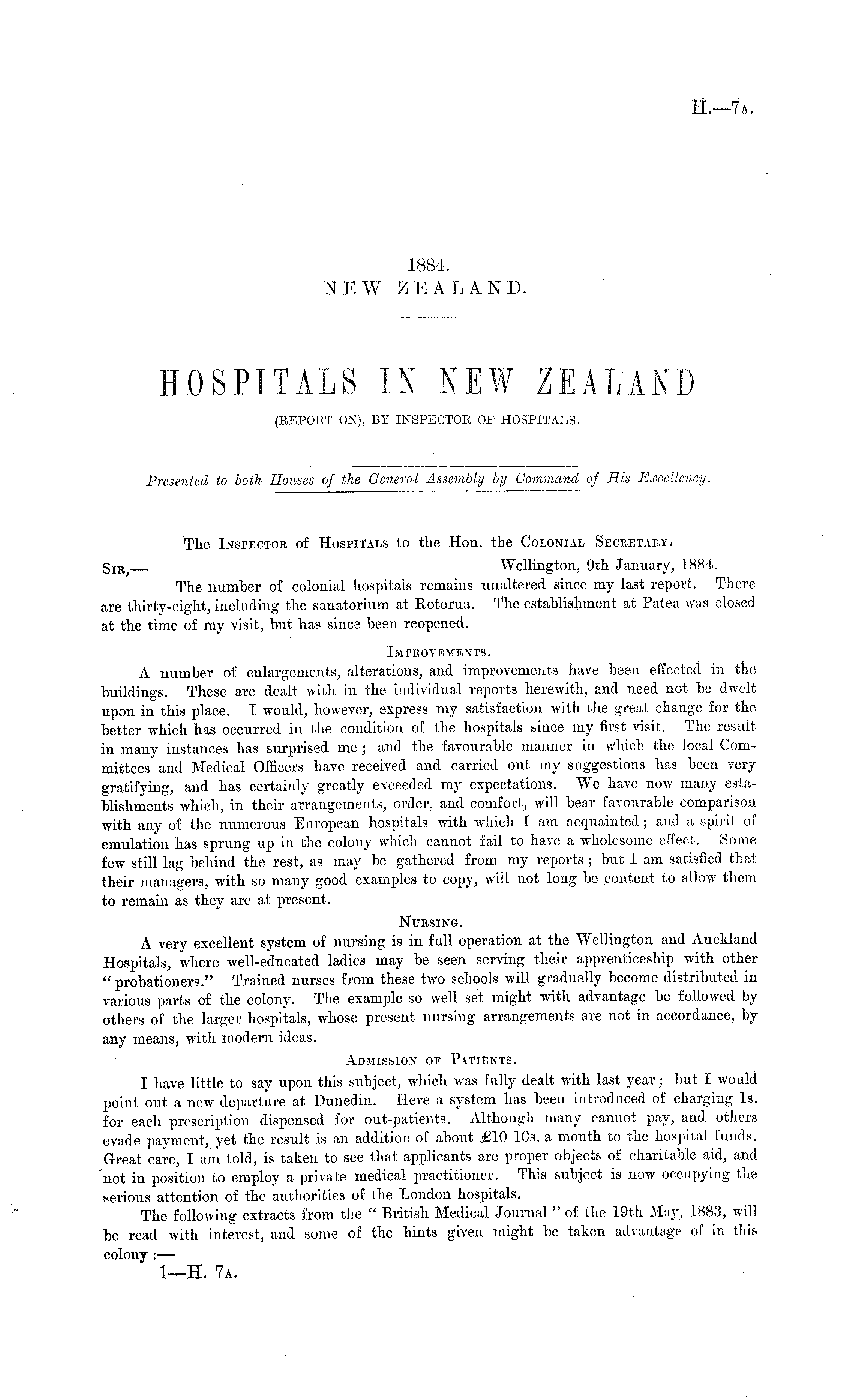 The Inspector of Hospitals to the Hon. the Colonial Secretary, g IE Wellington;, 9th January, 1884. The number of colonial hospitals remains unaltered since my last report. There are thirty-eight, including the sanatorium at Rotorua. The establishment at Patea was closed at the time of my visit, but has since been reopened. Improvements. A number of enlargements, alterations, and improvements have been effected in the buildings. These are dealt with in the individual reports herewith, and need not be dwelt upon in this place. I would, however, express my satisfaction with the great change for the better which has occurred in the condition of the hospitals since my first visit. The result in many instances has surprised me ; and the favourable manner in which the local Committees and Medical Officers have received and carried out my suggestions has been very gratifying, and has certainly greatly exceeded my expectations. We have now many establishments which, in their arrangements, order, and comfort, will bear favourable comparison with any of the numerous European hospitals with which I am acquainted ; and a spirit of emulation has sprung up in the colony which cannot fail to have a wholesome effect. Some few still lag behind the rest, as may be gathered from my reports ; but I am satisfied that their managers, with so many good examples to copy, will not long be content to allow them to remain as they are at present. Nursing. A very excellent system of nursing is in full operation at the Wellington and Auckland Hospitals, where well-educated ladies may be seen serving their apprenticeship with other " probationers." Trained nurses from these two schools will gradually become distributed in various parts of the colony. The example so well set might with advantage be followed by others of the larger hospitals, whose present nursing arrangements are not in accordance, by any means, with modern ideas. Admission of Patients. I have little to say upon this subject, which was fully dealt with last year; but I would point out a new departure at Dunedin. Here a system has been introduced of charging Is. for each prescription dispensed for out-patients. Although many cannot pay, and others evade payment, yet the result is an addition of about £10 10s. a month to the hospital funds. Great care, I am told, is taken to see that applicants are proper objects of charitable aid, and "not in position to employ a private medical practitioner. This subject is now occupying the serious attention of the authorities of the London hospitals. The following extracts from the " British Medical Journal" of the 19th May, 1883, will be read with interest, and some of the hints given might be taken advantage of in this colony : — I—H. 7a.