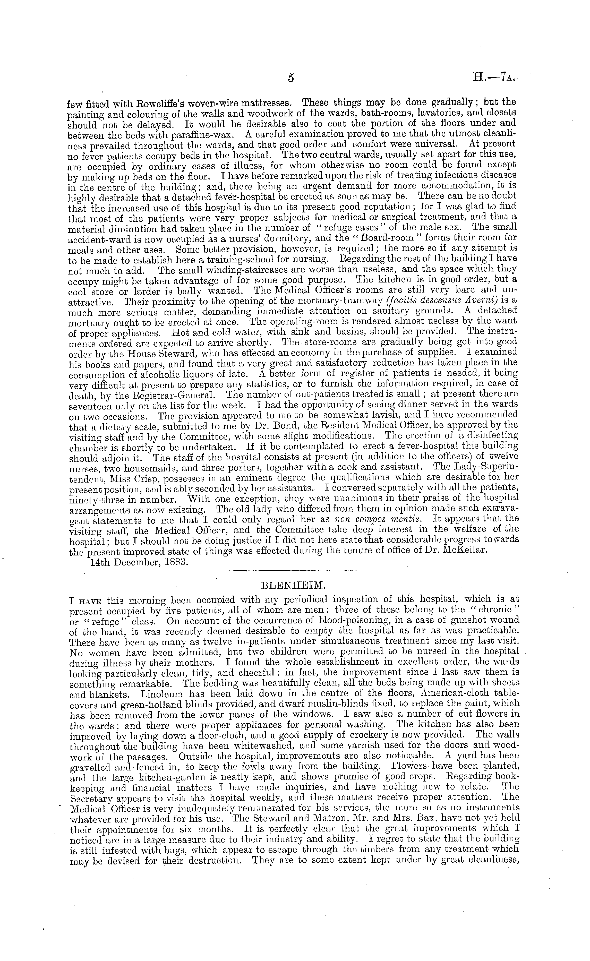 BLENHEIM. I have this morning been occupied -with my periodical inspection of this hospital, which is at present occupied by five patients, all of whom are men: three of these belong to the " chronic " or "refuge" class. On account of the occurrence of blood-poisoning, in a case of gunshot wound of the hand, it was recently deemed desirable to empty the hospital as far as was practicable. There have been as many as twelve in-patients under simultaneous treatment since my last visit. No women have been admitted, but two children were permitted to be nursed in the hospital during illness by their mothers. I found the whole establishment in excellent order, the wards looking particularly clean, tidy, and cheerful: in fact, the improvement since I last saw them is something remarkable. The bedding was beautifully clean, all the beds being made up with sheets and blankets. Linoleum has been laid down in the centre of the floors, American-cloth tablecovers and green-holland blinds provided, and dwarf muslin-blinds fixed, to replace the paint, which has been removed from the lower panes of the windows. I saw also a number of cut flowers in the wards; and there were proper appliances for personal washing. The kitchen has also been improved by laying down a floor-cloth, and a good supply of crockery is now provided. The walls throughout the building have been whitewashed, and some varnish used for the doors and woodwork of the passages. Outside the hospital, improvements are also noticeable. A yard has been gravelled and fenced in, to keep the fowls away from the building. Flowers have been planted, and the large kitchen-garden is neatly kept, and shows promise of good crops. Regarding bookkeeping and financial matters I have made inquiries, and have nothing new to relate. The Secretary appears to visit the hospital weekly, and these matters receive proper attention. The Medical Officer is very inadequately remunerated for his services, the more so as no instruments whatever are provided for his use. The Steward and Matron, Mr. and Mrs. Bax, have not yet held their appointments for six months. It is perfectly clear that the great improvements which I noticed are in a large measure due to their industry and ability. I regret to state that the building is still infested with bugs, which appear to escape through the timbers from any treatment which may be devised for their destruction, They are to some extent kept under by great cleanliness,