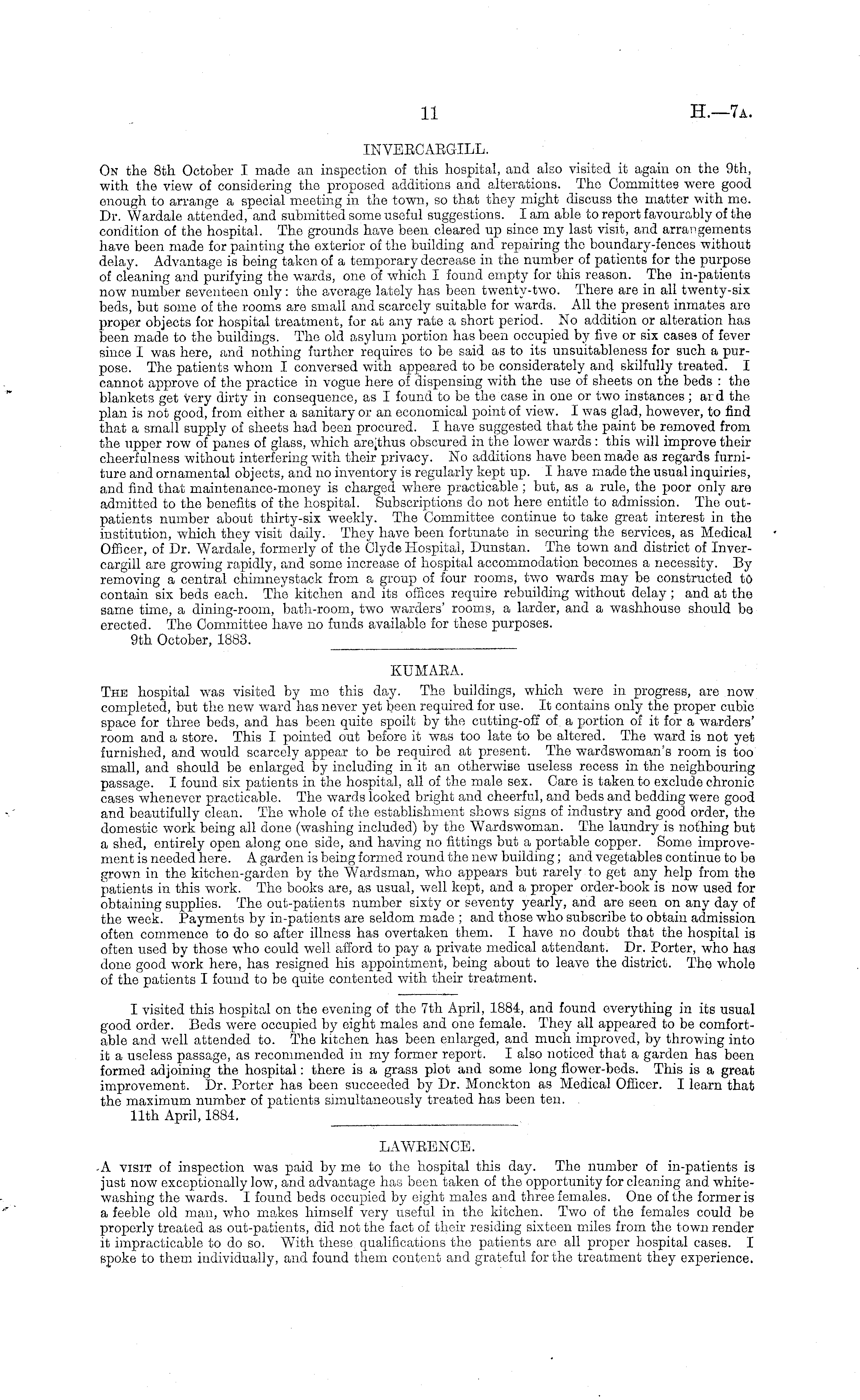 INVBECAEGILL. On the Bth October I made an inspection of this hospital, and also visited it again on the 9th, with the view of considering the proposed additions and alterations. The Committes were good enough to arrange a special meeting in the town, so that they might discuss the matter with me. Dr. Wardale attended, and submitted some useful suggestions. lam able to report favourably of the condition of the hospital. The grounds have been cleared up since my last visit, and arrangements have been made for painting the exterior of the building and repairing the boundary-fences without delay. Advantage is being taken of a temporary decrease in the number of patients for the purpose of cleaning and purifying the wards, one of which I found empty for this reason. The in-patients now number seventeen only : the average lately has been twenty-two. There are in all twenty-six beds, but some of the rooms are small and scarcely suitable for wards. All the present inmates are proper objects for hospital treatment, for at any rate a short period. No addition or alteration has been made to the buildings. The old asylum portion has been occupied by five or six cases of fever since I was here, and nothing further requires to be said as to its unsuitableness for such a purpose. The patients whom I conversed with appeared to be considerately and skilfully treated. I cannot approve of the practice in vogue here of dispensing with the use of sheets on the beds : the blankets get very dirty in consequence, as I found to be the case in one or two instances ; aid the. plan is not good, from either a sanitary or an economical point of view. I was glad, however, to find that a small supply of sheets had been procured. I have suggested that the paint be removed from the upper row of panes of glass, which are;thus obscured in the lower wards : this will improve their cheerfulness without interfering with their privacy. No additions have been made as regards furniture and ornamental objects, and no inventory is regularly kept up. I have made the usual inquiries, and find that maintenance-money is charged where practicable ; but, as a rule, the poor only are admitted to the benefits of the hospital. Subscriptions do not here entitle to admission. The outpatients number about thirty-six weekly. The Committee continue to take great interest in the institution, which they visit daily. They have been fortunate in securing the services, as Medical Officer, of Dr. Wardale, formerly of the Clyde Hospital, Dunstan. The town and district of Invercargill are growing rapidly, and some increase of hospital accommodation becomes a necessity. By removing a central chimneystack from a group of four rooms, two wards may be constructed to contain six beds each. The kitchen and its offices require rebuilding without delay; and at the same time, a dining-room, bath-room, two warders' rooms, a larder, and a washhouse should be erected. The Committee have no funds available for these purposes. 9th October, 1883.