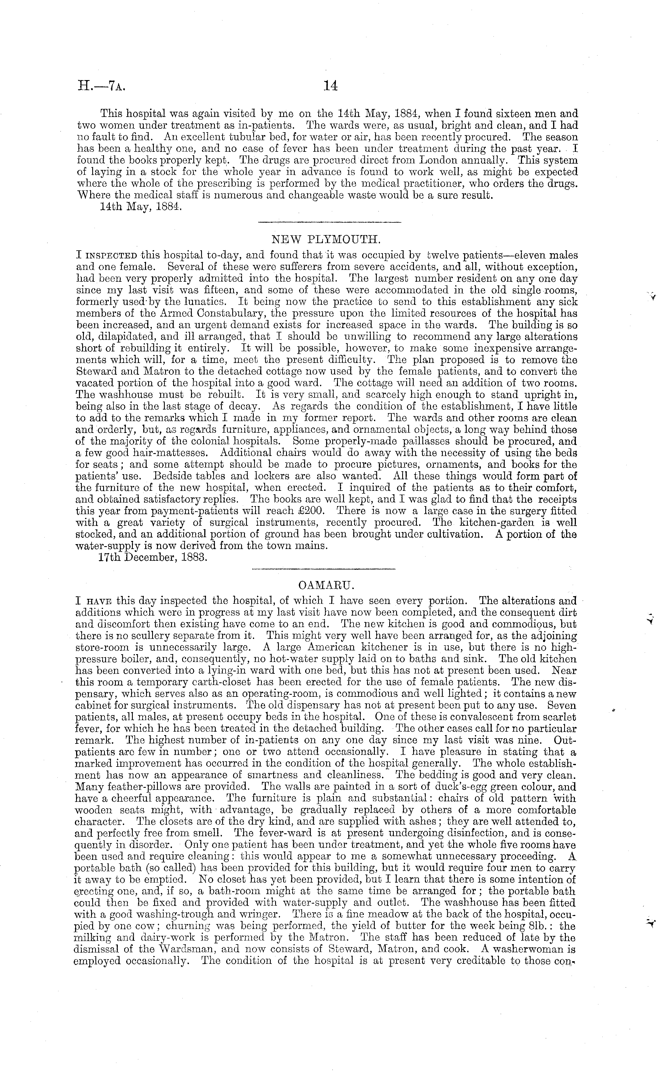 OAMAEU. I have this day inspected the hospital, of which I have seen every portion. The alterations and additions which wore in progress at my last visit have now been completed, and the consequent dirt and discomfort then existing have come to an end. The new kitchen is good and commodious, but there is no scullery separate from it. This might very well have been arranged for, as the adjoining store-room is unnecessarily large. A large American kitchener is in use, but there is no highpressure boiler, and, consequently, no hot-water supply laid on to baths and sink. The old kitchen has been converted into a lying-in ward with one bed, but this has not at present been used. Near this room a temporary earth-closet has been erected for the use of female patients. The new dispensary, which serves also as an operating-room, is commodious and well lighted; it contains a new cabinet for surgical instruments. The old dispensary has not at present been put to any use. Seven patients, all males, at present occupy beds in the hospital. One of these is convalescent from scarlet fever, for which he has been treated in the detached building. The other cases call for no particular remark. The highest number of in-patients on any one day since my last visit was nine. Outpatients are few in number; one or two attend occasionally. I have pleasure in stating that a marked improvement has occurred in the condition of the hospital generally. The whole establishment has now an appearance of smartness and cleanliness. The bedding is good and very clean. Many feather-pillows are provided. The walls are painted in a sort of duck's-egg green colour, and have a cheerful appearance. The furniture is plain and substantial: chairs of old pattern with wooden seats might, with advantage, be gradually replaced by others of a more comfortable character. The closets are of the dry kind, and are supplied with ashes; they are well attended to, and perfectly free from smell. The fever-ward is at present undergoing disinfection, and is consequently in disorder. Only one patient has been under treatment, and yet the whole five rooms have been used and require cleaning : this would appear to me a somewhat unnecessary proceeding. A portable bath (so called) has been provided for this building, but it would require four men to carry it away to be emptied. No closet has yet been provided, but I learn that there is some intention of greeting one, and, if so, a bath-room might at the same time be arranged for; the portable bath could then be fixed and provided with water-supply and outlet. The washhouse has been fitted with a good washing-trough and wringer. There is a fine meadow at the back of the hospital, occupied by one cow; churning was being performed, the yield of butter for the week being 81b.: the milking and dairy-work is performed by the Matron. The staff has been reduced of late by the dismissal of the "Wardsman, and now consists of Steward, Matron, and cook. A washerwoman is employed occasionally. The condition of the hospital is at present very creditable to those con-