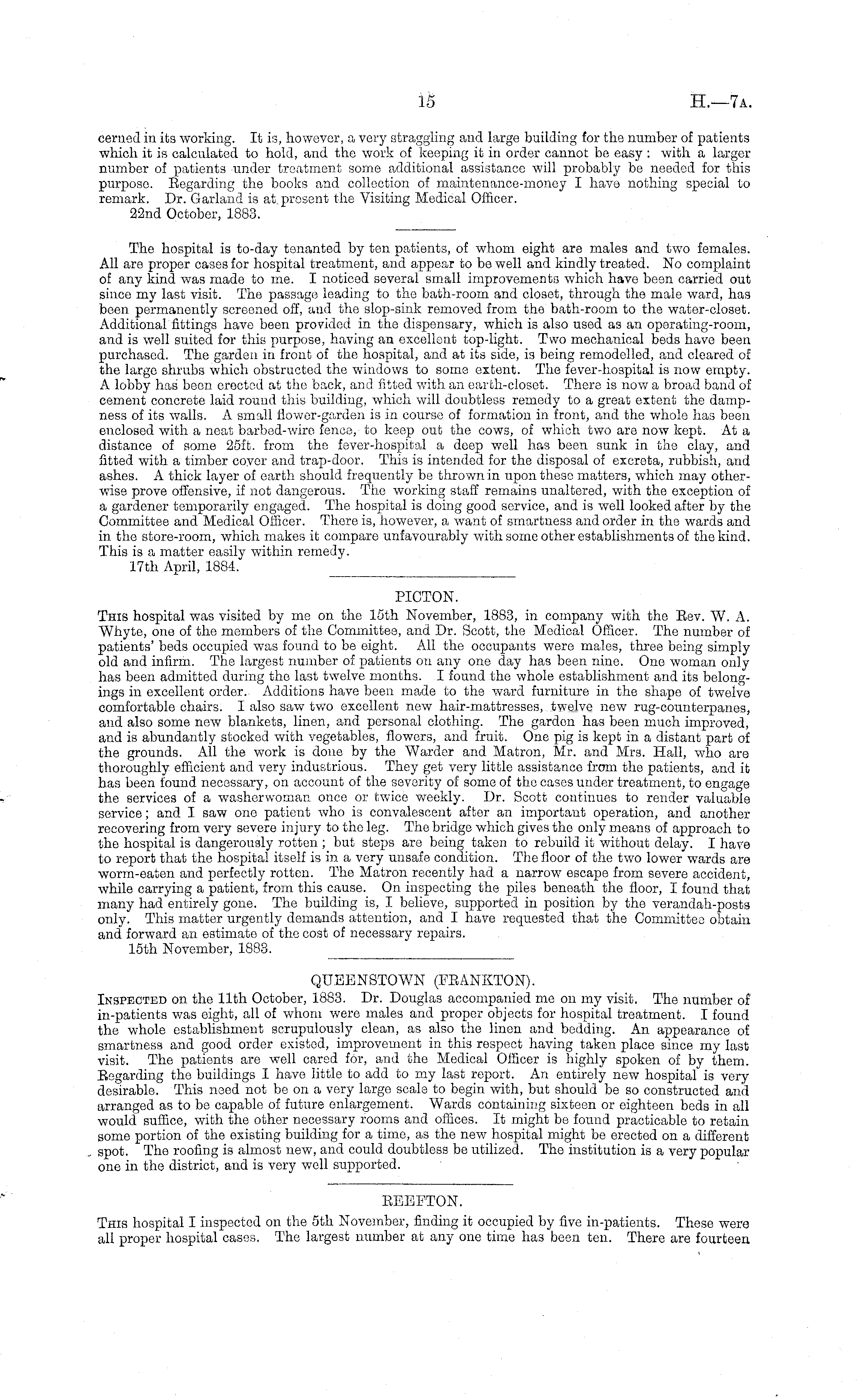 PIGTON. This hospital was visited by me on the 15th November, 1883, in company with the Eev. W. A. Whyte, one of the members of the Committee, and Dr. Scott, the Medical Officer. The number of patients' beds occupied was found to be eight. All the occupants were males, three being simply old and infirm. The largest number of patients on any one day has been nine. One woman only has been admitted during the last twelve months. I found the whole establishment and its belongings in excellent order. Additions have been made to the ward furniture in the shape of twelve comfortable chairs. I also saw two excellent new hair-mattresses, twelve new rug-counterpanes, and also some new blankets, linen, and personal clothing. The garden has been much improved, and is abundantly stocked with vegetables, flowers, and fruit. One pig is kept in a distant part of the grounds. All the work is done by the Warder and Matron, Mr. and Mrs. Hall, who ara thoroughly efficient and very industrious. They get very little assistance frerm the patients, and it has been found necessary, on account of the severity of some of the cases under treatment, to engage the services of a washerwoman once or twice weekly. Dr. Scott continues to render valuable service; and I saw one patient who is convalescent after an important operation, and another recovering from very severe injury to the leg. The bridge which gives the only means of approach to the hospital is dangerously rotten ; but steps are being taken to rebuild it without delay. I have to report that the hospital itself is in a very unsafe condition. The floor of the two lower wards are worm-eaten and perfectly rotten. The Matron recently had a narrow escape from severe accident, while carrying a patient, from this cause. On inspecting the piles beneath the floor, I found that many had entirely gone. The building is, I believe, supported in position by the verandah-posta only. This matter urgently demands attention, and I have requested that the Committeo obtain and forward an estimate of the cost of necessary repairs. 15th November, 1883.