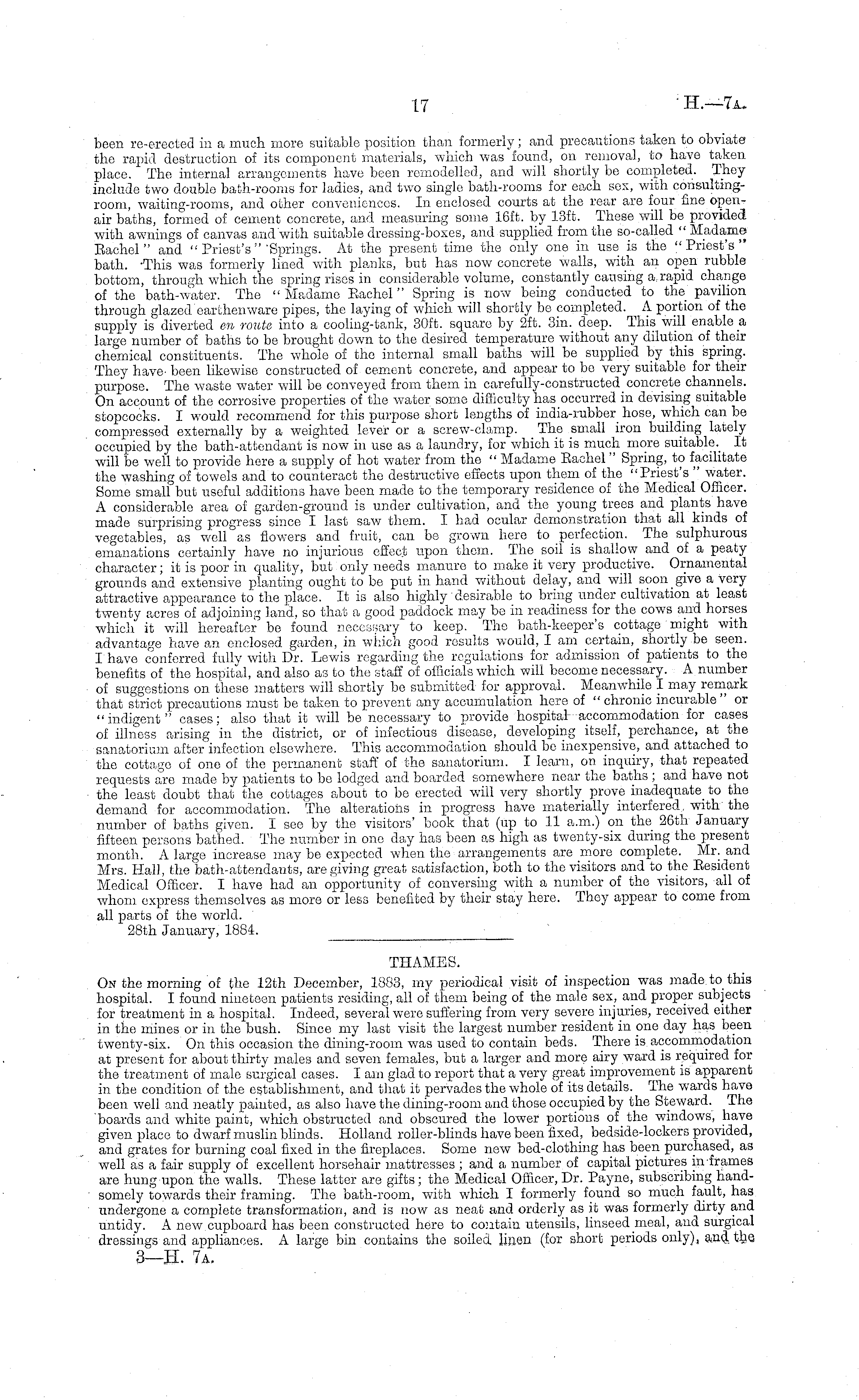THAMES. On the morning of the 12th December, 1883, my periodical visit of inspection was made to this hospital. I found nineteen patients residing, all of them being of the male sex, and proper subjects for treatment in a hospital. Indeed, several were suffering from very severe injuries, received either in the mines or in the bush. Since my last visit the largest number resident in one day has been twenty-six. On this occasion the dining-room was used to contain beds. There is accommodation at present for about thirty males and seven females, but a larger and more airy ward is required for the treatment of male surgical cases. lam glad to report that a very great improvement is apparent in the condition of the establishment, and that it pervades the whole of its details. The wards have been well and neatly painted, as also have the dining-room and those occupied by the Steward. The boards and white paint, which obstructed and obscured the lower portions of the windows, have given place to dwarf muslin blinds. Holland roller-blinds have been fixed, bedside-lockers provided, and grates for burning coal fixed in the fireplaces. Some new bed-clothing has been purchased, as well as a fair supply of excellent horsehair mattresses ; and a number of capital pictures in-frames are hung upon the walls. These latter are gifts; the Medical Officer, Dr. Payne, subscribing handsomely towards their framing. The bath-room, with which I formerly found so much fault, has undergone a complete transformation, and is now as neat and orderly as it was formerly dirty and untidy. A new cupboard has been constructed here to contain utensils, linseed meal, and surgical dressings and appliances. A large bin contains the soiled, linen (for short periods only), and the 3—H. 7a.