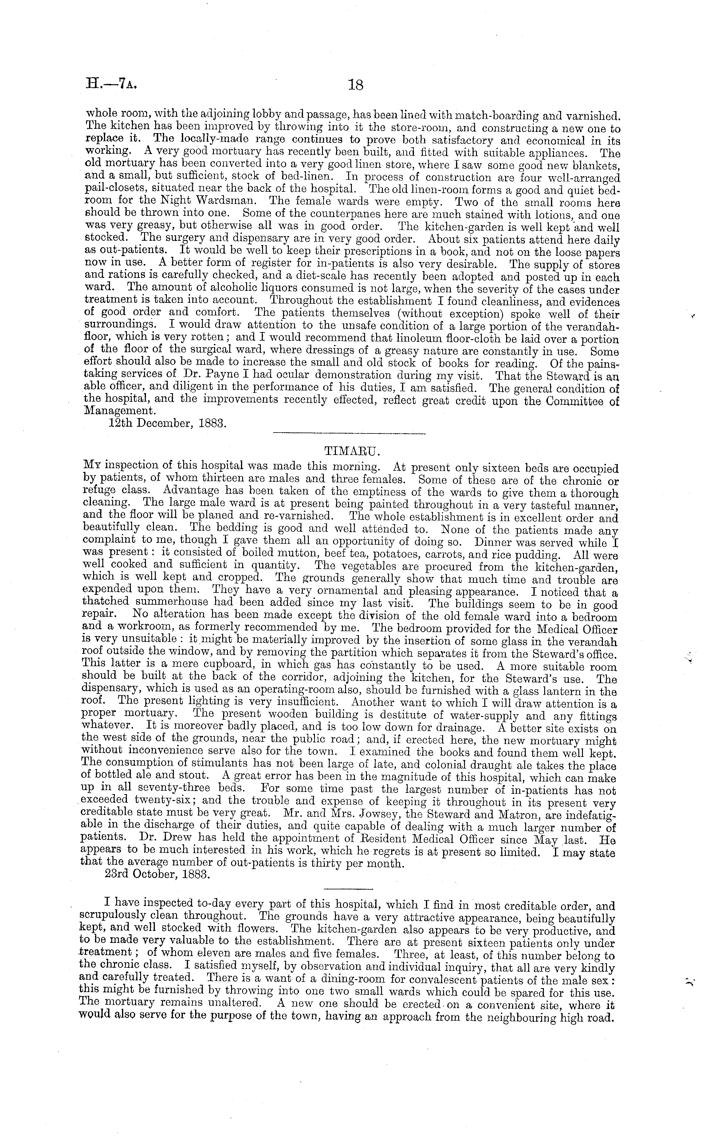 whole room, with the adjoining lobby and passage, has been lined with match-boarding and varnished. The kitchen has been improved by throwing into it the store-room, and constructing a new one to replace it. The locally-made range continues to prove both satisfactory and economical in its working. A very good mortuary has recently been built, and fitted with suitable appliances. The old mortuary has been converted into a very good linen store, where I saw some good new blankets, and a small, but sufficient, stock of bed-linen. In process of construction are four well-arranged pail-closets, situated near the back of the hospital. The old linen-room forms a good and quiet bedroom for the Night Wardsman. The female wards were empty. Two of the small rooms here should be thrown into one. Some of the counterpanes here are much stained with lotions, and one was very greasy, but otherwise all was in good order. The kitchen-garden is well kept and well stocked. The surgery and dispensary are in very good order. About six patients attend here daily as out-patients. It would be well to keep their prescriptions in a book, and not on the loose papers now in use. _ A better form of register for in-patients is also very desirable. The supply of stores and rations is carefully checked, and a diet-scale has recently been adopted and posted up in each ward. The amount of alcoholic liquors consumed is not large, when the severity of the cases under treatment is taken into account. Throughout the establishment I found cleanliness, and evidences of good order and comfort. The patients themselves (without exception) spoke well of their surroundings. I would draw attention to the unsafe condition of a large portion of the verandahfloor, which is very rotten; and I would recommend that linoleum floor-cloth be laid over a portion of the floor of the surgical ward, where dressings of a greasy nature are constantly in use. Some effort should also be made to increase the small and old stock of books for reading. Of the painstaking services of Dr. Payne I had ocular demonstration during my visit. That the Steward is an able officer, and diligent in the performance of his duties, lam satisfied. The general condition of the hospital, and the improvements recently effected, reflect great credit upon the Committee of Management. 12th December, 1883.