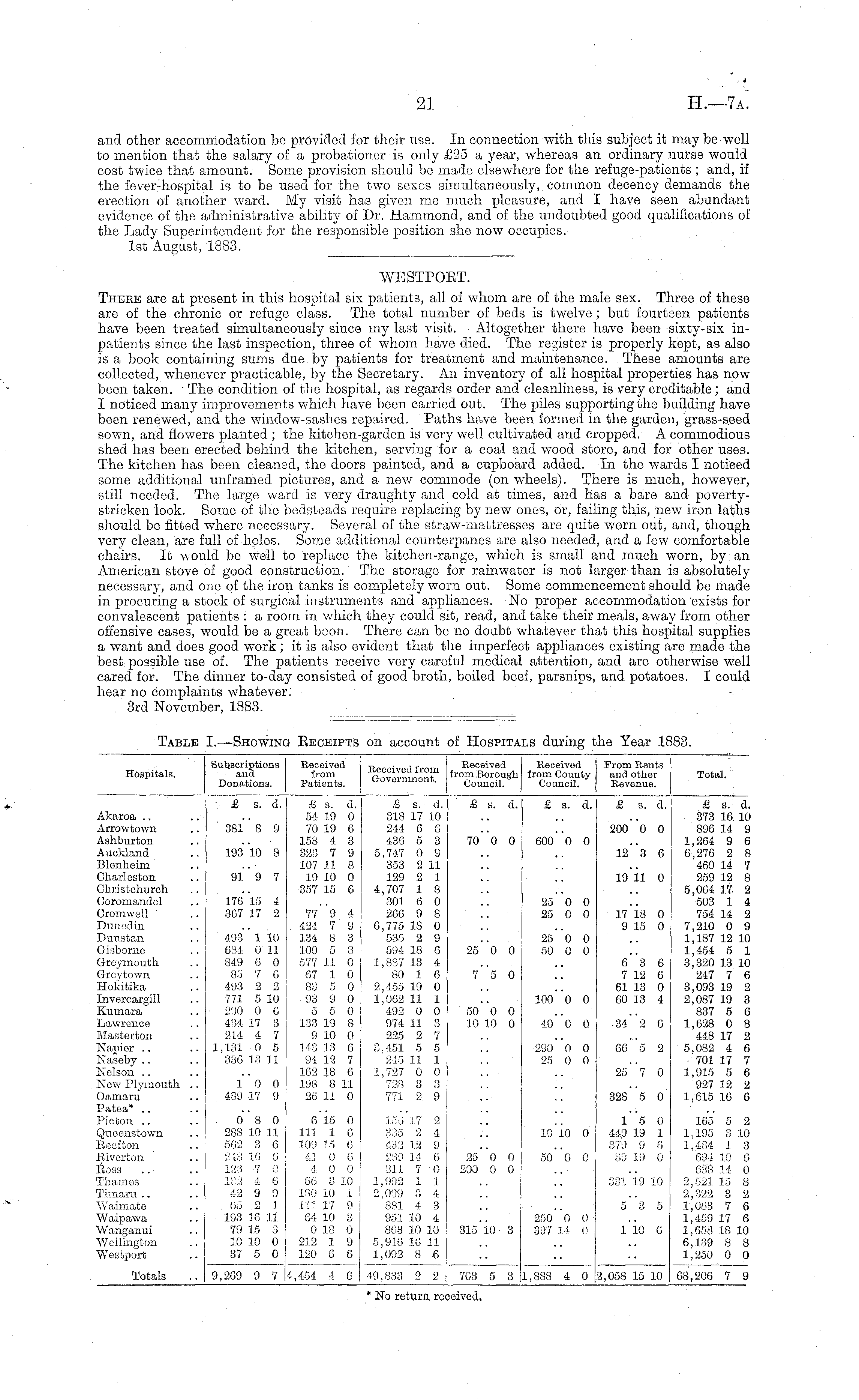 Table I.—Showing Receipts on account of Hospitals during the Year 1883.