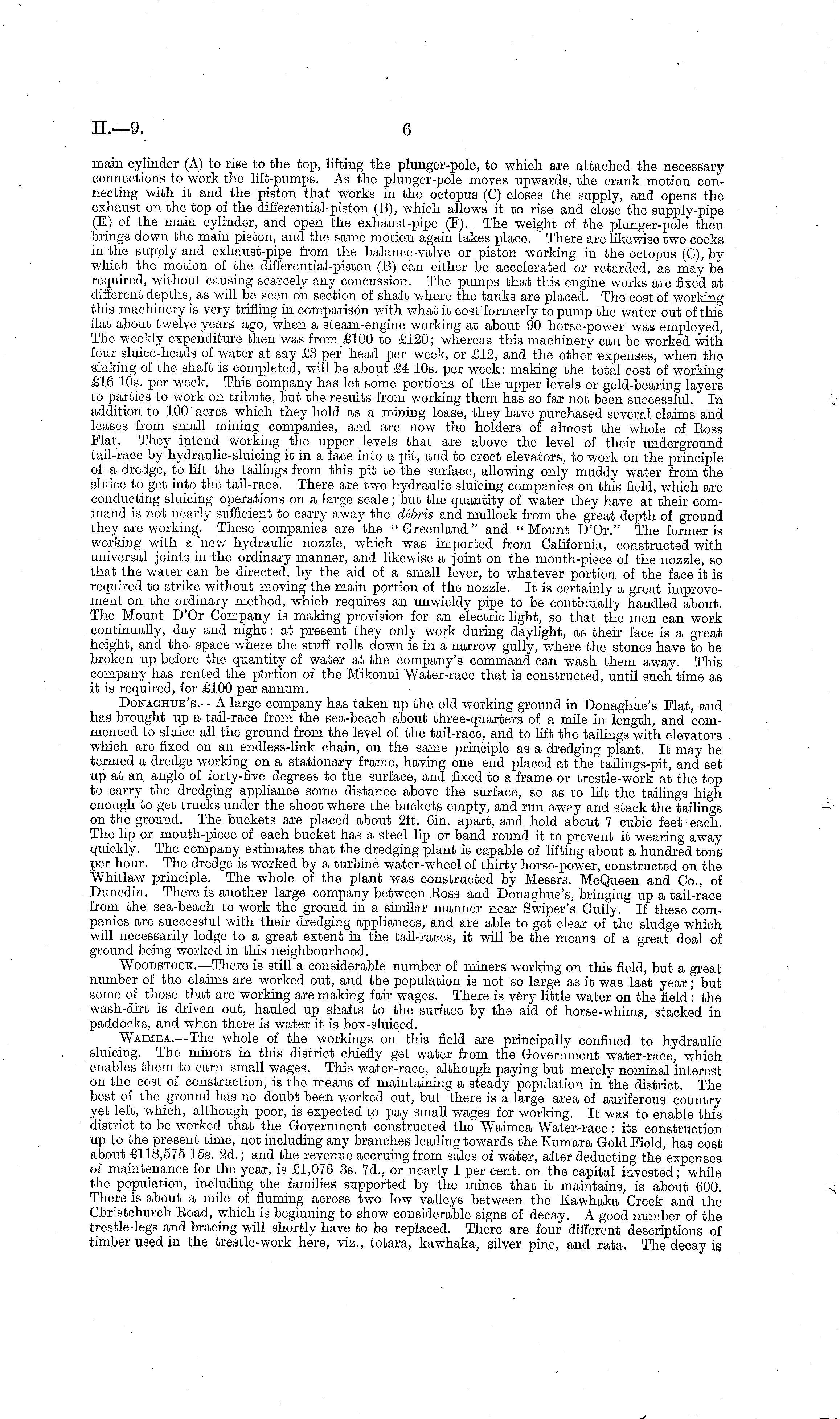 main cylinder (A) to rise to the top, lifting the plunger-pole, to which are attached the necessary connections to work the lift-pumps. As the plunger-pole moves upwards, the crank motion connecting with it and the piston that works in the octopus (C) closes the supply, and opens the exhaust on the top of the differential-piston (B), which allows it to rise and close the supply-pipe (E) of the main cylinder, and open the exhaust-pipe (F). The weight of the plunger-pole then brings down the main piston, and the same motion again takes place. There are likewise two cocks in the supply and exhaust-pipe from the balance-valve or piston working in the octopus (C), by which the motion of tho differential-piston (B) can either be accelerated or retarded, as may be required, without causing scarcely any concussion. The pumps that this engine works are fixed at different depths, as will be seen on section of shaft where the tanks are placed. The cost of working this machinery is very trifling in comparison with what it cost formerly to pump the water out of this flat about twelve years ago, when a steam-engine working at about 90 horse-power was employed, The weekly expenditure then was from £100 to £120; whereas this machinery can be worked with four sluice-heads of water at say £3 per head per week, or £12, and the other expenses, when the sinking of the shaft is completed, will be about £4 10s. per week: making the total cost of working £16 10s. per week. This company has let some portions of the upper levels or gold-bearing layers to parties to work on tribute, but the results from working them has so far not been successful. In addition to 100 acres which they hold as a mining lease, they have purchased several claims and leases from small mining companies, and are now the holders of almost the whole of Boss Plat. They intend working the upper levels that are above the level of their underground tail-race by hydraulic-sluicing it in a face into a pit, and to erect elevators, to work on the principle of a dredge, to lift the tailings from this pit to the surface, allowing only muddy water from the sluice to. get into, the tail-race. There are two hydraulic sluicing companies on this field, which are conducting sluicing operations on a large scale; but the quantity of water they have at their command is not nearly sufficient to carry away the debris and mullock from the great depth of ground they are working.. These companies are the "Greenland" and "Mount D'Or." The former is working with a "new hydraulic nozzle, which was imported from California, constructed with universal joints in the ordinary manner, and likewise a joint on the mouth-piece of the nozzle, so that the water can be directed, by the aid of a small lever, to whatever portion of the face it is required to strike without moving the main portion of the nozzle. It is certainly a great improvement on the ordinary method, which requires an unwieldy pipe to be continually handled about. The Mount DOr Company is making provision for an electric light, so that the men can work continually, day and night: at present they only work during daylight, as their face is a great height, and the space where the stuff rolls down is in a narrow gully, where the stones have to be broken up before the quantity of water at the company's command can wash them away. This company has rented the portion of the Mikonui Water-race that is constructed, until such time as it is required, for £100 per annum. Donaghue's.—A large company has taken up the old working ground in Donaghue's Plat, and has brought up a tail-race from the sea-beach about three-quarters of a mile in length, and commenced to sluice all the ground from the level of the tail-race, and to lift the tailings with elevators which are fixed on an endless-link chain, on the same principle as a dredging plant. It may be termed a dredge working on a stationary frame, having one end placed at the tailings-pit, and set up at an. angle of forty-five degrees to the surface, and fixed to a frame or trestle-work at the top to carry the dredging appliance some distance above the surface, so as to lift the tailings high enough to get trucks under the shoot where the buckets empty, and run away and stack the tailings on the ground. The buckets are placed about 2ft. 6in. apart, and hold about 7 cubic feet each. The lip or mouth-piece of each bucket has a steel lip or band round it to prevent it wearing away quickly. The company, estimates that the dredging plant is capable of lifting about a hundred tons per hour. The dredge is worked by a turbine water-wheel of thirty horse-power, constructed on the Whitlow principle. The whole of the plant was constructed by Messrs. McQueen and Co., of Dunedin. There is another large company between Boss and Donaghue's, bringing up a tail-race from the sea-beach to work the ground in a similar manner near Swiper's Gully. If these companies are successful with their dredging appliances, and are able to get clear of the sludge which will necessarily lodge to a great extent in the tail-races, it will be the means of a great deal of ground being worked in this neighbourhood. WooDSTOCK.—There is still a considerable number of miners working on this field, but a great number of the claims are worked out, and the population is not so large as it was last year; but some of those that are working are making fair wages. There is very little water on the field : the wash-dirt is driven out, hauled up shafts to the surface by the aid of horse-whims, stacked in paddocks, and when there is water it is box-sluiced. Waimea. —The whole of the workings on this field are principally confined to hydraulic sluicing. The miners in this district chiefly get water from the Government water-race, which enables them to earn small wages. This water-race, although paying but merely nominal interest on the cost of construction, is the means of maintaining a steady population in tho di