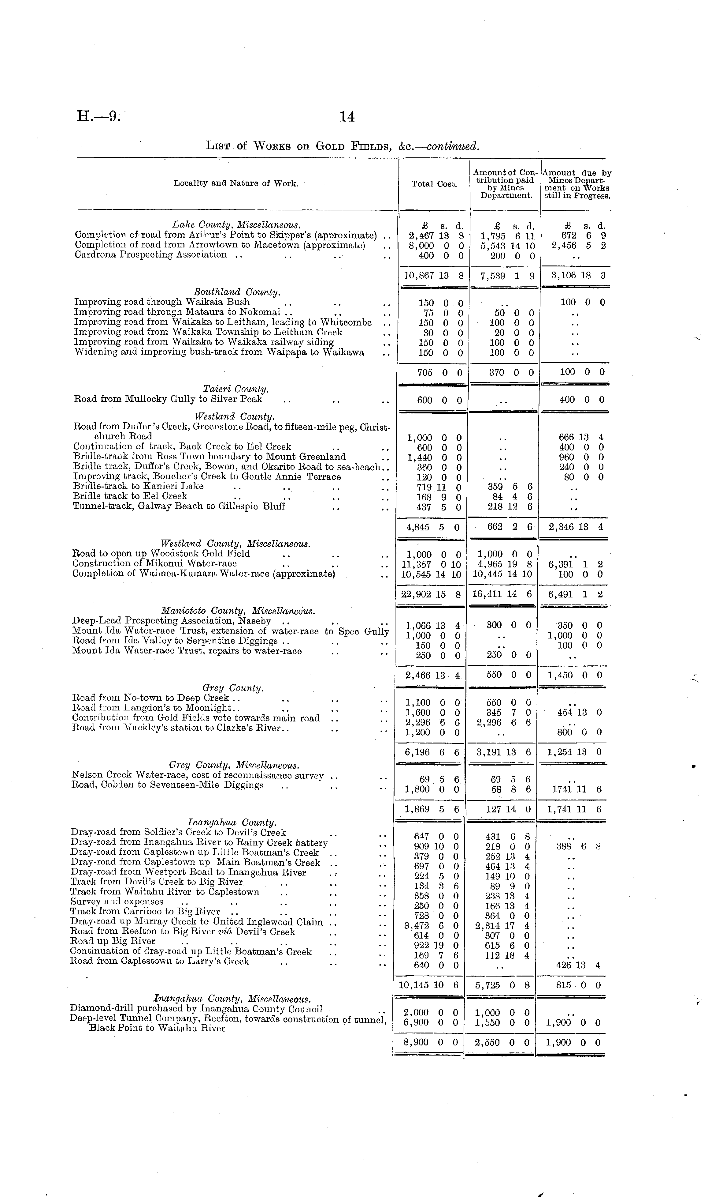 Locality and Nature of Work, Total Cost. Amount of Contribution paid by Mines Department. Amount due by Mines Department on Works still in Progress. Lake County, Miscellaneous. Completion of-road from Arthur's Point to Skipper's (approximate) .. Completion of road from Arrowtown to Maoetown (approximate) Cardrona Prospecting Association £ s. d. 2,467 13 8 8,000 0 0 400 0 0 £ s. d. 1,795 6 11 5,543 14 10 200 0 0 £ s. d. 672 6 9 2,456 5 2 Southland County. Improving road through Waikaia Bush Improving road through Mataura to Nokomai Improving road from Waikaka to Leitham, leading to Whitcombe Improving road from Waikaka Township to Leitham Creek Improving road from Waikaka to Waikaka railway siding Widening and improving bush-track from Waipapa to Waikawa 10,867 13 8 7,539 1 9 3,106 18 3 150 0 0 75 0 0 150 0 0 30 0 0 150 0 0 150 0 0 50 0 0 100 0 0 20 0 0 100 0 0 100 0 0 100 0 0 Taieri County. Boad from Mullocky Gully to Silver Peak 705 0 0 370 0 0 100 0 0 600 0 0 400 0 0 Westland County. Boad from Duffer's Creek, Greenstone Boad, to fifteen-mile peg, Christchurch Boad Continuation of track, Back Creek to Eel Creek Bridle-track from Boss Town boundary to Mount Greenland Bridle-track, Duffer's Creek, Bowen, and Okarito Boad to sea-beach.. Improving track, Boucher's Creek to Gentle Annie Terrace Bridle-track to Kanieri Lake Bridle-track to Eel Creek Tunnel-track, Galway Beach to Gillespie Bluff 1,000 0 0 600 0 0 1,440 0 0 360 0 0 120 0 0 719 11 0 168 9 0 437 5 0 666 13 4 400 0 0 960 0 0 240 0 0 80 0 0 359 5 6 84 4 6 218 12 6 Westland County, Miscellaneous. Boad to open up Woodstock Gold Field Construction of Mikonui Water-race Completion of Waimoa-Kumara Water-race (approximate) 4,845 5 0 662 2 6 2,346 13 4 1,000 0 0 11,357 0 10 10,545 14 10 1,000 0 0 4,965 19 8 10,445 14 10 6,39i' 1 2 100 0 0 Maniototo County, Miscellaneous. Deep-Lead Prospecting Association, Naseby Mount Ida Water-race Trust, extension of water-race to Spec Gully Boad from Ida Valley to Serpentine Diggings Mount Ida Water-race Trust, repairs to water-race 22,902 15 8 16,411 14 6 6,491 1 2 1,066 13 4 1,000 0 0 150 0 0 250 0 0 300 0 0 350 0 0 1,000 0 0 100 0 0 250* 0 0 Grey County. Boad from No-town to Deep Creek Boad from Langdon's to Moonlight Contribution from Gold Fields vote towards main road Boad from Maekley's station to Clarke's Biver.. 2,466 13 4 1,100 0 0 1,600 0 0 2,296 6 6 1,200 0 0 550 0 0 345 7 0 2,296 6 6 550 0 0 1,450 0 0 454*13 0 800 0 0 Orey County, Miscellaneous. Nelson Creek Water-race, cost of reconnaissance survey Boad, Cobden to Seventeen-Mile Diggings 6,196 6 6 3,191 13 6 1,254 13 0 69 5 6 1,800 0 0 69 5 6 58 8 6 1741*11 6 Inangahua County. Dray-road from Soldier's Creek to Devil's Creek Dray-road from Inangahua Biver to Bainy Creek battery Dray-road from Caplestown up Little Boatman's Creek Dray-road from Caplestown up Main Boatman's Creek .. Dray-road from Westport Boad to Inangahua Biver Track from Devil's Creek to Big Biver Track from Waitahu Biver to Caplestown Survey and expenses Track from Carriboo to Big Biver Dray-road up Murray Creek to United Inglewood Claim Boad from Beefton to Big Biver via Devil's Creek Boad up Big Biver Continuation of dray-road up Little Boatman's Creek Boad from Caplestown to Larry's Creek 1,869 5 6 647 0 0 909 10 0 379 0 0 697 0 0 224 5 0 134 3 6 358 0 0 250 0 0 728 0 0 3,472 6 0 614 0 0 922 19 0 169 7 6 640 0 0 431 6 8 218 0 0 252 13 4 464 13 4 149 10 0 89 9 0 238 13 4 166 13 4 364 0 0 2,314 17 4 307 0 0 615 6 0 112 18 4 127 14 0 1,741 11 6 388* 6 8 426 13 4 10,145 10 6 5,725 0 8 815 0 0 Inangahua County, Miscellaneous. Diamond-drill purchased by Inangahua County Council Deep-level Tunnel Company, Beefton, towards construction of tunnel, Black Point to Waitahu Biver 2,000 0 0 6,900 0 0 1,000 0 0 1,550 0 0 1,900 0 0 8,900 0 0 2,550 0 0 1,900 0 0