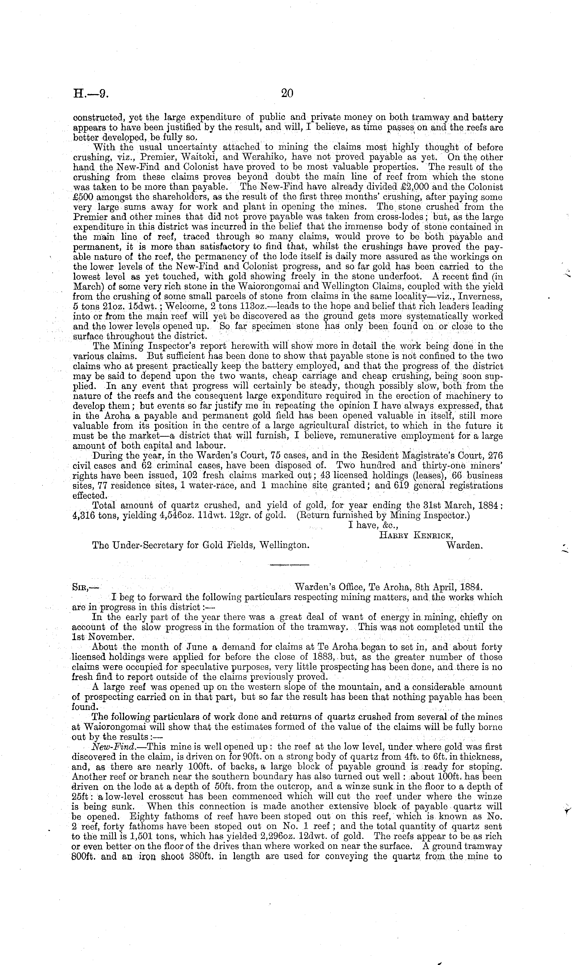 constructed, yet the large expenditure of public and private money on both tramway and battery appears to have been justified by the result, and will, I believe, as time passes on and the reefs are better developed, be fully so. With the usual uncertainty attached to mining the claims most highly thought of before crushing, viz., Premier, Waitoki, and Werahiko, have not proved payable as yet. On the other hand the New-Find and Colonist have proved to be most valuable properties. The result of the crushing from these claims proves beyond doubt the main line of reef from which the stone was taken to be more than payable. The New-Find have already divided £2,000 and the Colonist £500 amongst the shareholders, as the result of the first three months' crushing, after paying some very large sums away for work and plant in opening the mines. The stone crushed from tho Premier and other mines that did not prove payable was taken from cross-lodes; but, as the large expenditure in this district was incurred in the belief that the immense body of stone contained in the main line of reef, traced through so many claims, would prove to be both payable and permanent, it is more than satisfactory to find that, whilst the crushings have proved the payable nature of the reef, the permanency of the lode itself is daily more assured as the workings on the lower levels of the New-Find and Colonist progress, and so far gold has been carried to the lowest level as yet touched, with gold showing freely in the stone underfoot. A recent find (in March) of some very rich stone in the Waiorongomai and Wellington Claims, coupled with the yield from the crushing of some small parcels of stone from claims in tho same locality—viz., Inverness, 5 tons 21oz. 15dwt. ; Welcome, 2 tons 113oz. —leads to the hope and belief that rich leaders leading into or from the main reef will yet be discovered as the ground gets more systematically worked and the lower levels opened up. So far specimen stone has only been found on or close to the surface throughout the district. The Mining Inspector's report herewith will show more in detail the work being done in the various claims. But sufficient has been done to show that payable stone is not confined to the two claims who at present practically keep the battery employed, and that the progress of the district may be said to depend upon the two wants, cheap carriage and cheap crushing, being soon supplied. In any event that progress will certainly be steady, though possibly slow, both from the nature of the reefs and the consequent large expenditure required in the erection of machinery to develop them; but events so far justify me in repeating the opinion I have always expressed, that in the Aroha a payable and permanent gold field has been opened valuable in itself, still more valuable from its position in the centre of a large agricultural district, to which in the future it must be the market —a district that will furnish, I believe, remunerative employment for a large amount of both capital and labour. During the year, in the Warden's Court, 75 cases, and in tho Eesident Magistrate's Court, 276 civil cases and 62 criminal cases, have been disposed of. Two hundred and thirty-one miners' rights have been issued, 102 fresh claims marked out; 43 licensed holdings (leases), 66 business sites, 77 residence sites, 1 water-race, and 1 machine site granted; and 619 general registrations effected. Total amount of quartz crushed, and yield of gold, for year ending the 31st March, 1884: 4,316 tons, yielding 4,5460z. lldwt. 12gr. of gold. (Eeturn furnished by Mining Inspector.) I have, &c, Haeey Keneick, The Under-Secretary for Gold Fields, Wellington. Warden.