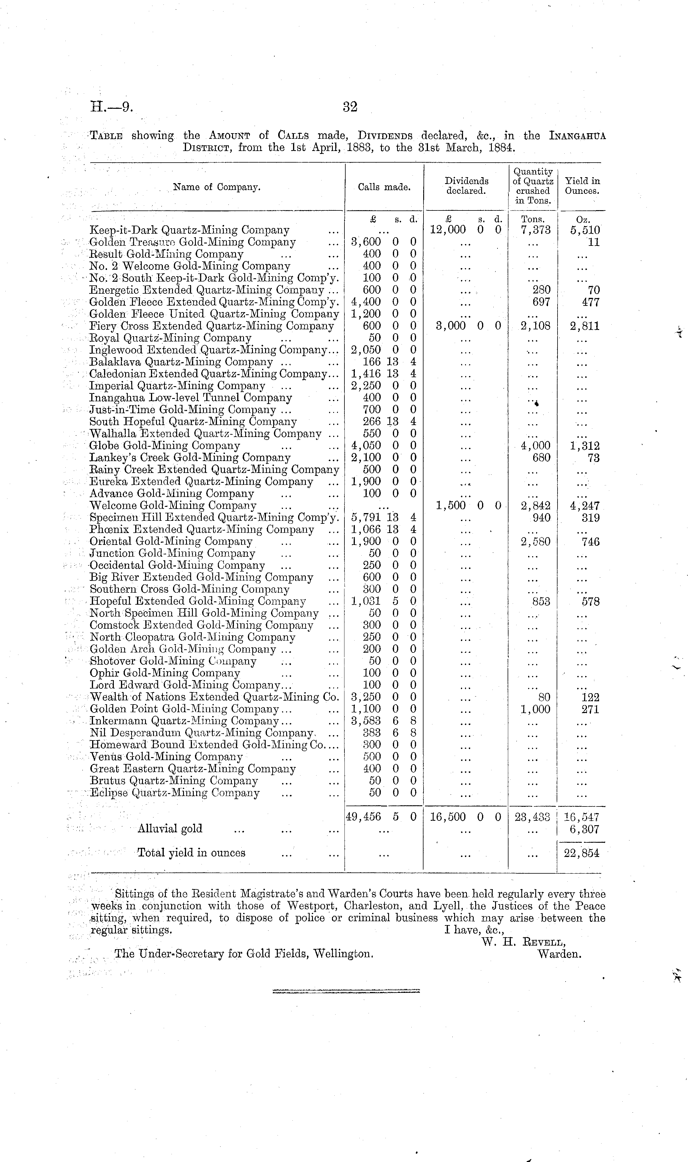 Table showing the Amount of Calls made, Dividends declared, &c., in the Inangahua District, from the 1st April, 1883, to the 31st March, 1884.