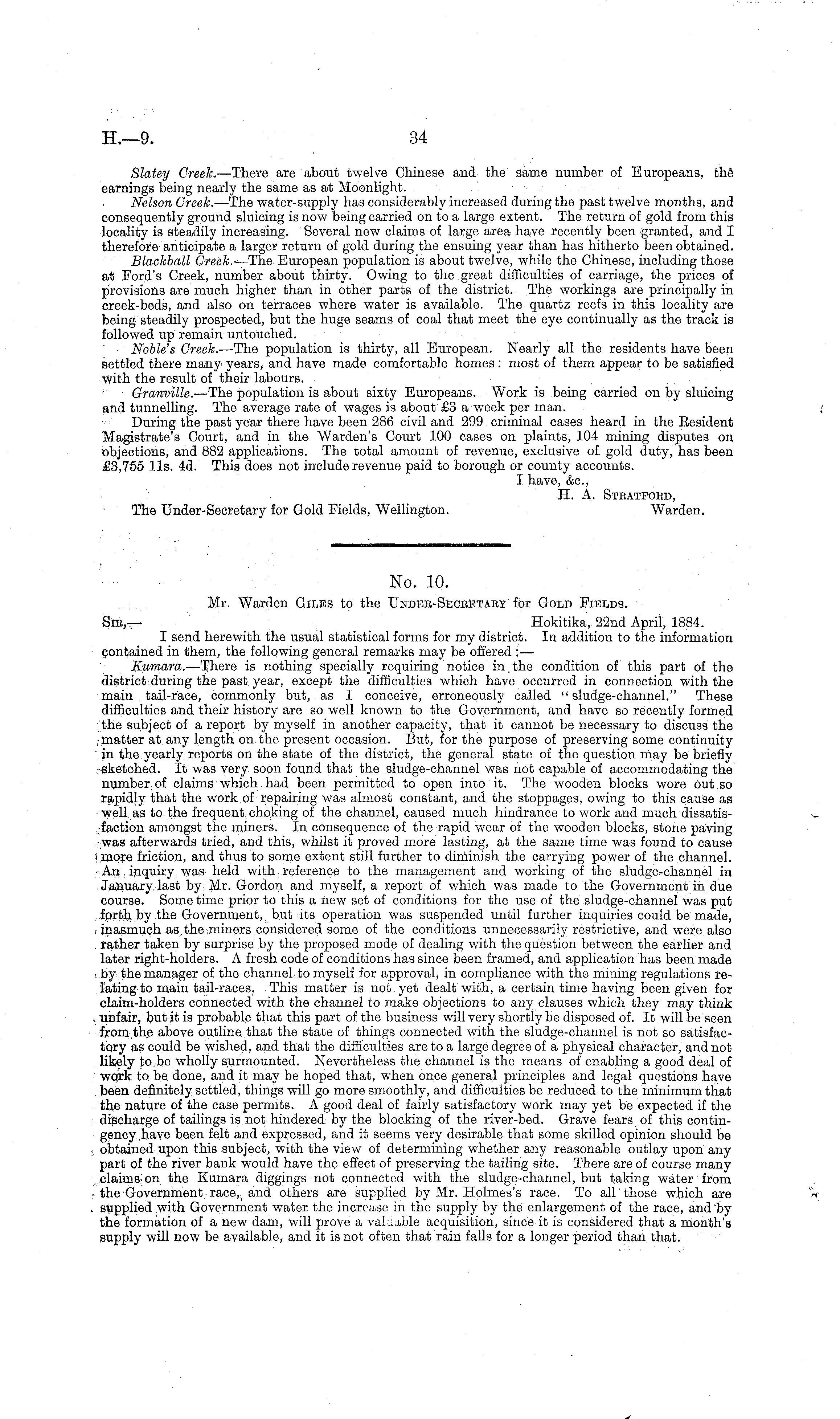 No. 10. Mr. Warden Giles to the Undee-Seceetaet for Gold Fields. Sib,t- Hokitika, 22nd April, 1884. I send herewith the usual statistical forms for my district. In addition to the information contained in them, the following general remarks may be offered :— Kumara. —There is nothing specially requiring notice in, the condition of this part of the district,during the past year, except the difficulties which have occurred in connection with the main tail-race, commonly but, as I conceive, erroneously called "sludge-channel." These difficulties and their history are so well known to the Government, and have so recently formed the subject of a report by myself in another capacity, that it cannot be necessary to discuss the ; matter at any length on the present occasion. But, for the purpose of preserving some continuity in the yearly reports on the state of the district, the general state of the question may be briefly ■sketched. It was very soon found that the sludge-channel was not capable of accommodating the number of claims which had been permitted to open into it. The wooden blocks wore out so rapidly that the work of repairing was almost constant, and the stoppages, owing to this cause as well as to the frequent choking of the channel, caused much hindrance to work and much dissatisfaction amongst the miners. In consequence of the rapid wear of the wooden blocks, stone paving was afterwards tried, and this, whilst it proved more lasting, at the same time was found to cause imore friction, and thus to some extent still further to diminish the carrying power of the channel. An inquiry was held with reference to the management and working of the sludge-channel in January last by Mr. Gordon and myself, a report of which was made to the Government in due course. Some time prior to this a new set of conditions for the use of the sludge-channel was put forth by the Government, but its operation was suspended until further inquiries could be made, . inasmuch as.the miners considered some of the conditions unnecessarily restrictive, and were also , rather taken by surprise by the proposed mode of dealing with the question between the earlier and later right-holders. A fresh code of conditions has since been framed, and application has been made :by the manager of the channel to myself for approval, in compliance with the mining regulations relating to main tail-races. This matter is not yet dealt with, a certain time having been given for claim-holders connected with the channel to make objections to any clauses which they may think unfair, but it is probable that this part of the business will very shortly be disposed of. It will be seen from the above outline that the state of things connected with the sludge-channel is not so satisfactory as could be wished, and that the difficulties are to a large degree of a physical character, and not likely to,be wholly surmounted. Nevertheless the channel is the means of enabling a good deal of work to be done, and it may be hoped that, when once general principles and legal questions have been definitely settled, things will go more smoothly, and difficulties be reduced to the minimum that the nature of the case permits. A good deal of fairly satisfactory work may yet be expected if the discharge of tailings is not hindered by the blocking of the river-bed. Grave fears of this contingency have been felt and expressed, and it seems very desirable that some skilled opinion should be obtained upon this subject, with the view of determining whether any reasonable outlay upon any part of the river bank would have the effect of preserving the tailing site. There are of course many .claims-on the Kumara diggings not connected with the sludge-channel, but taking water from the Government race, i and others are supplied by Mr. Holmes's race. To all those which are supplied with Government water the increase in the supply by the enlargement of the race, and by the formation of a new dam, will prove a valuable acquisition, since it is considered that a month's supply will now be available, and it is not often that rain falls for a longer period than that.
